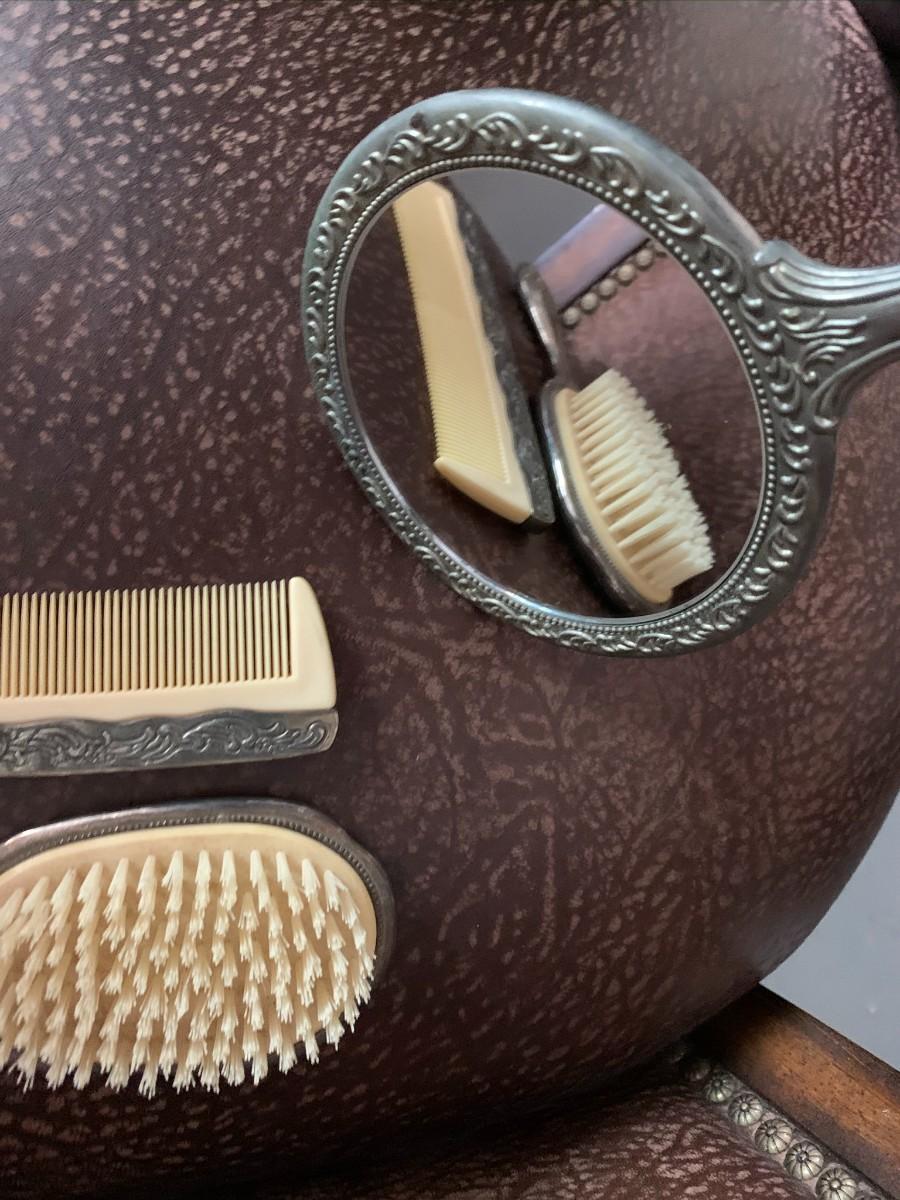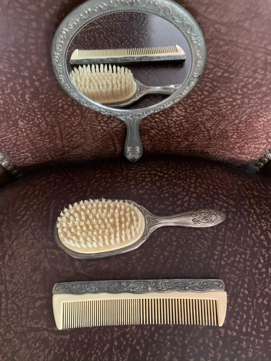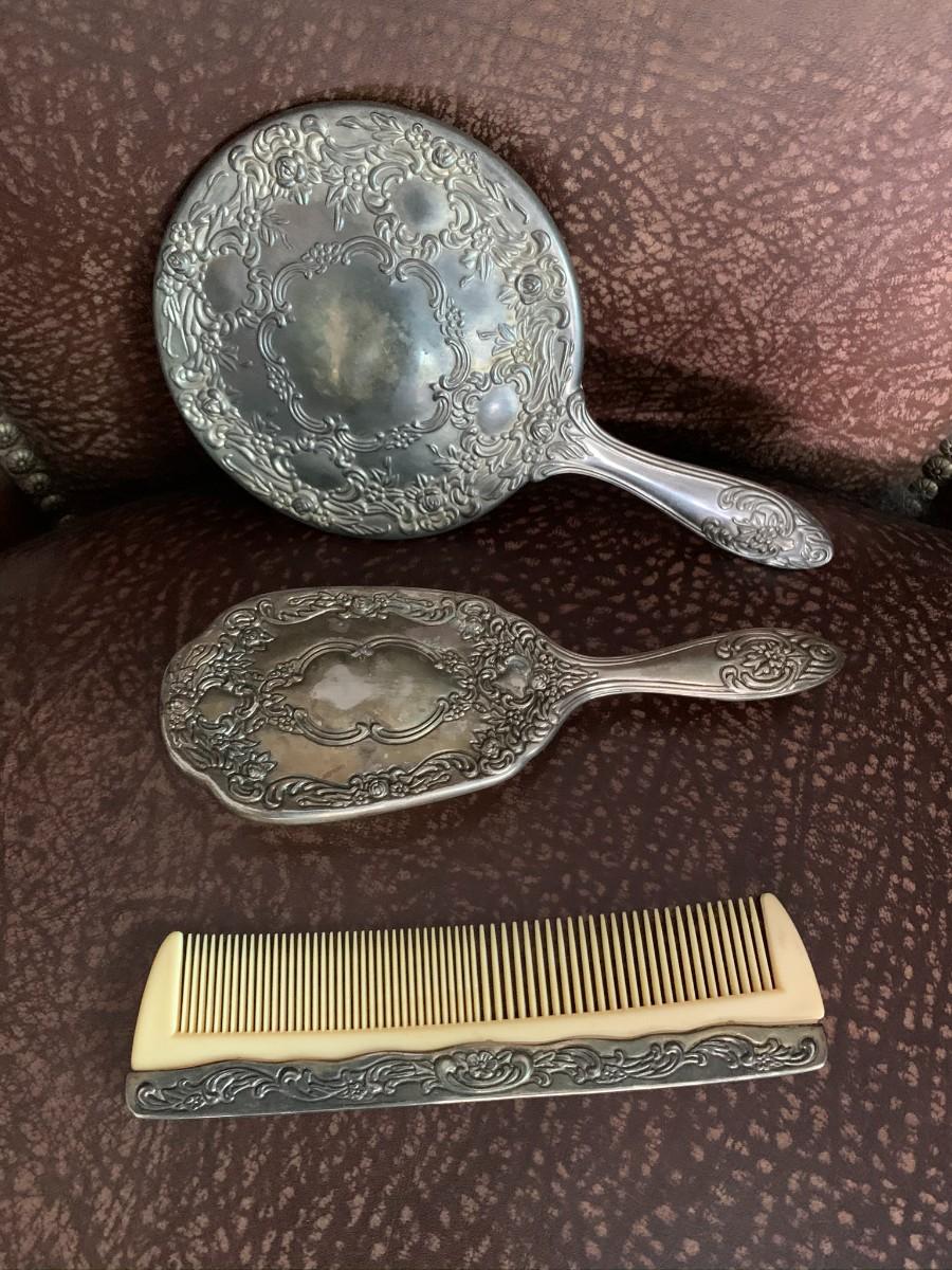Vintage Ornate Silver Plated 3 Piece Comb Brush Mirror Vanity Dresser Set