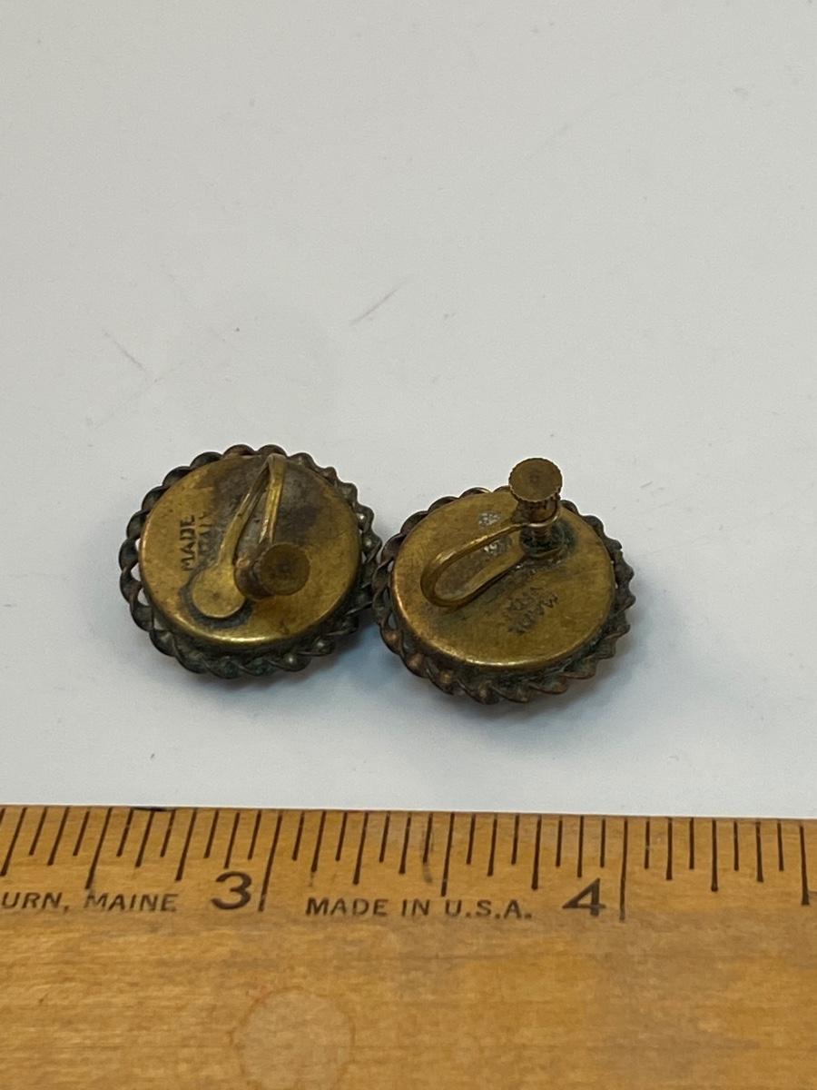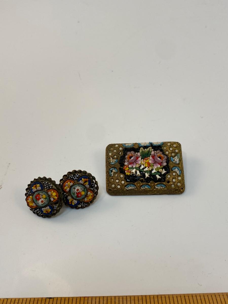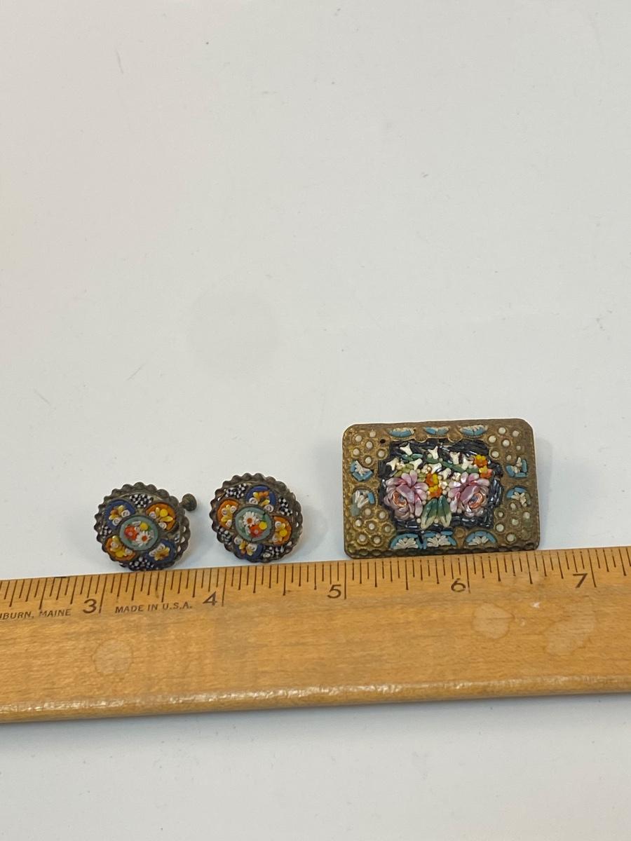 Vintage Ornate Stone Mosaic Inlaid Flower Button Earrings & Pin Made in Italy. Highly detailed ornate stone inlaid pieces. Made in Italy. Screw back earrings. The pin is missing one stone dot, see photo.