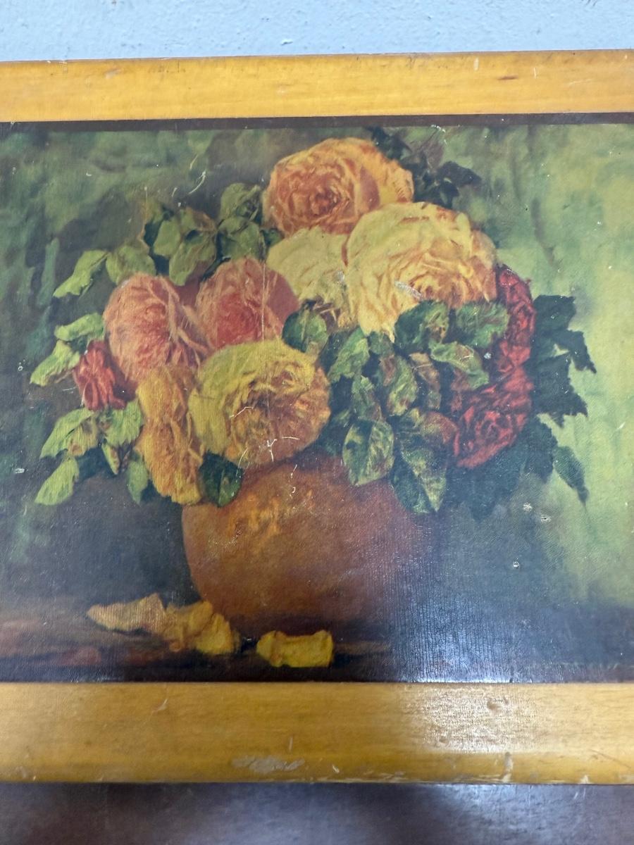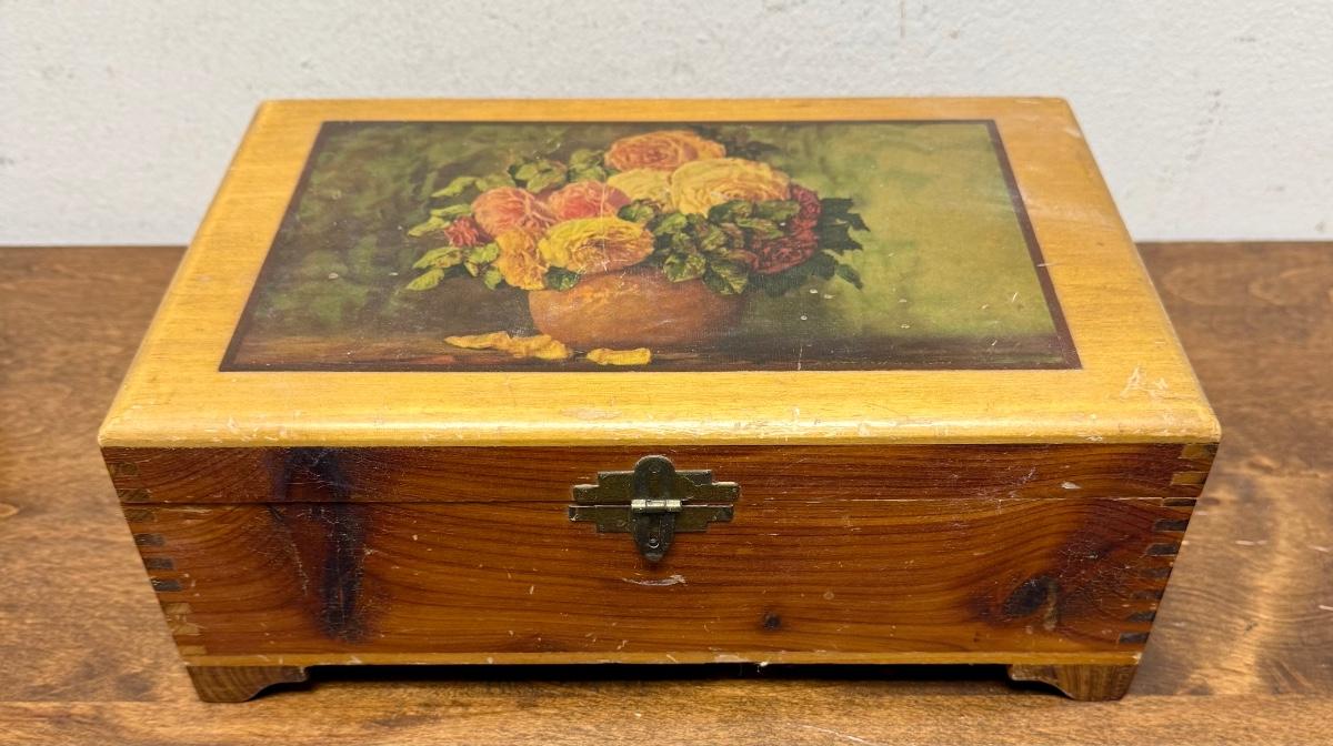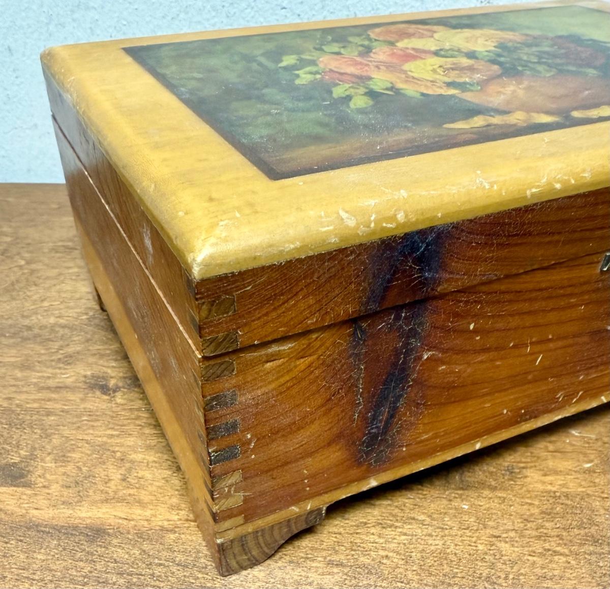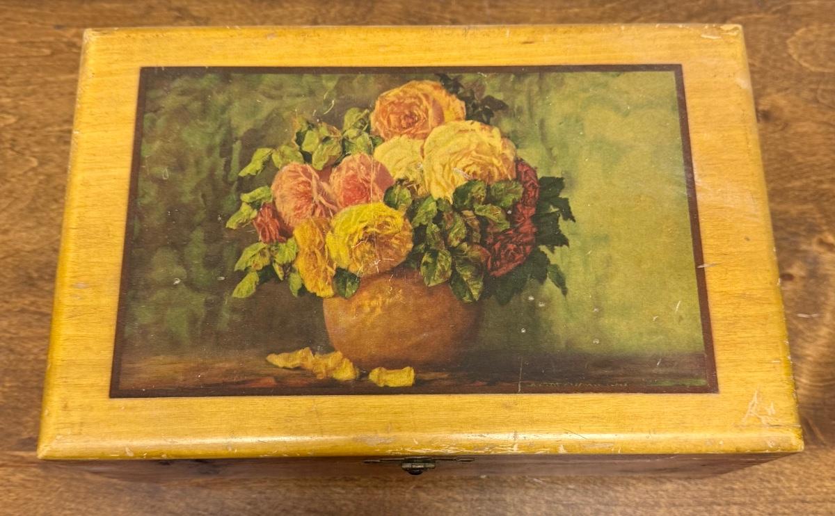 Dovetail construction. Flower basket still-life image on the lid. In good condition.