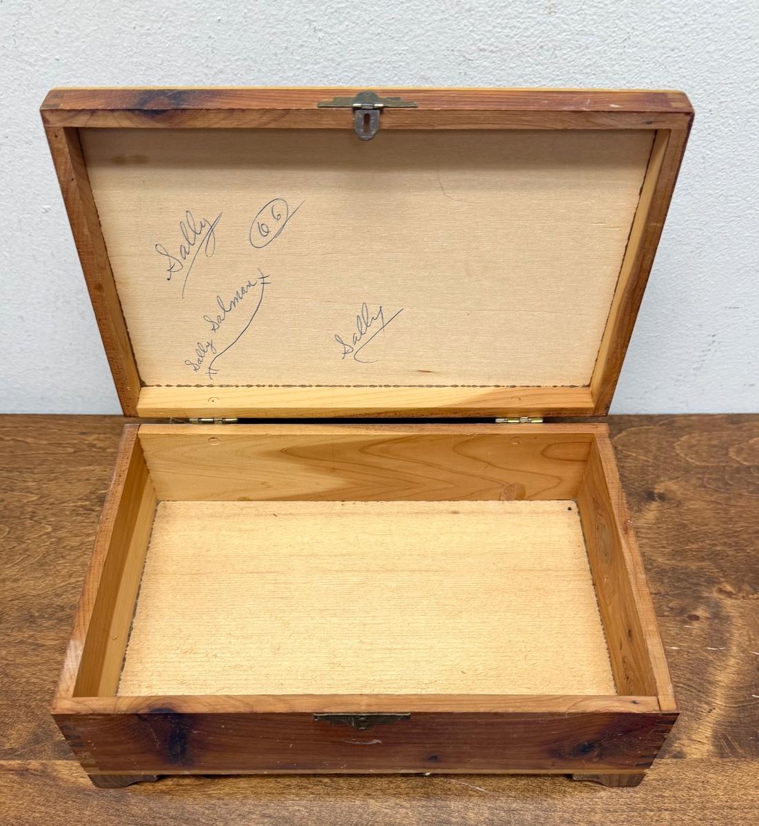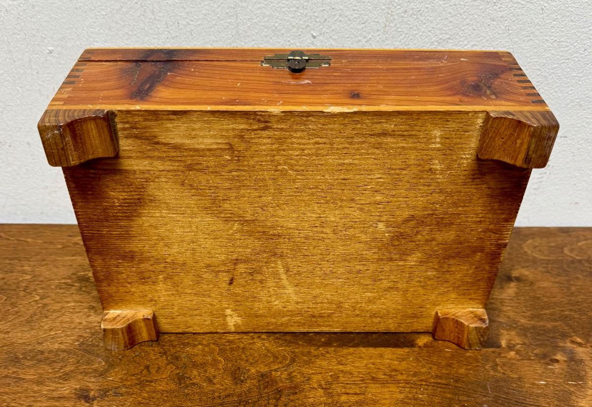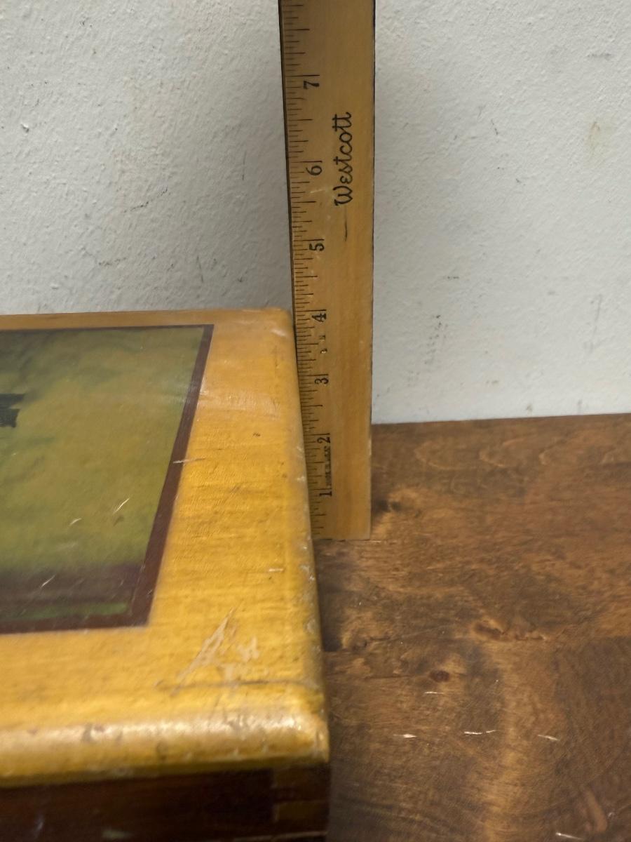 Dovetail construction. Flower basket still-life image on the lid. In good condition.