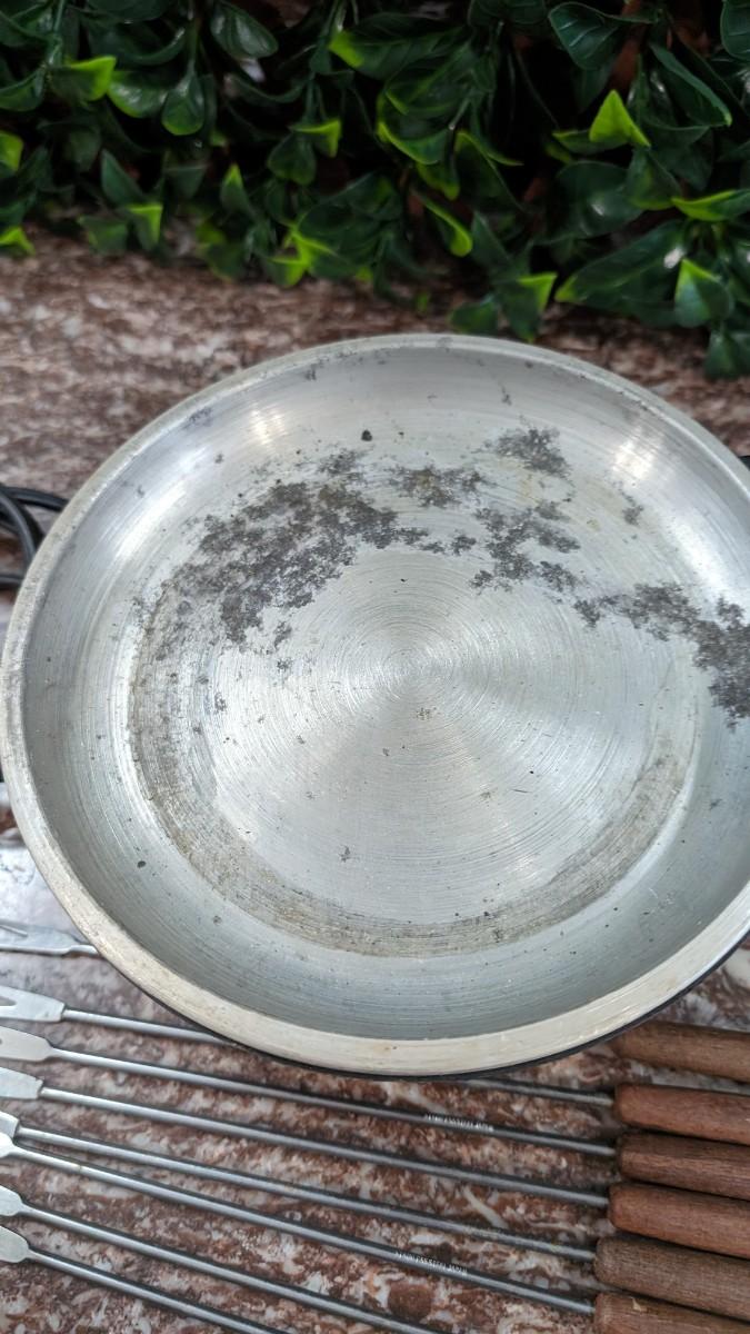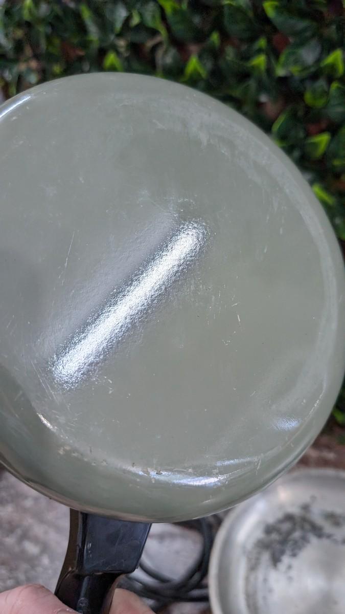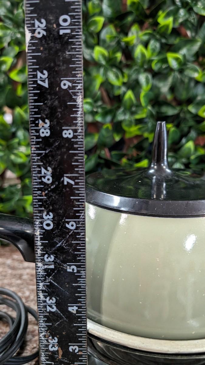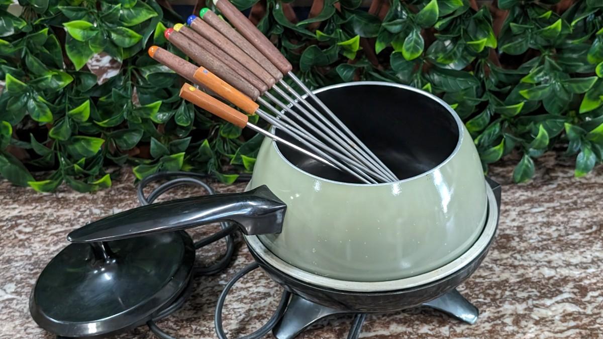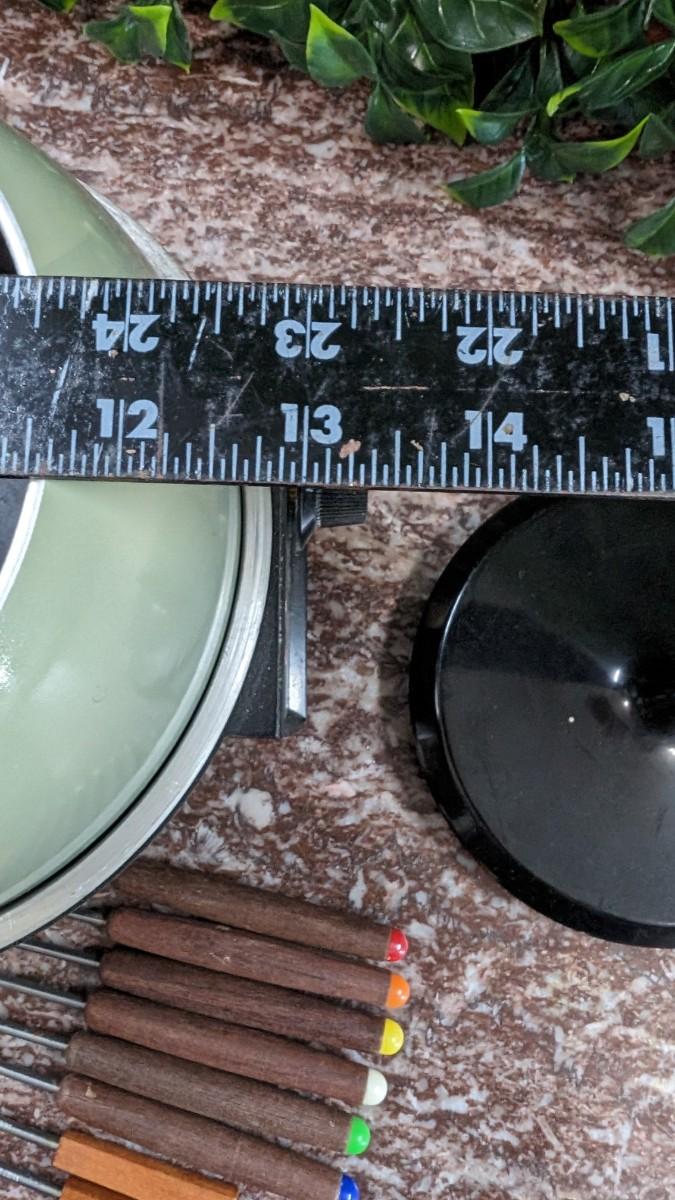 This is a nice Vintage Oster Electric Fondue Pot Appliance Green with Black Lid and Forks. The inside has some scratches.