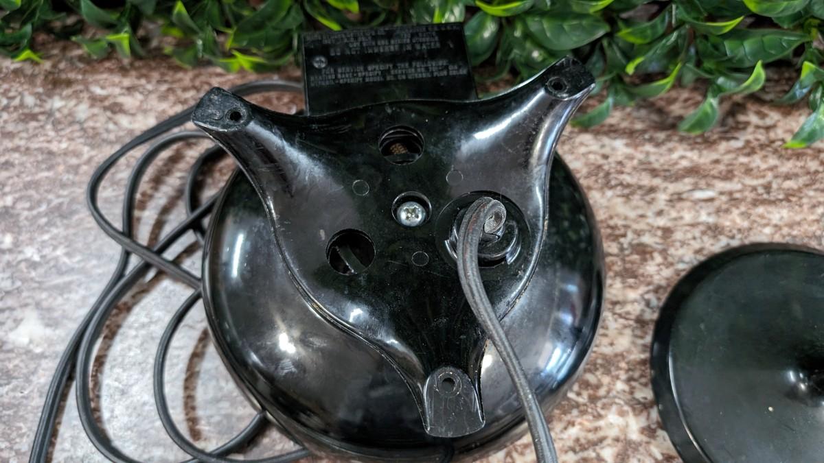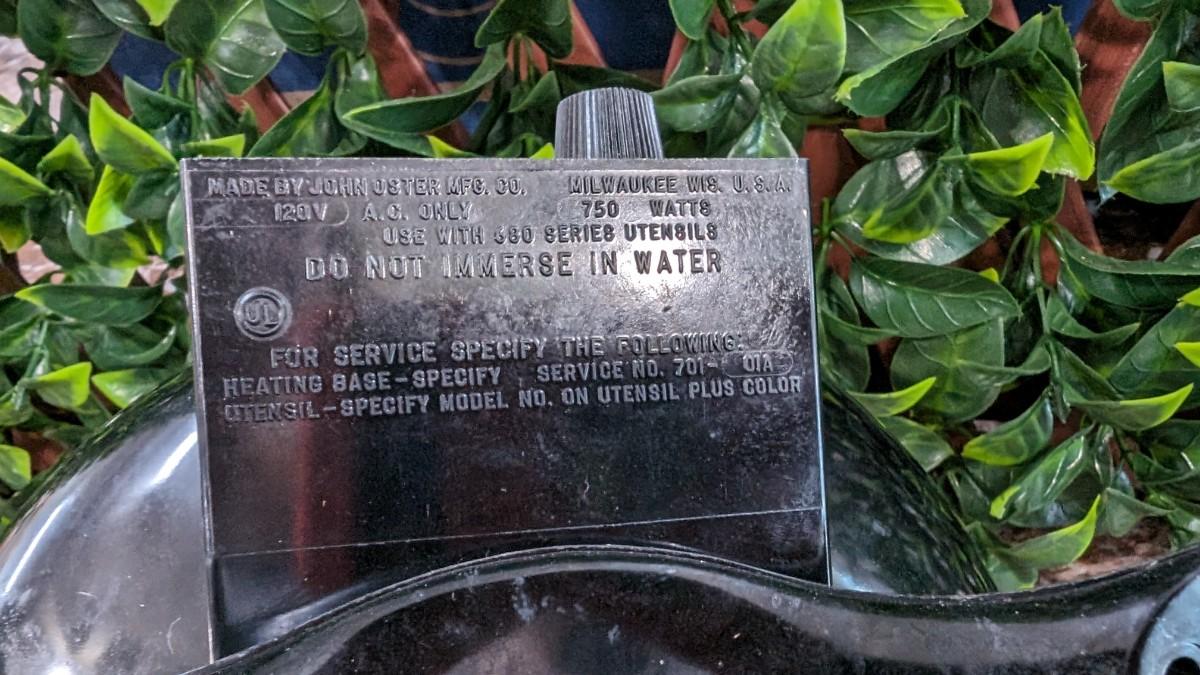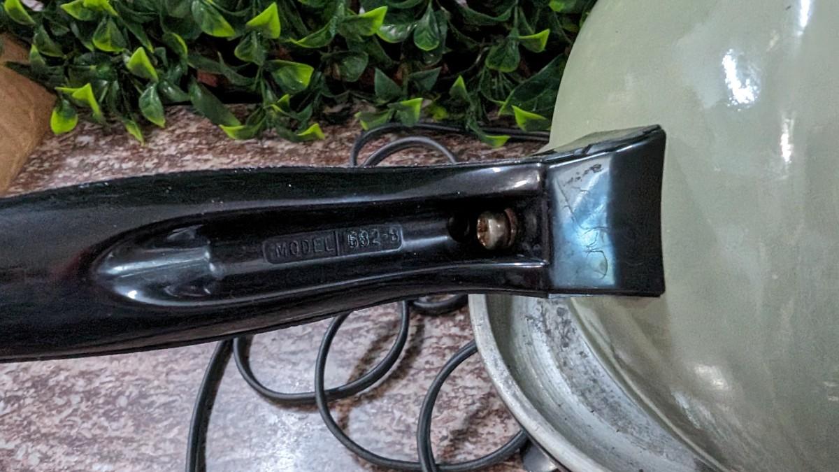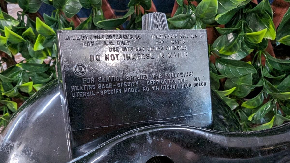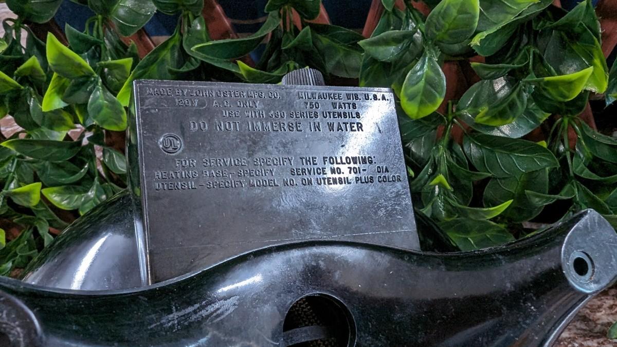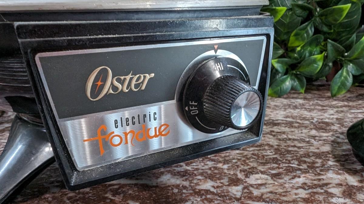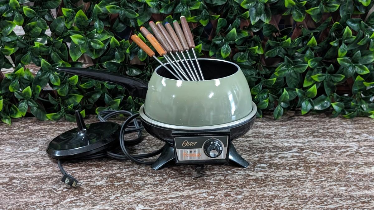 Vintage Oster Electric Fondue Pot ApplianceGreen with Black Lid and Forks Scratched Inside