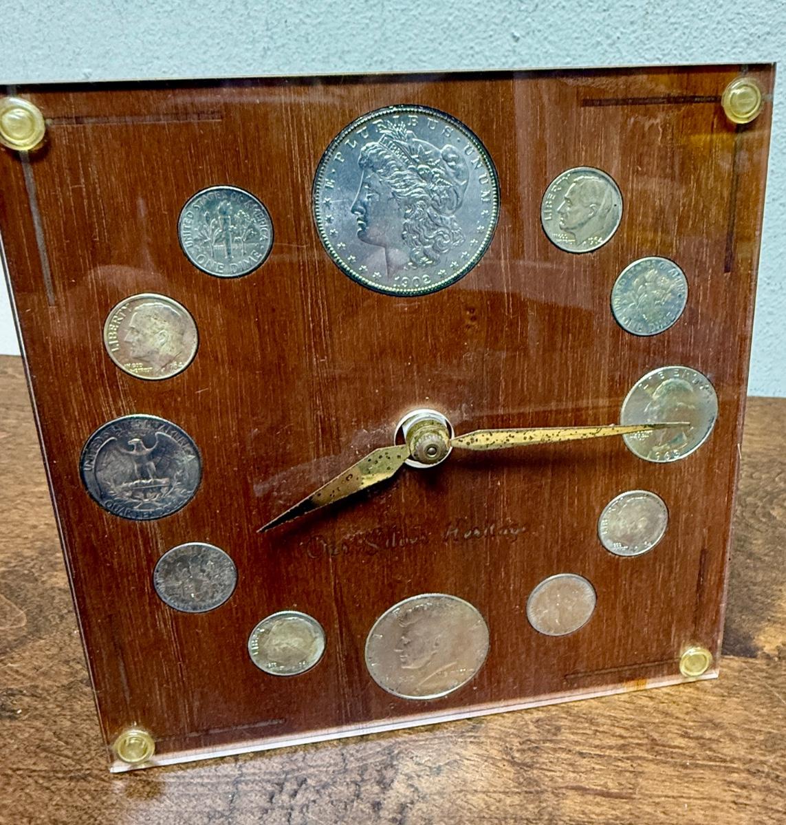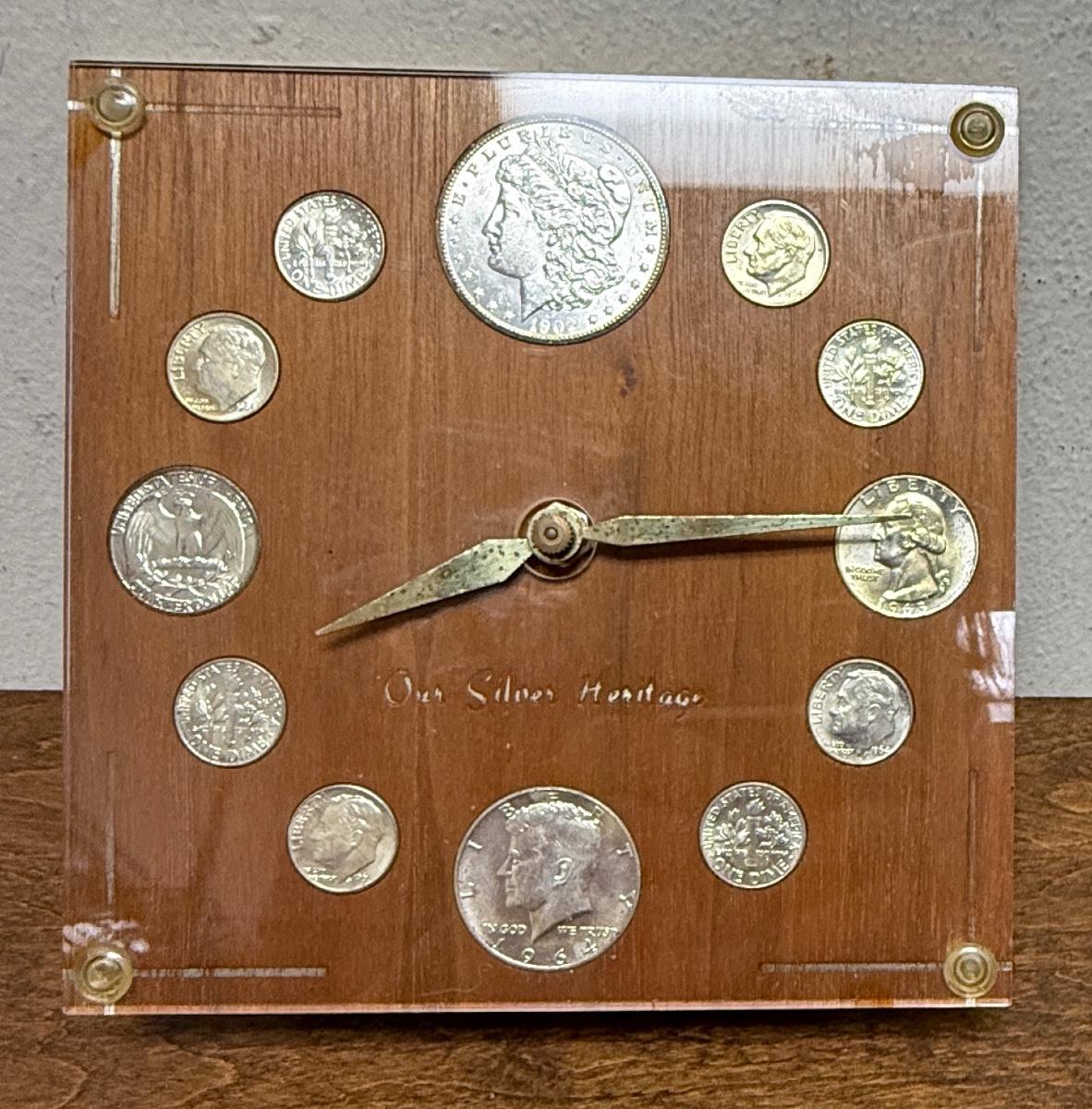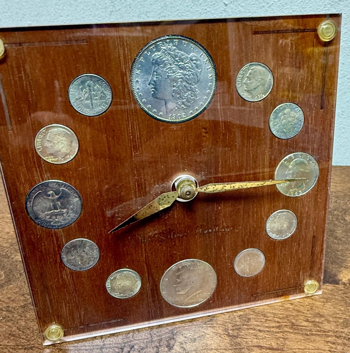 Vintage Our Silver Heritage Clock 1964 Silver Coins Morgan Dollar