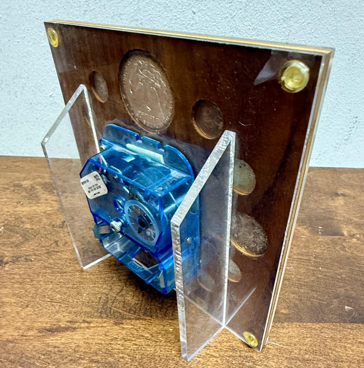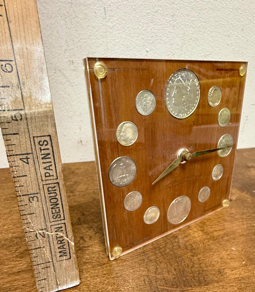 6" x 6" Clock in good condition. Includes dimes, quarters, half dollar and 1903 Morgan Head Dollar.