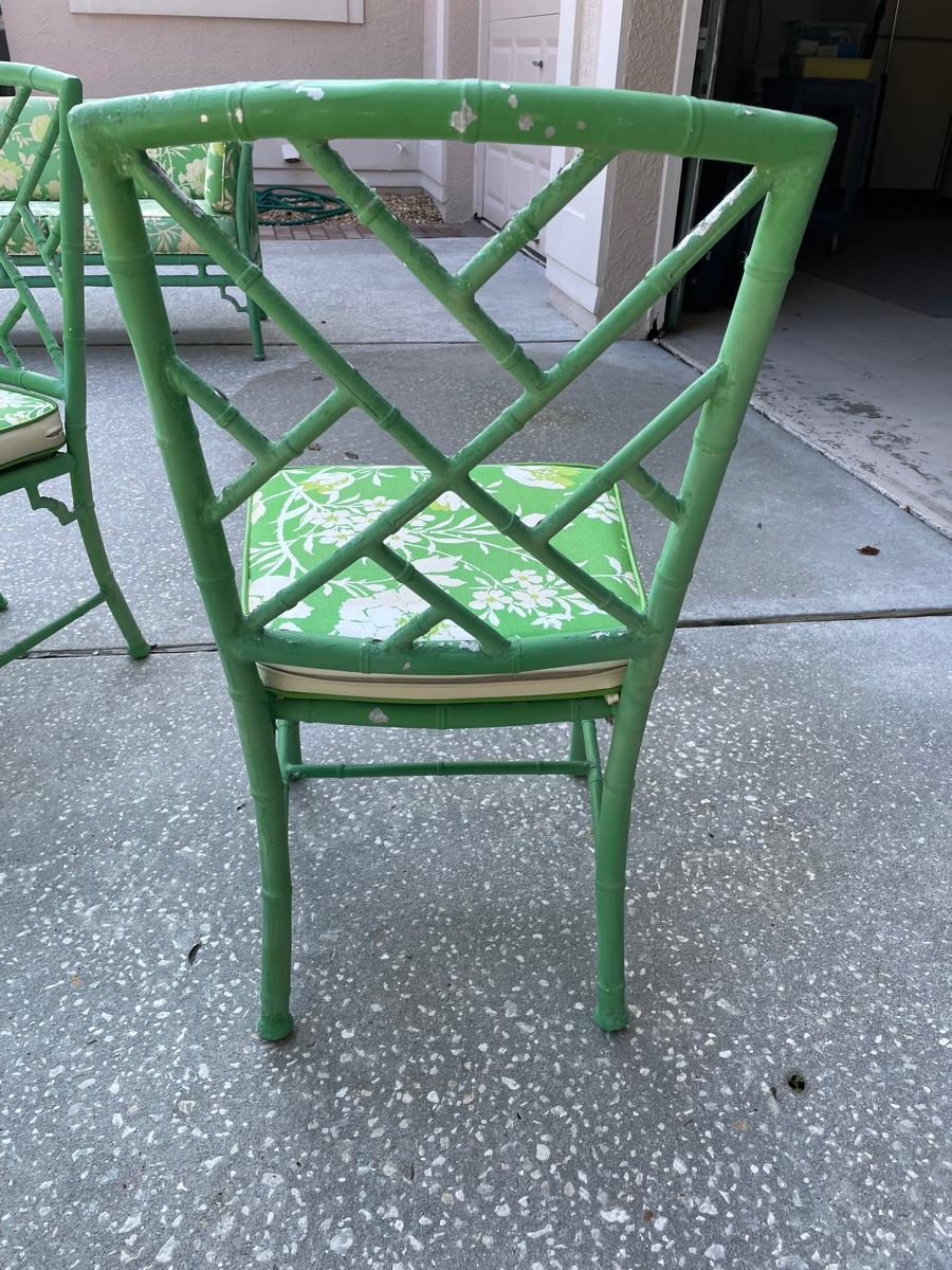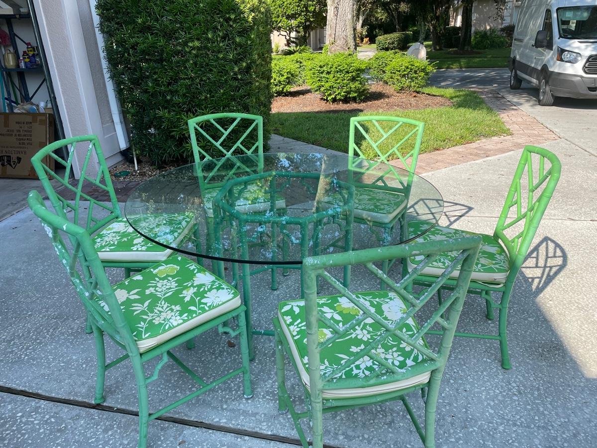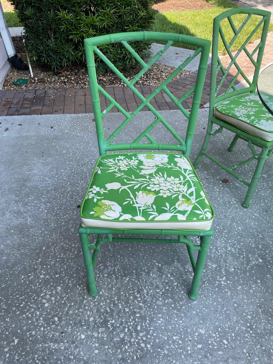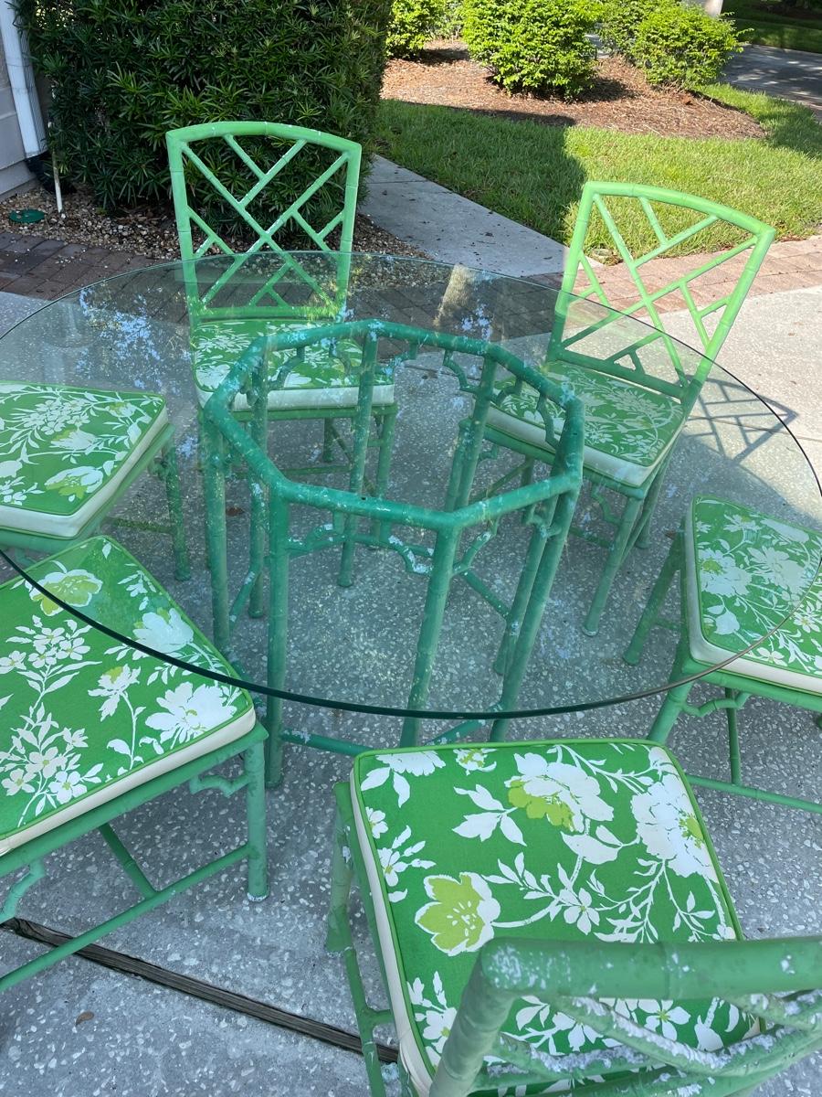 Glass top on a coated aluminum table base and 6 chairs with cushions The diagonal bamboo pattern gives it an Asian look. The finish needs refinishing but the cushions are in great condition