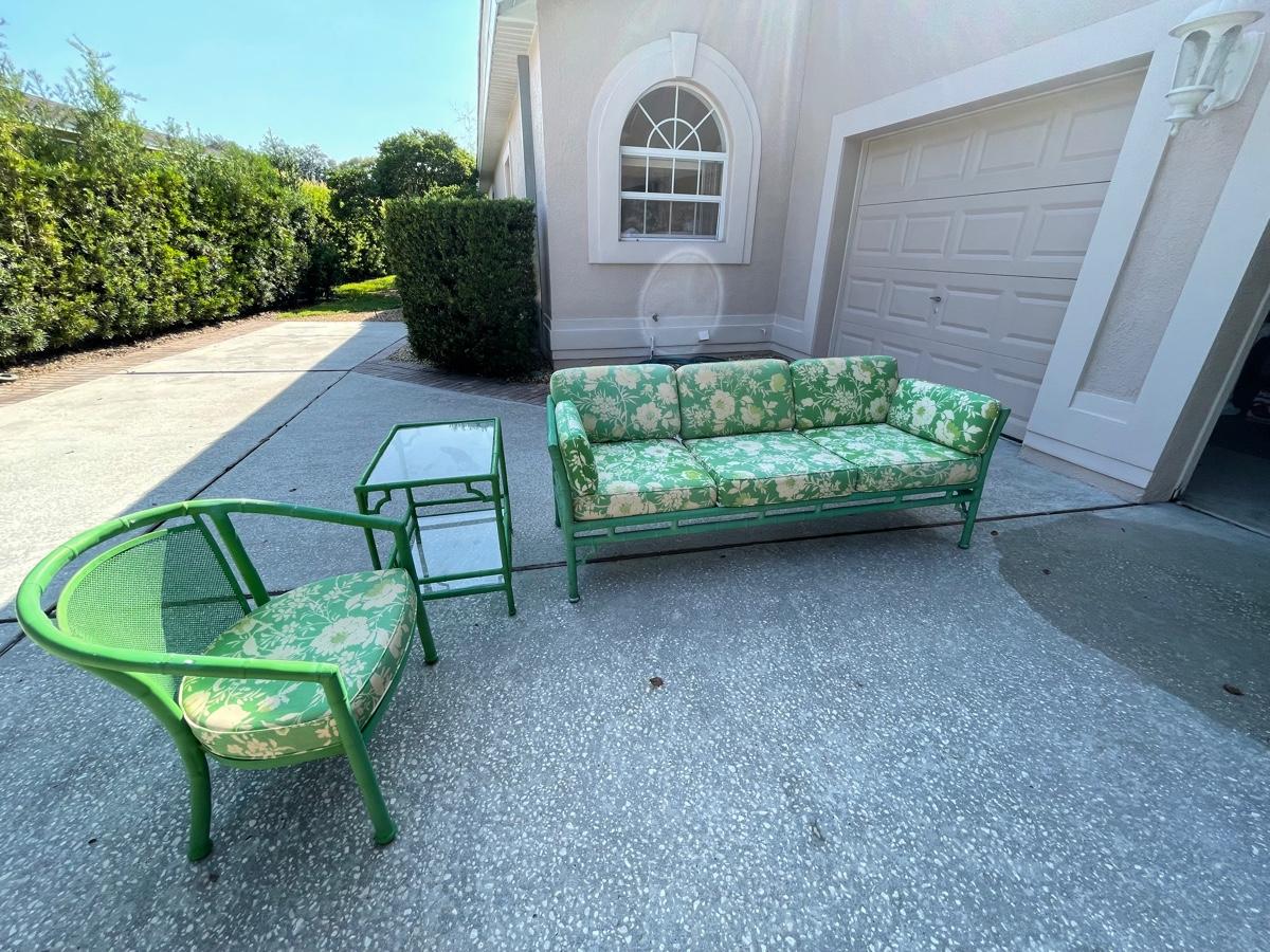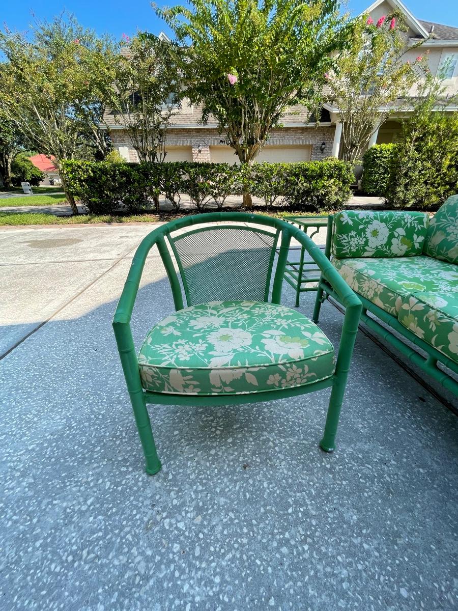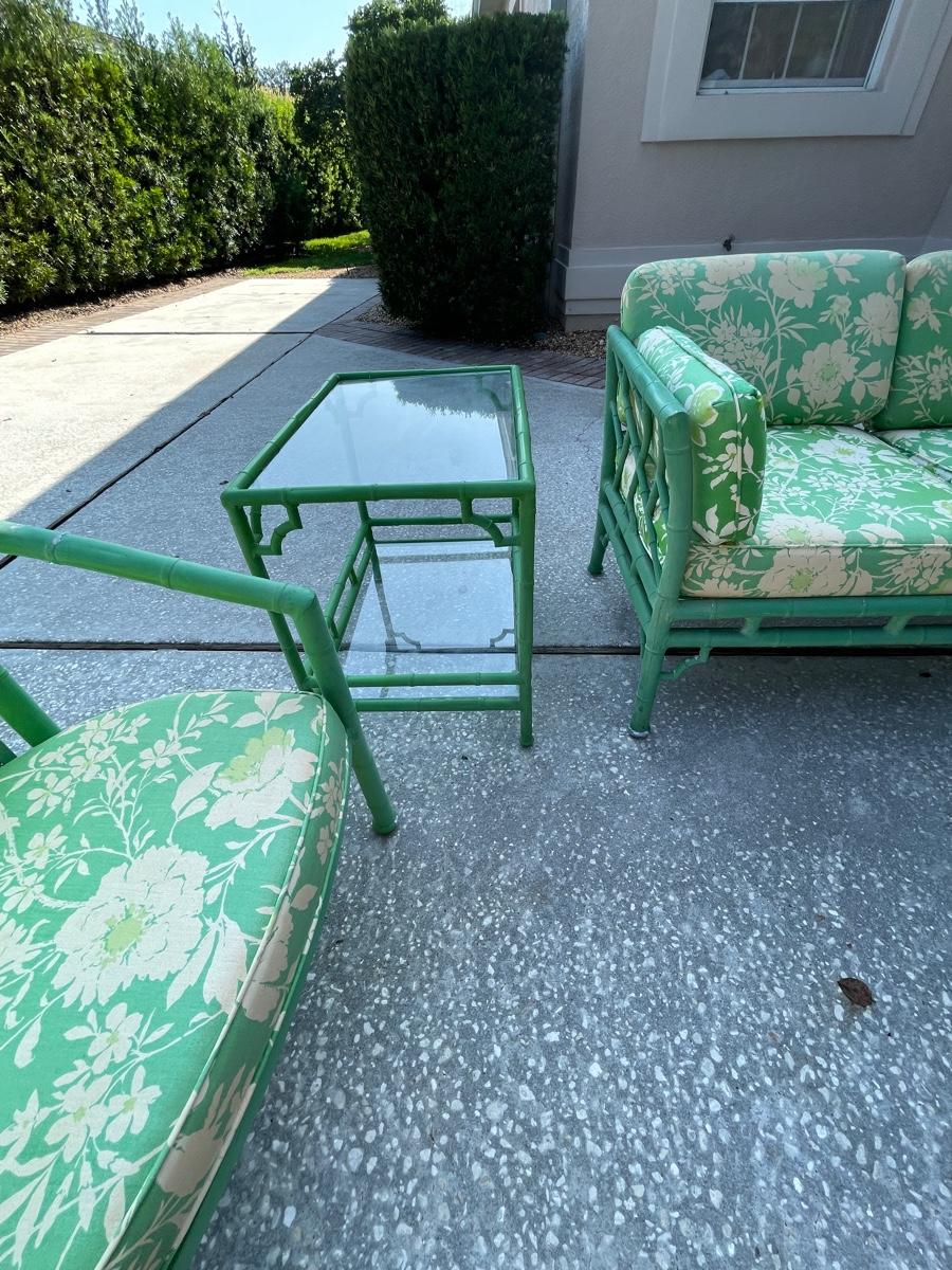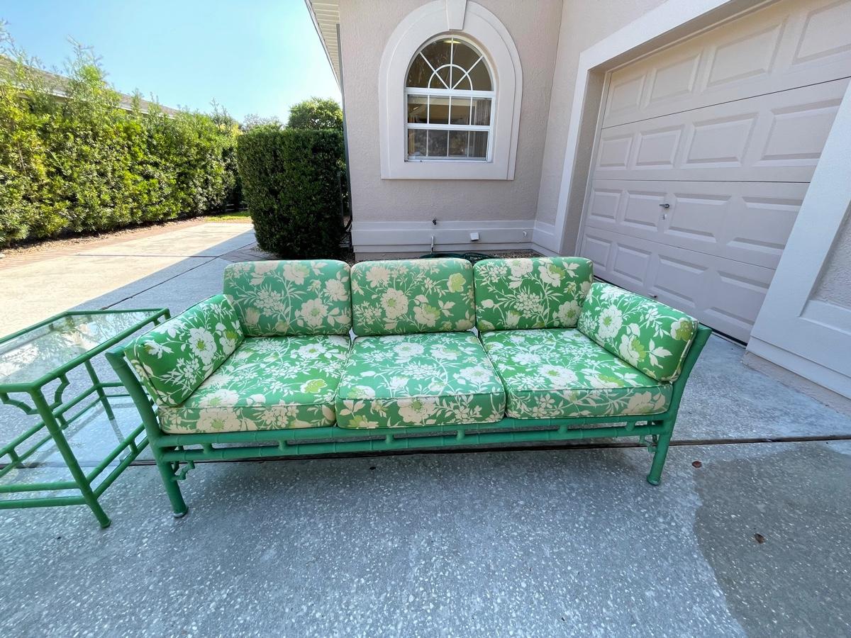 Six cushion outdoor sofa and side chair with an end table have a coated aluminum base with fabric cushions. The metal needs refinishing but the cushions are good