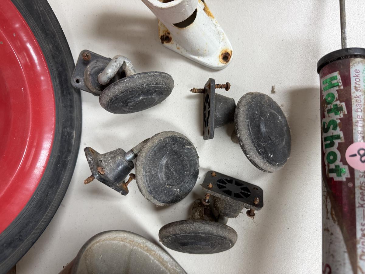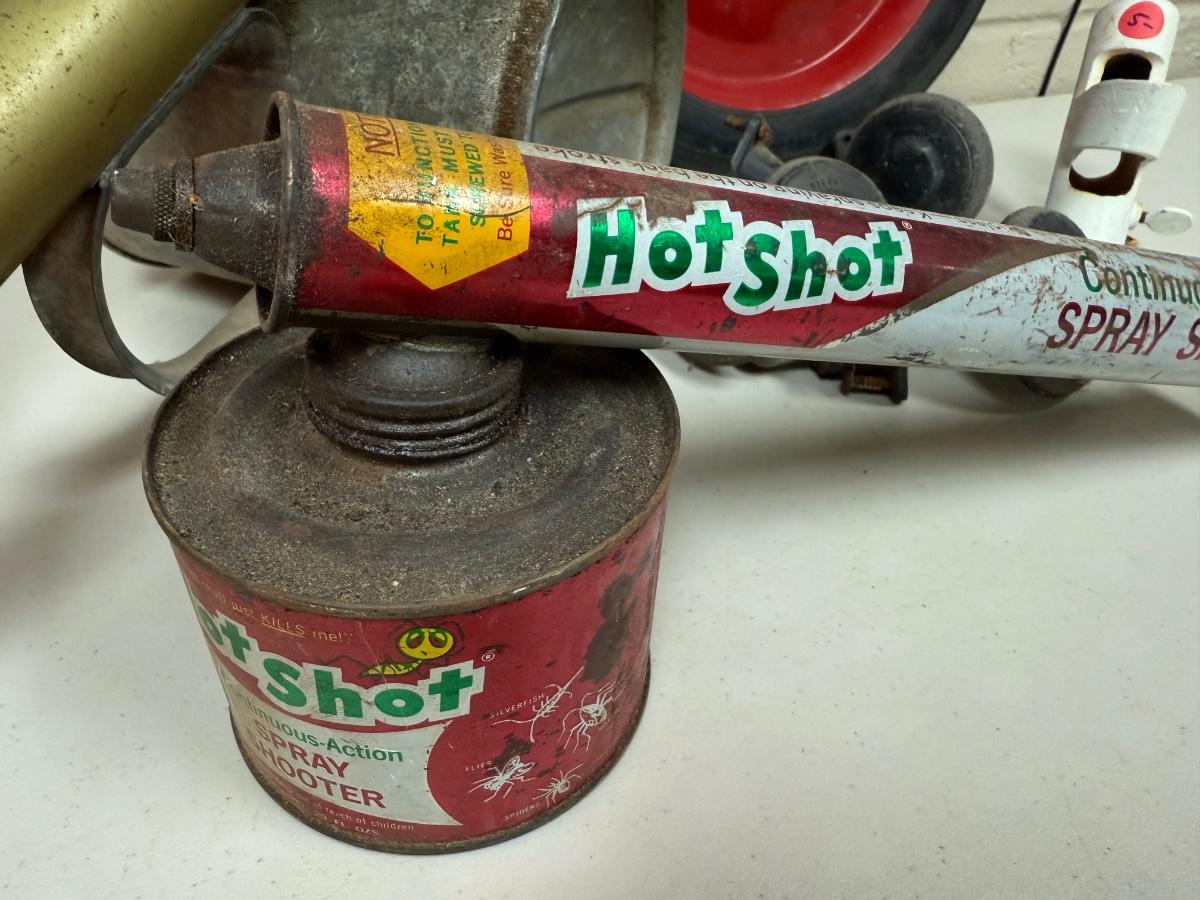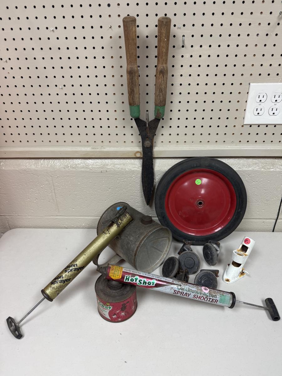 Hot Shot & Hudson bug sprayer, wheels for cart, flag holder, wheelbarrow tire, hedge clippers