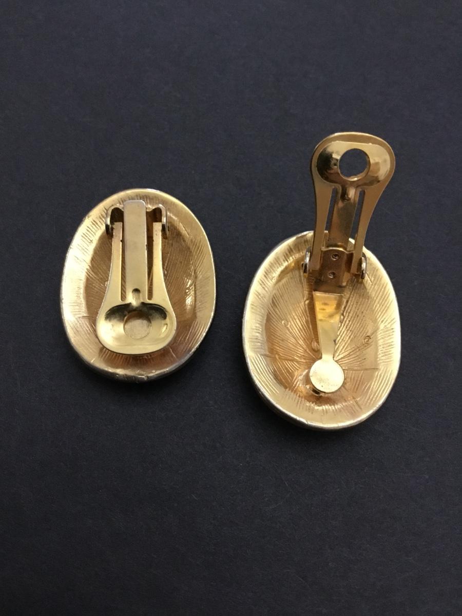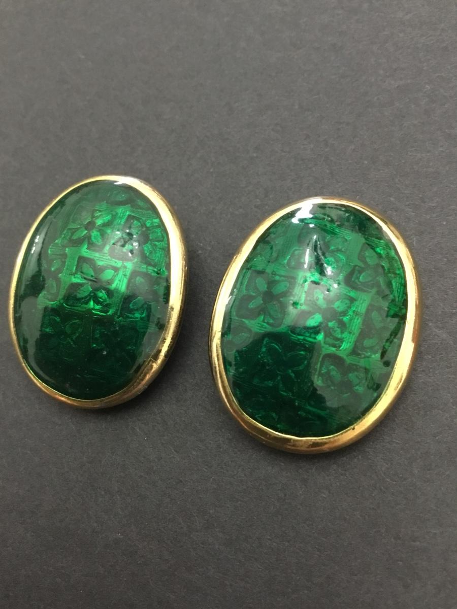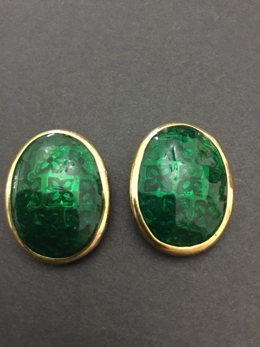 Vintage, oval, gold town, heavy metal green enamel clip on earrings