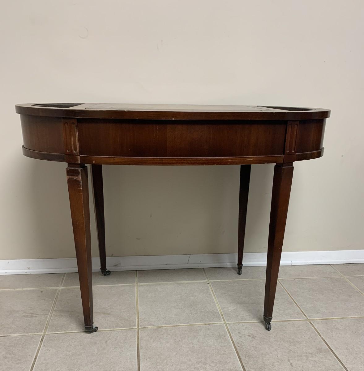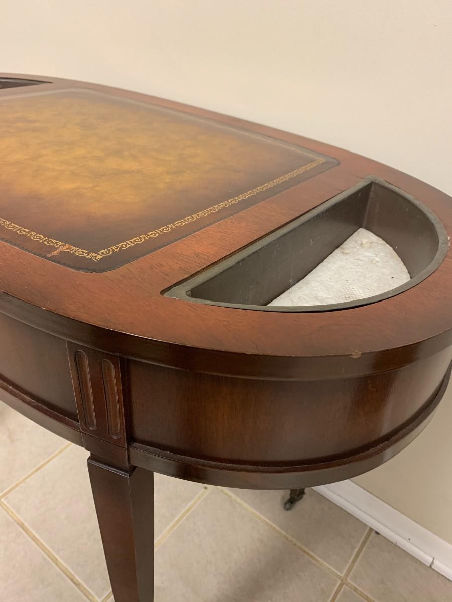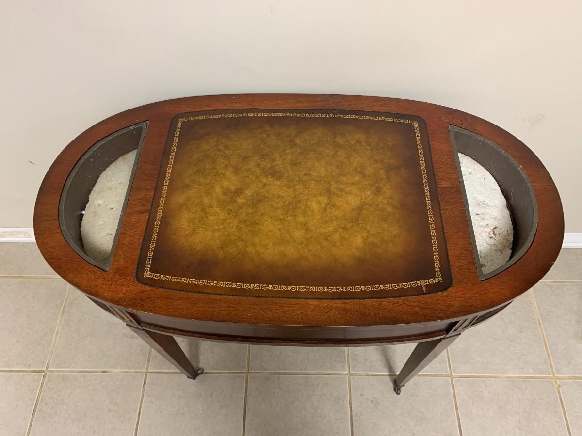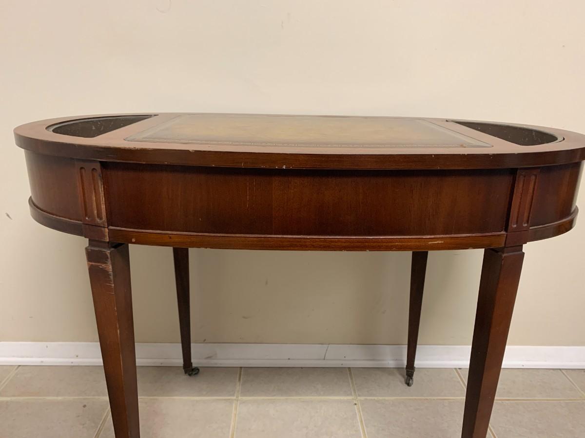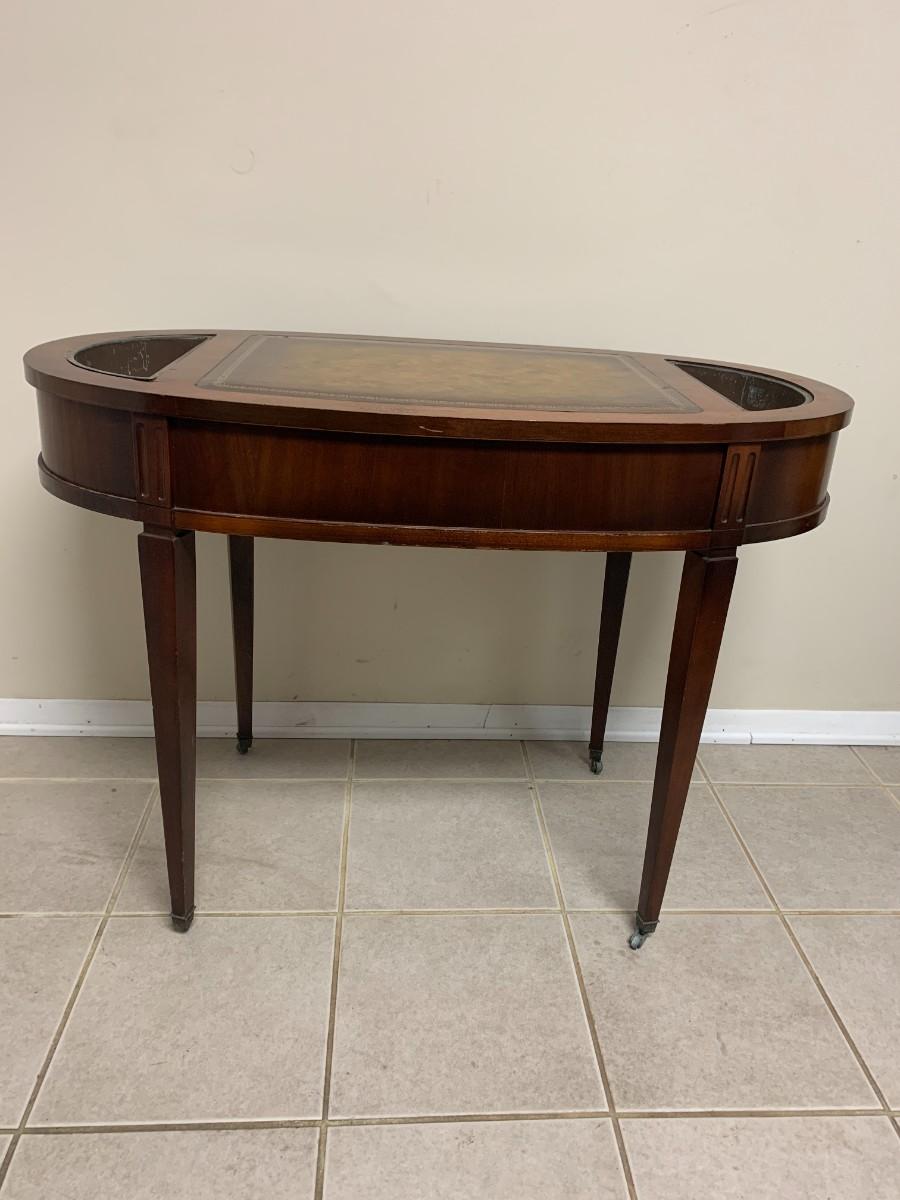 Vintage oval leather top accent table with planters on either end. Very good condition with signs of wear consistent with age and use. 38" wide x 20" deep x 27 1/4" high.