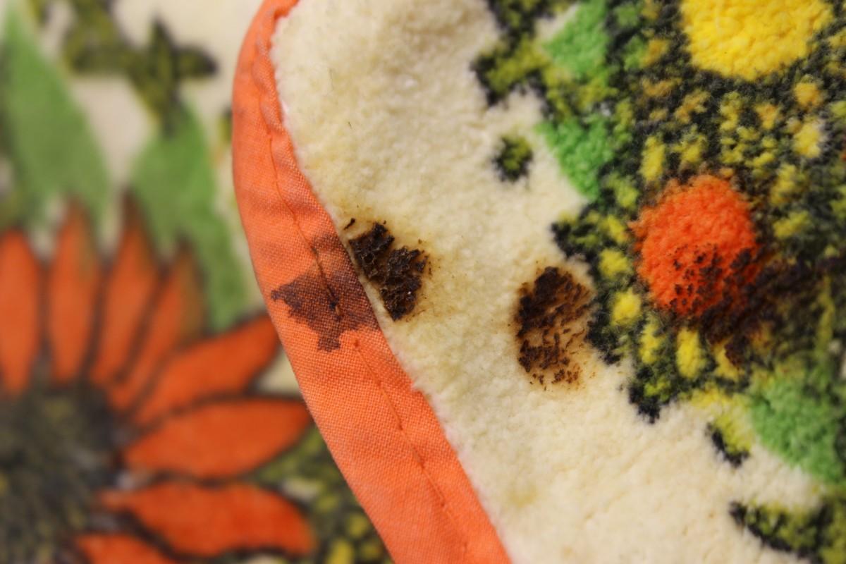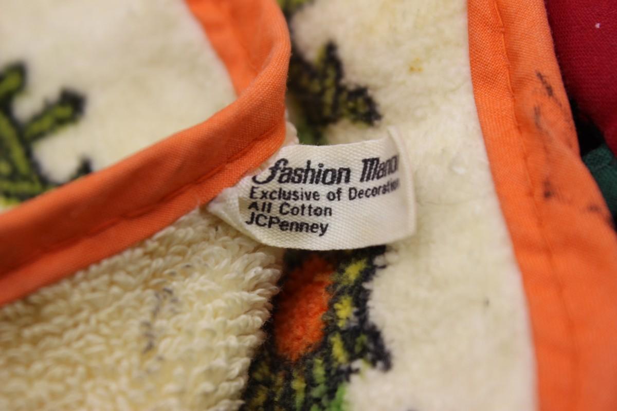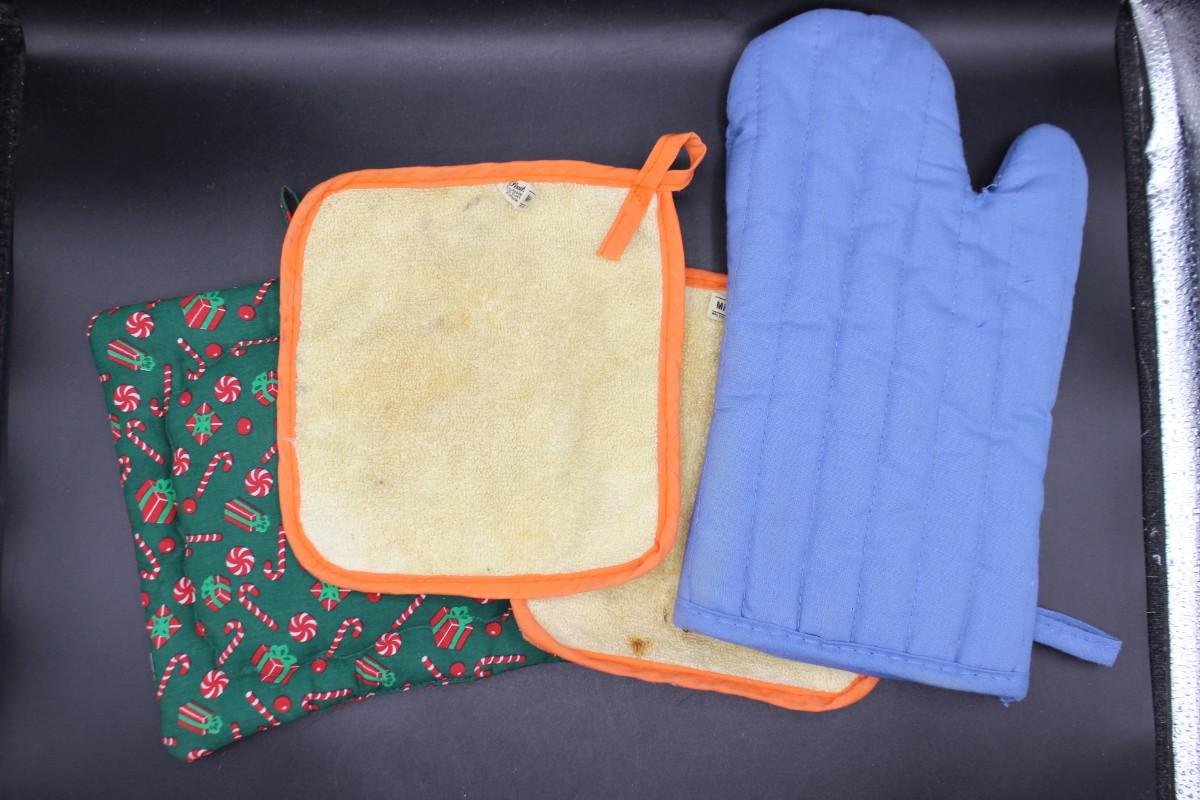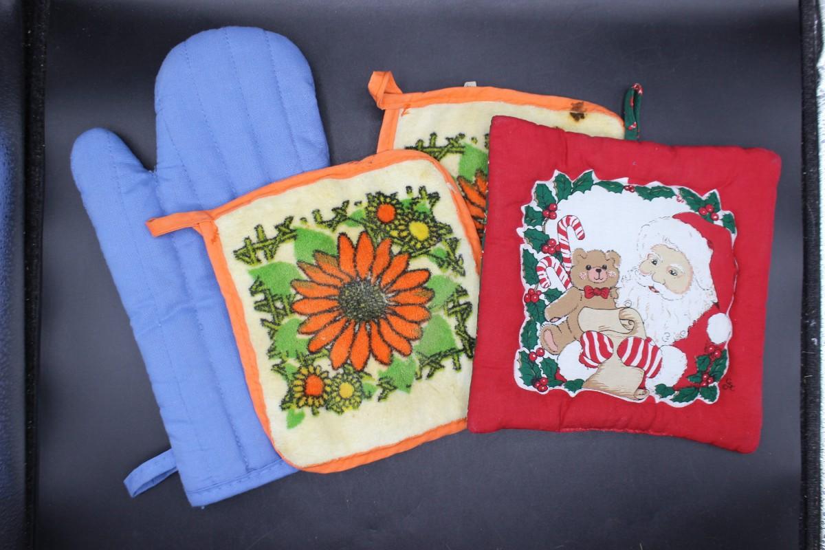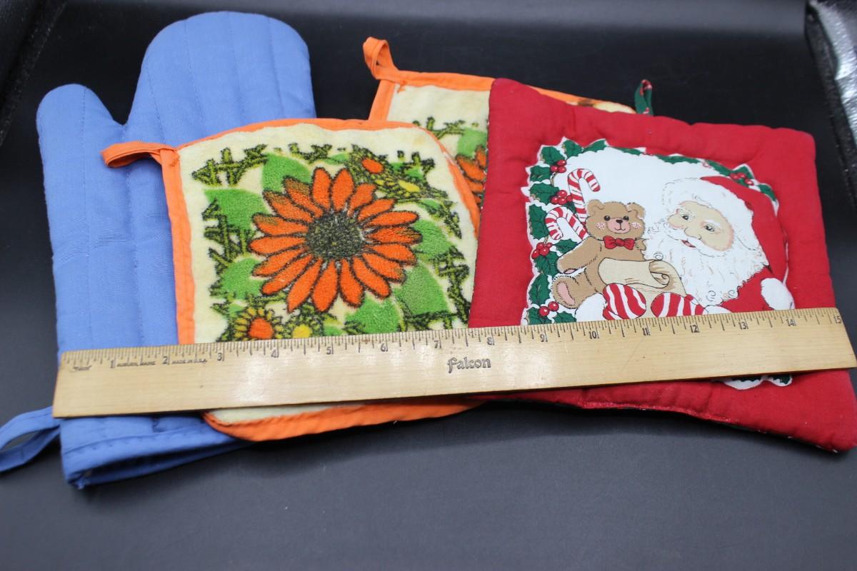 Set of 4 potholders and oven mitt. Previously owned and used. May have spots or discolor.