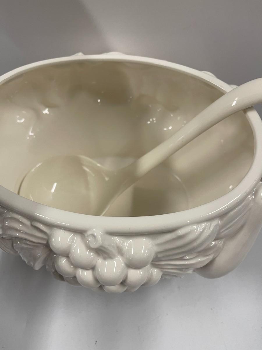 Vintage Over and Back soup tureen with ladel, white. All in very good condition. Measures Approx 12" from handle to handle. 9 1/2" high to top of finial.