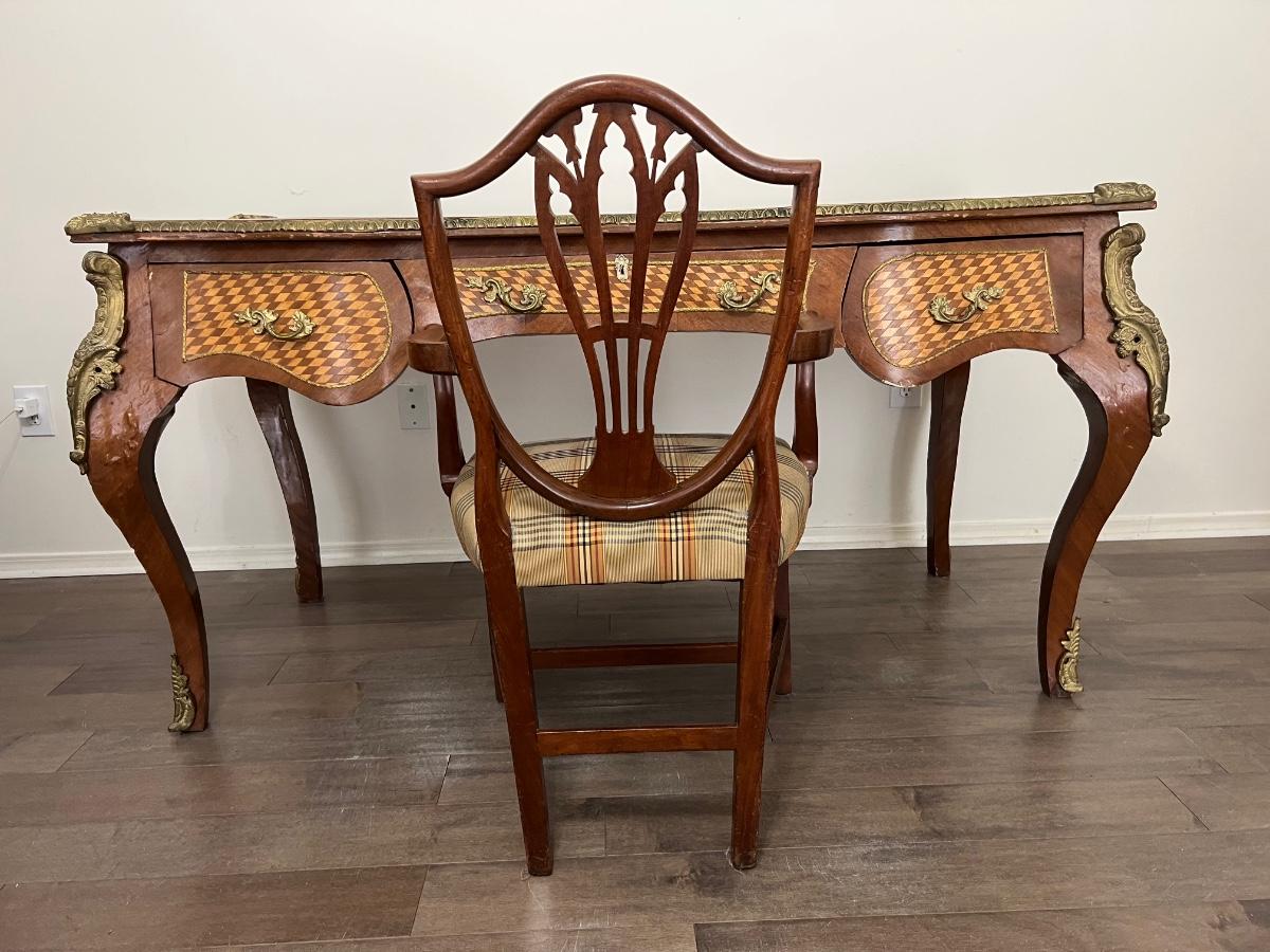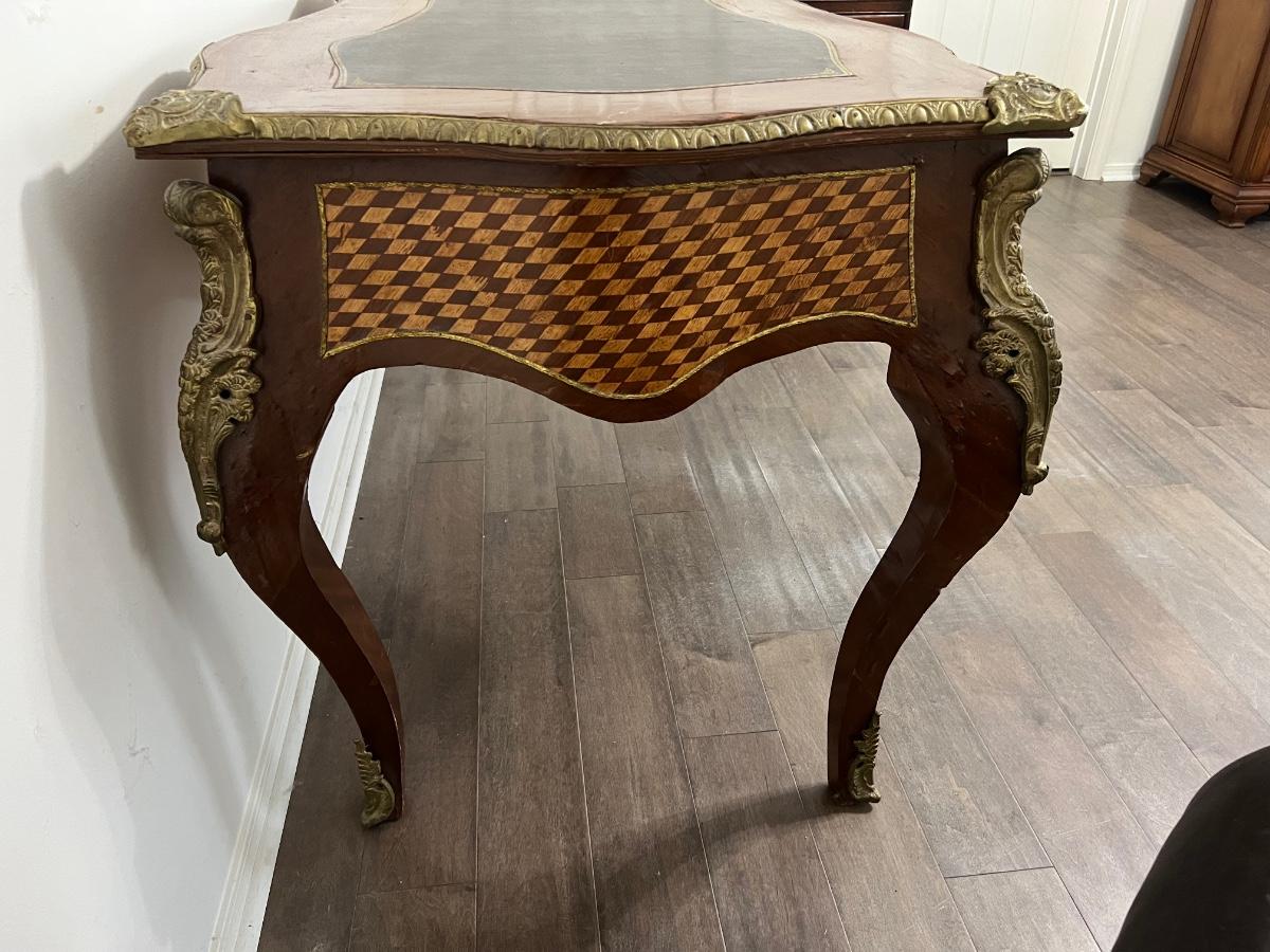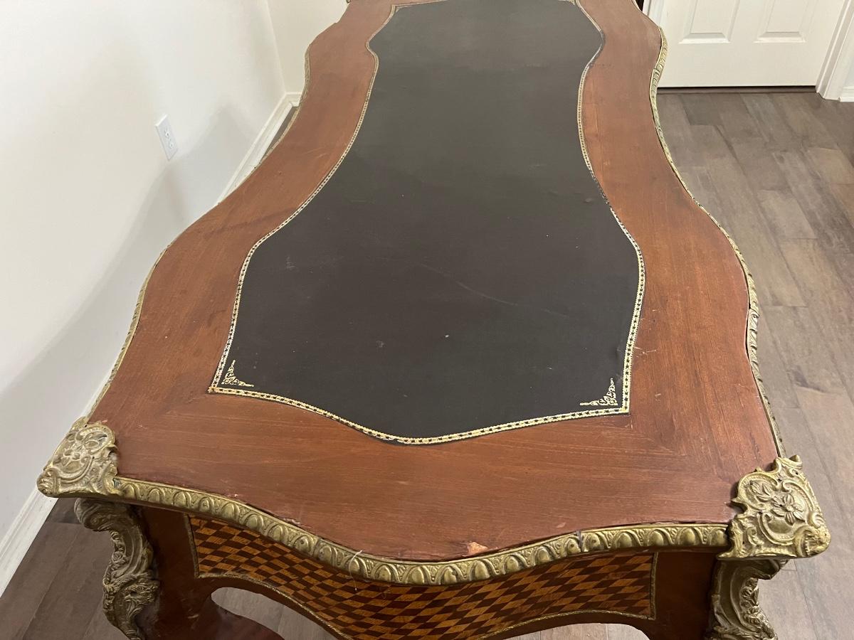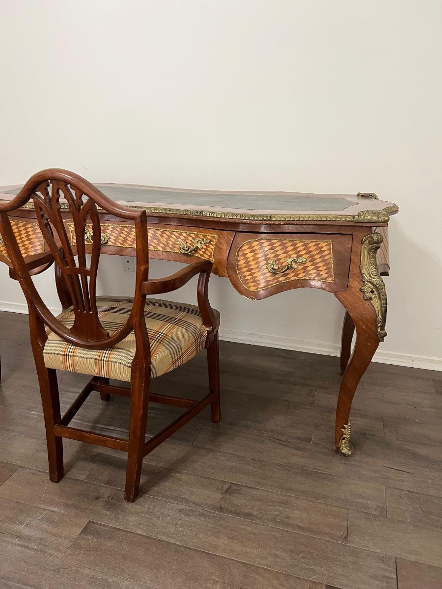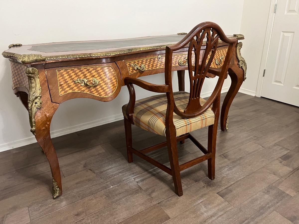 Vintage Oversized Inlaid Wood & Brass Writers Desk &  Chair *Read Details