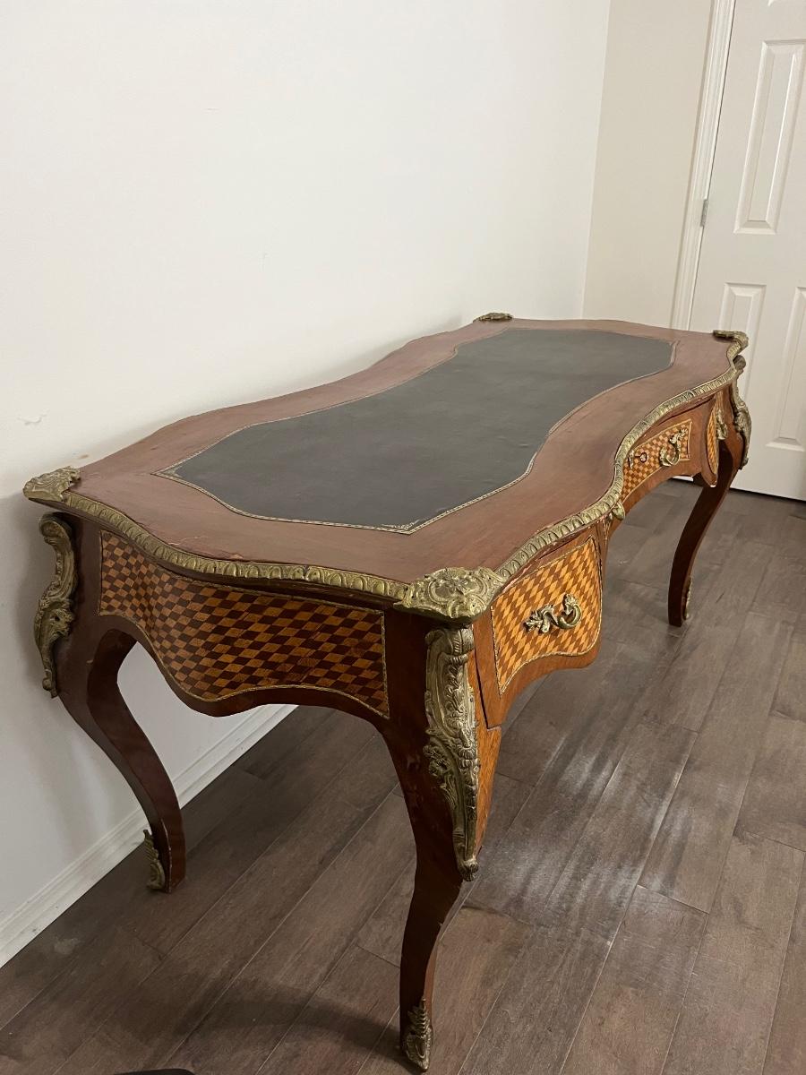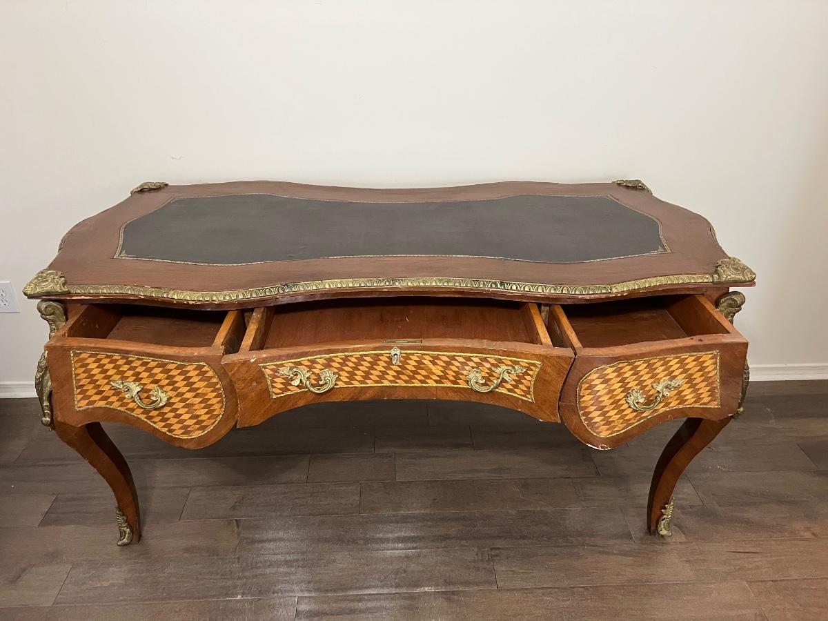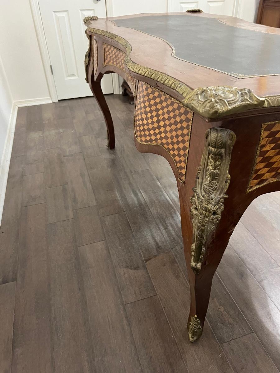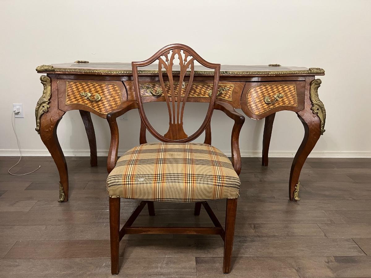 Vintage Oversized Inlaid Wood & Brass Writers Desk &  Chair *Read Details
