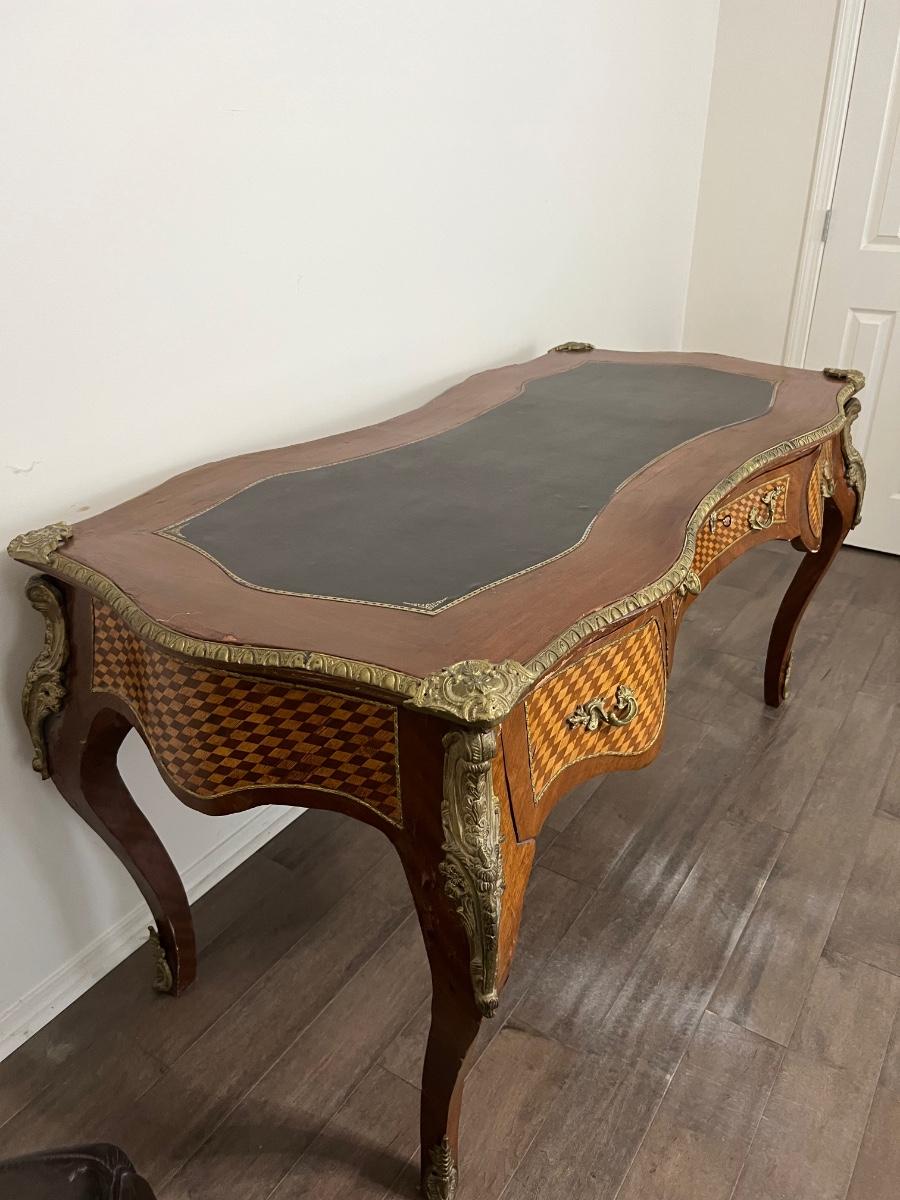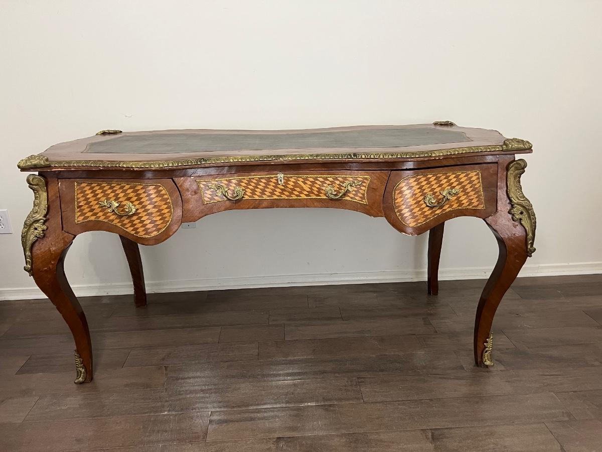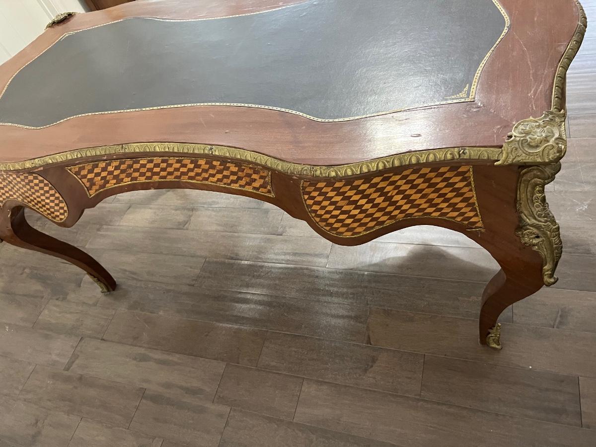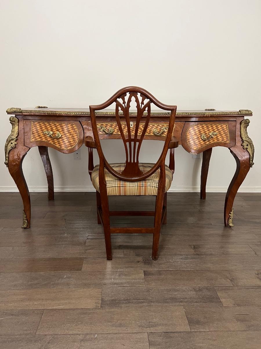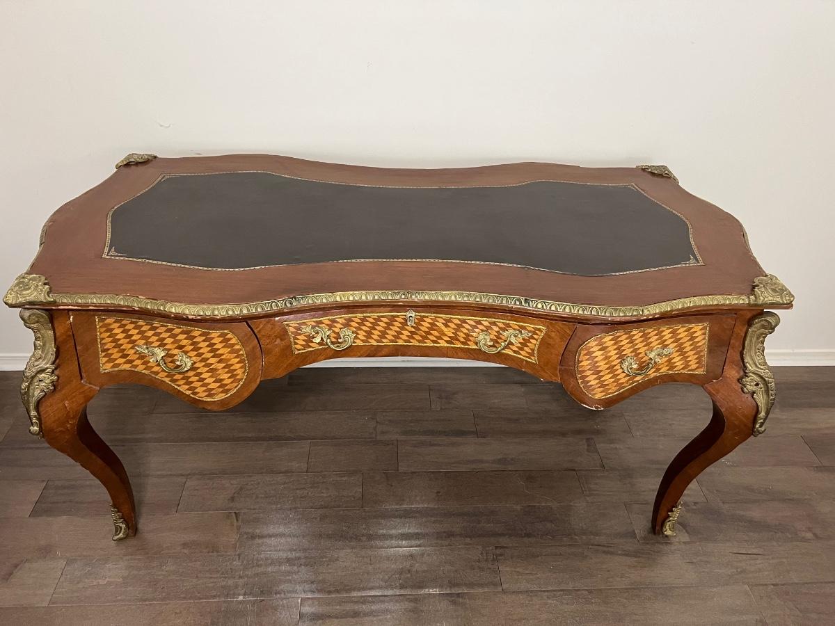 Vintage Oversized Inlaid Wood & Brass Writers Desk &  Chair *Read Details
