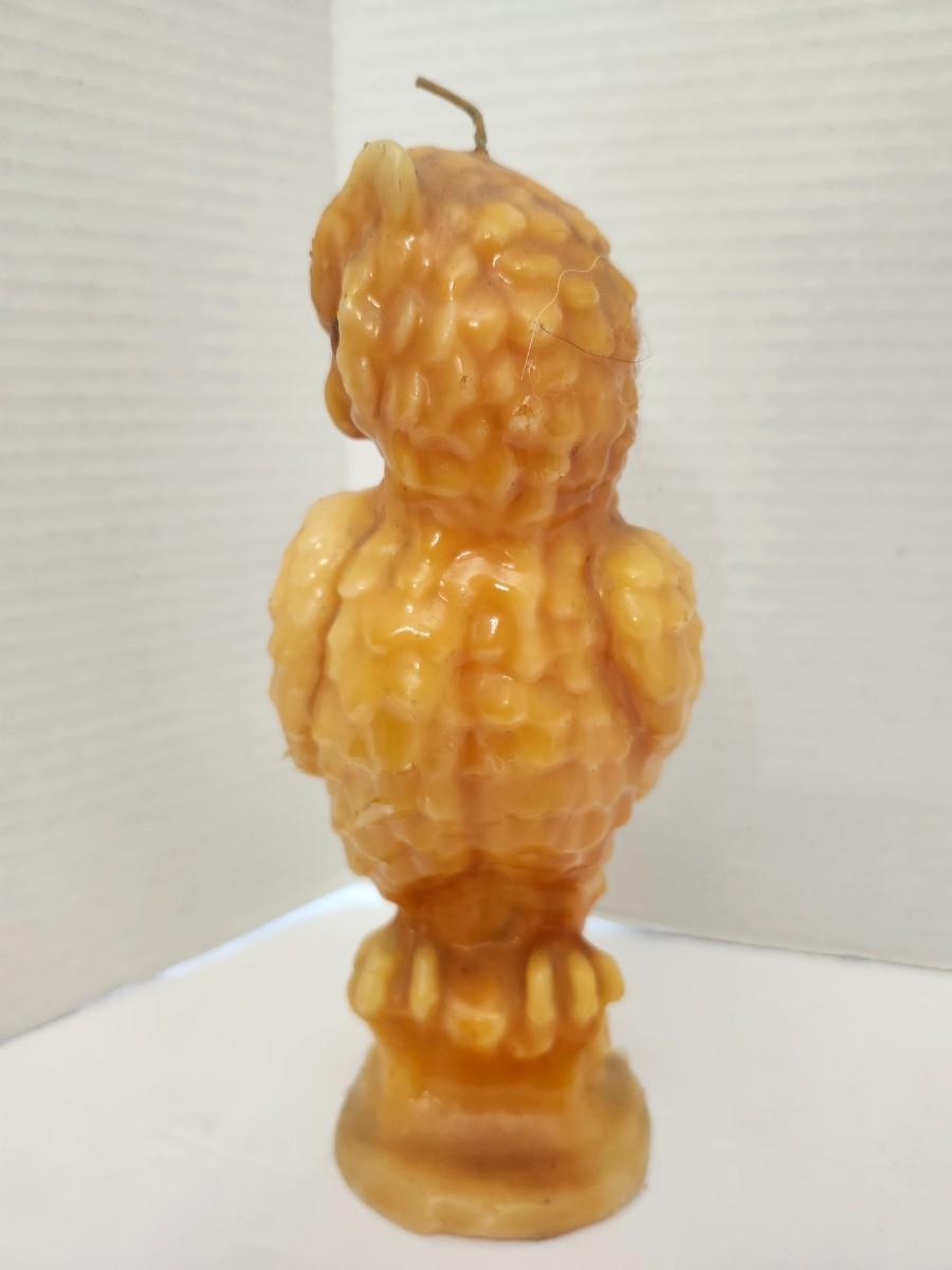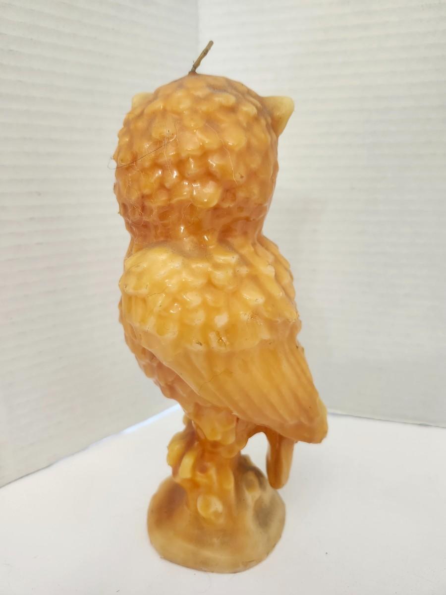 Molded owl candle made from solid wax featuring detailed feather texture and inset glass eyes. Sculptural figural form designed as a decorative candle rather than a standard taper or pillar. Unmarked example with visible wick at the top. Display piece suitable for seasonal decor, vintage collections, or curiosity shelves. Sold as shown.