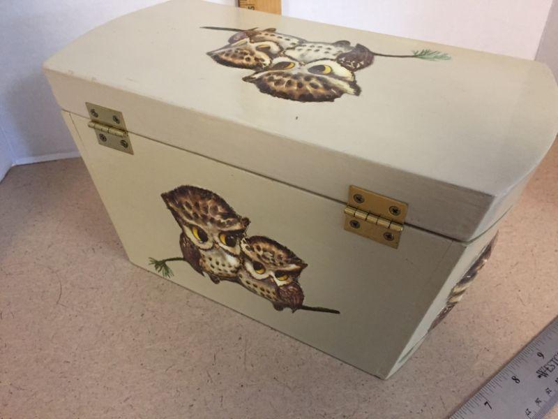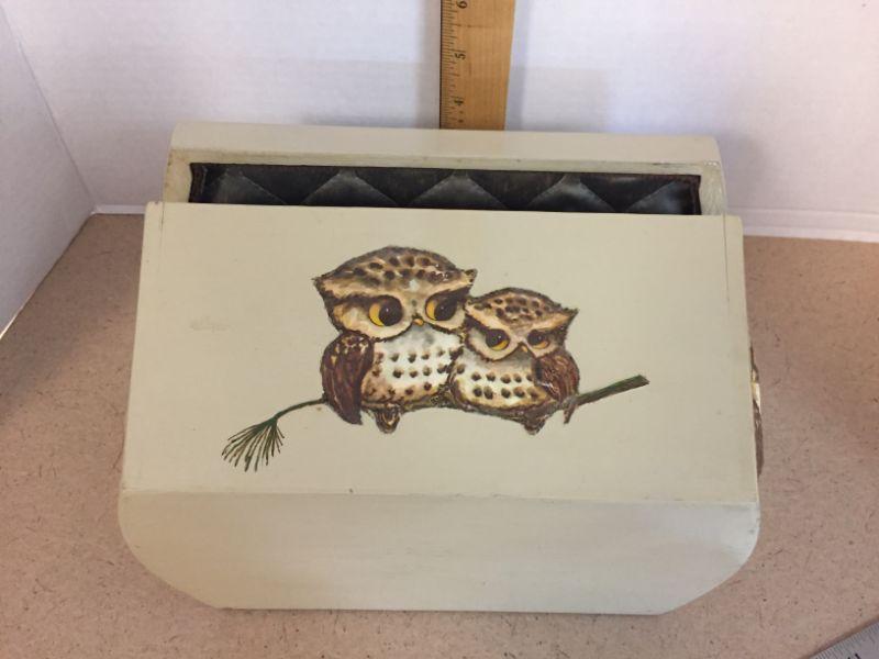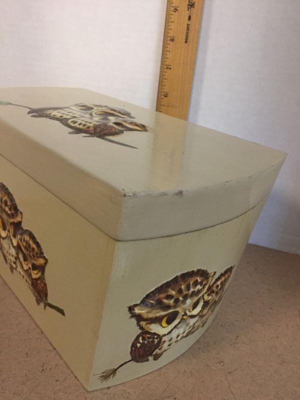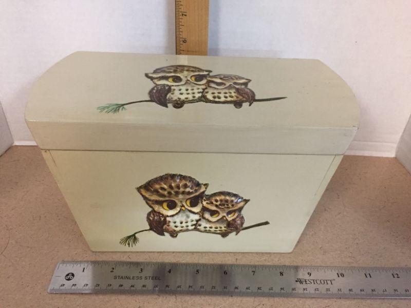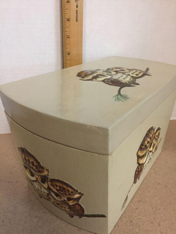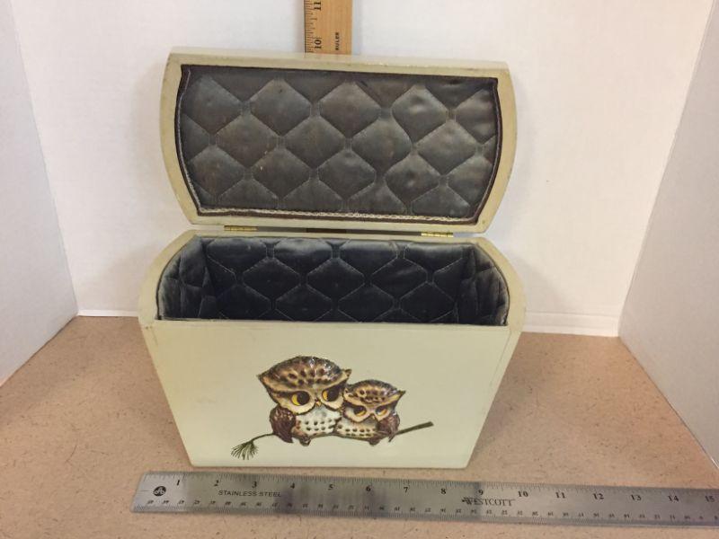 Charming vintage sewing or keepsake box featuring raised decoupaged owls on top and all four sides. Quilted interior. Minor scuffs.