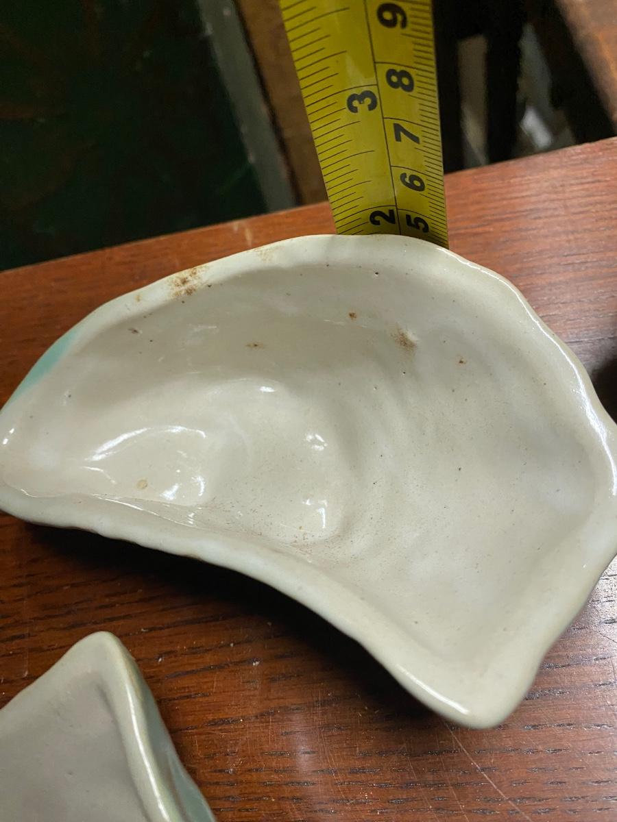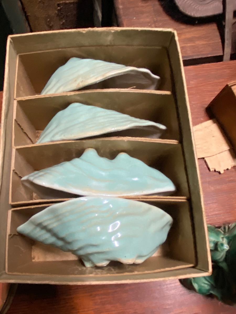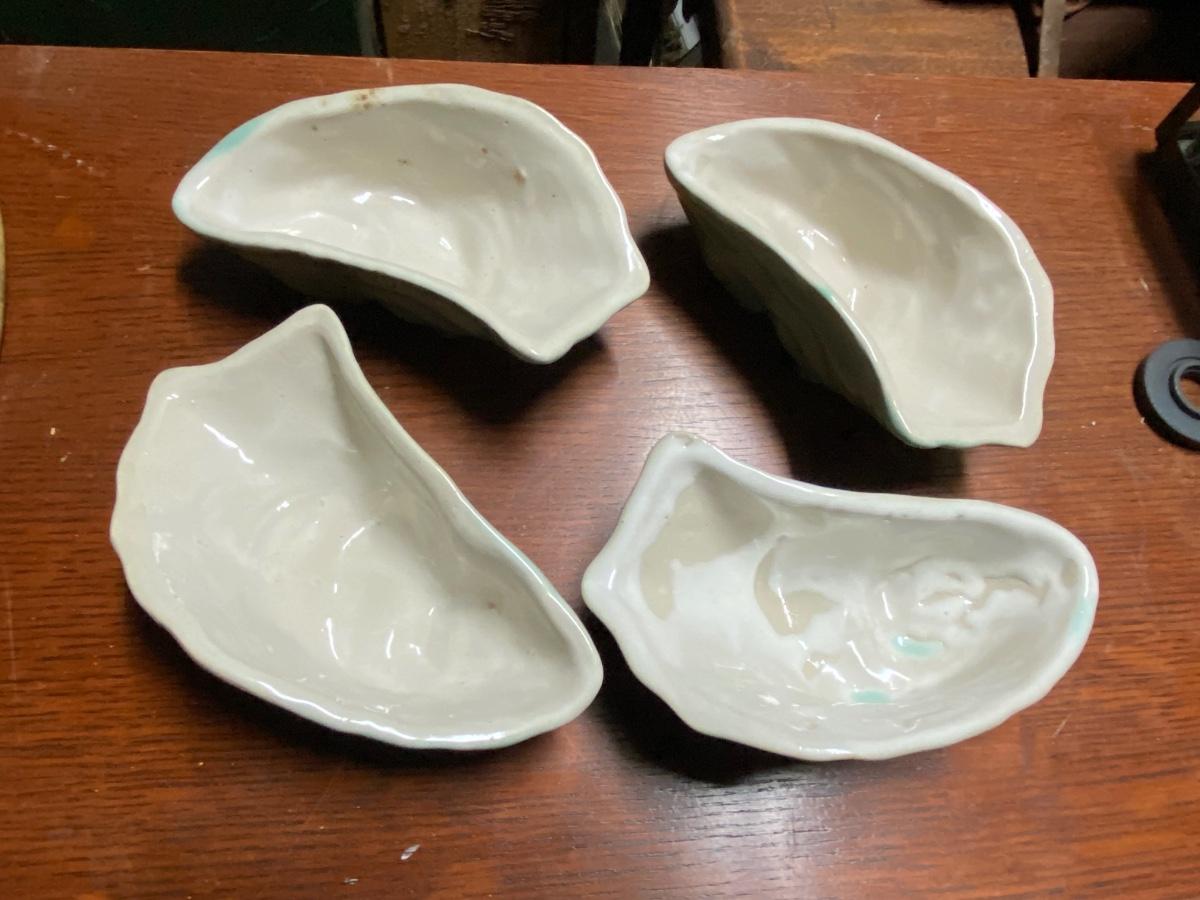 Vintage Oyster Shape Art Pottery Footed Bowls Dishes Sea Foam Green Set of 4. comes in box, no damage, one has glazing issue but no cracks.