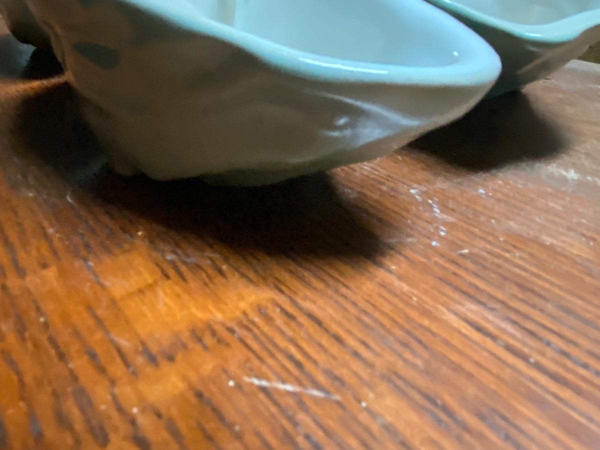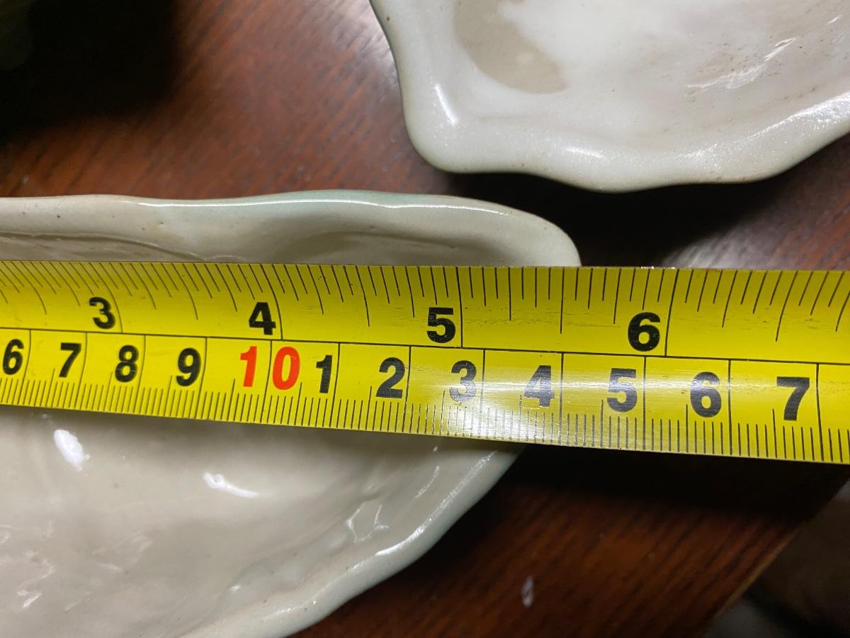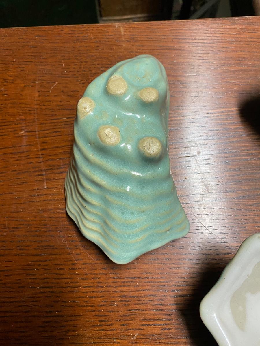 Vintage Oyster Shape Art Pottery Footed Bowls Dishes Sea Foam Green Set of 4. comes in box, no damage, one has glazing issue but no cracks.