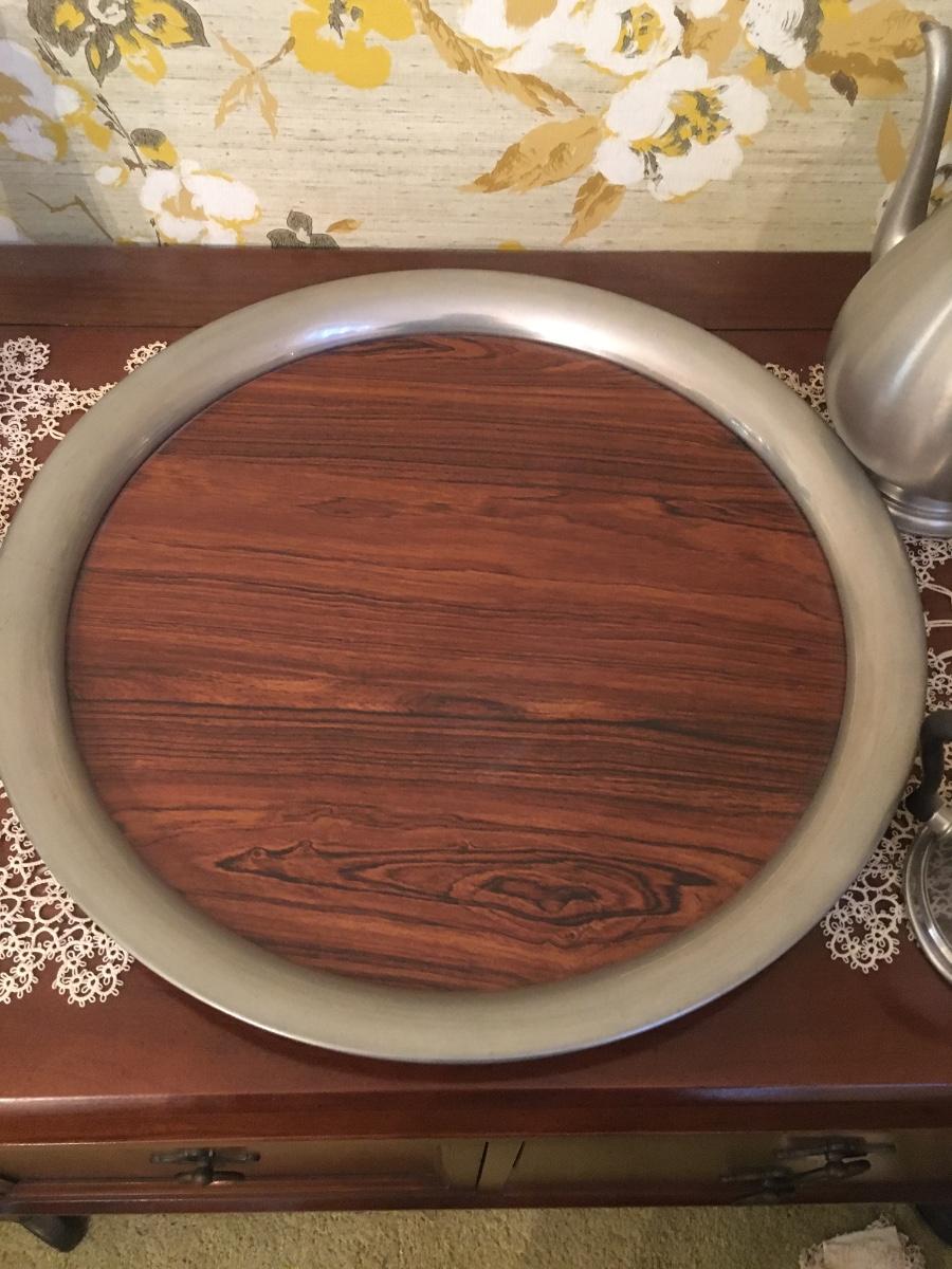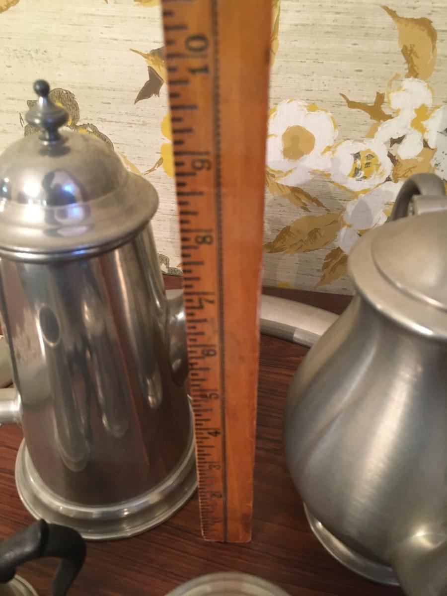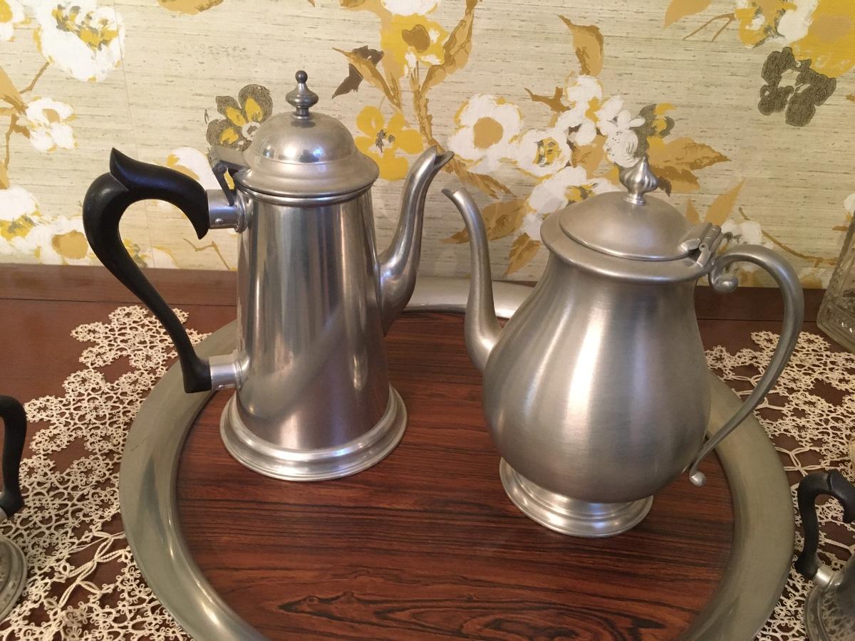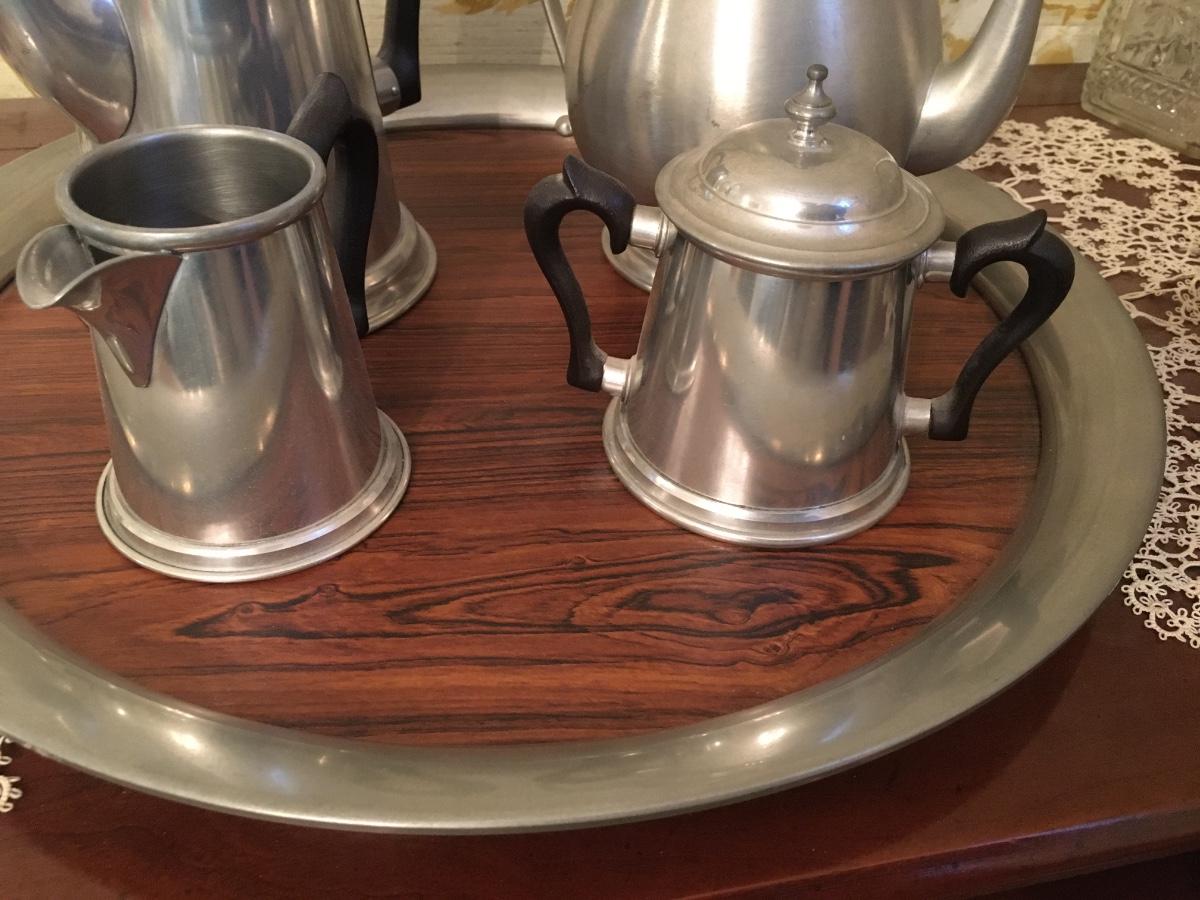 Complete set of sugar bowl, creamer, coffee pot and tea pot on a tray.