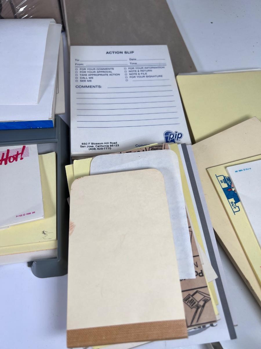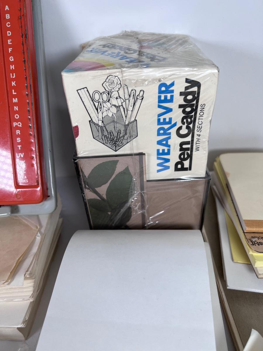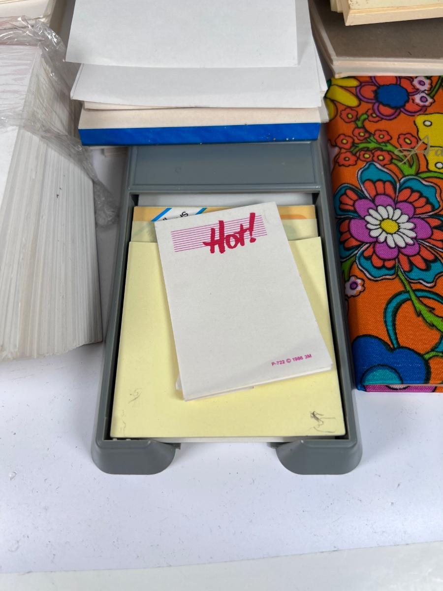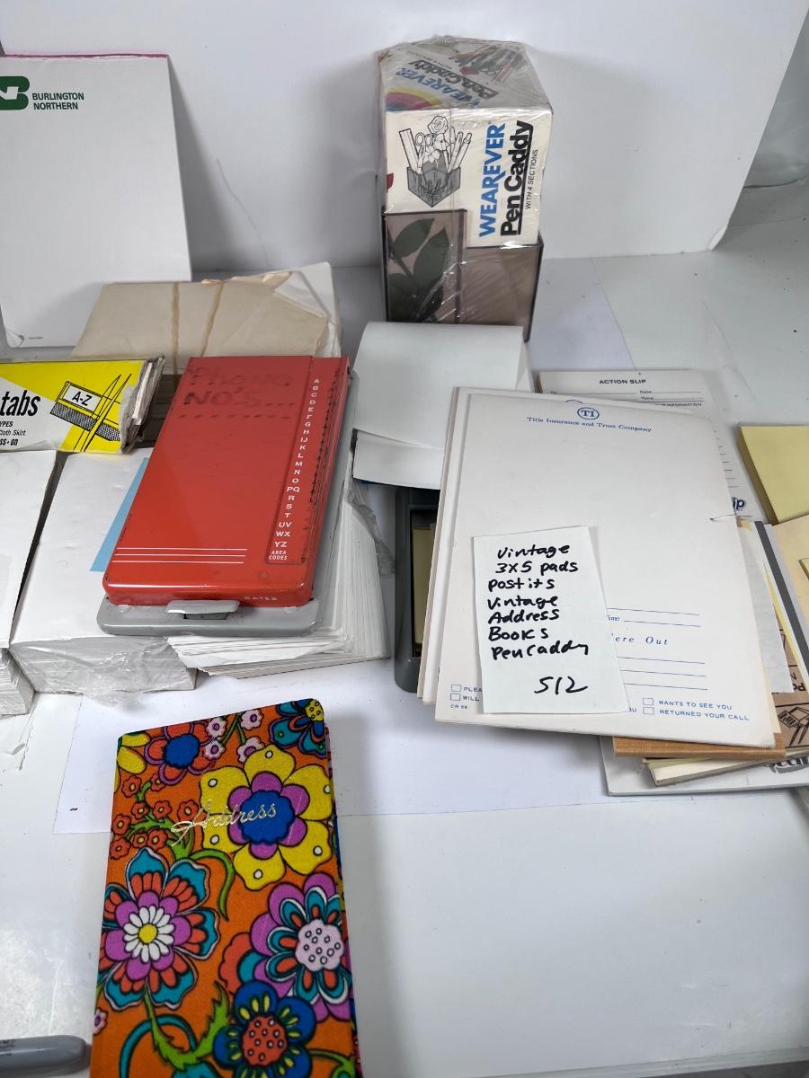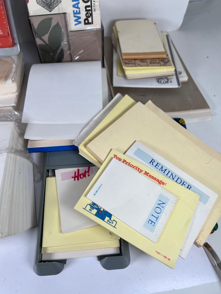 New old stock paper small pads, very useful scrap paper. Pen pencil 1970s plastic , stationary post it’s and holder.