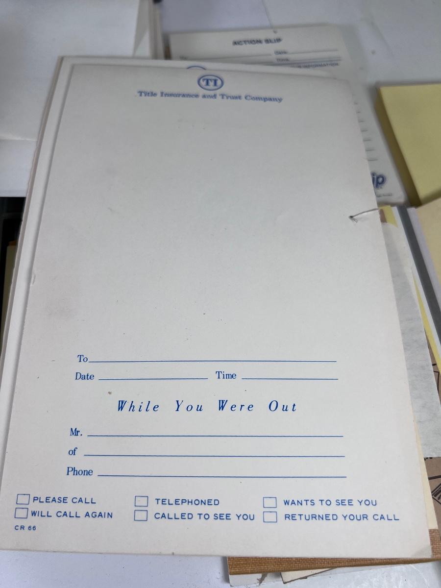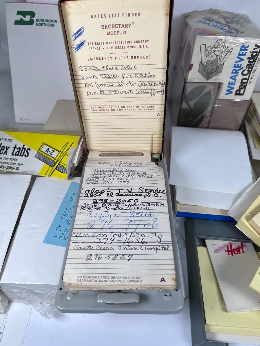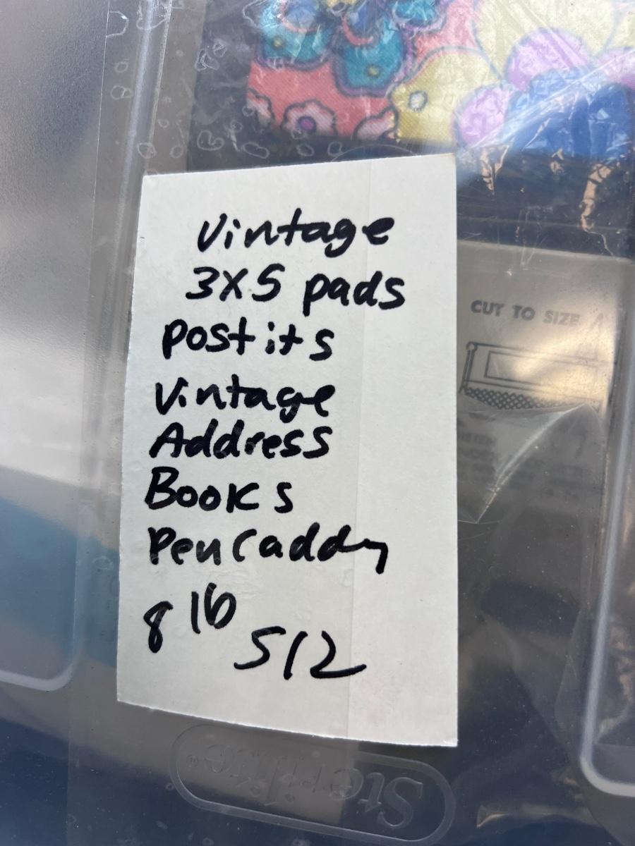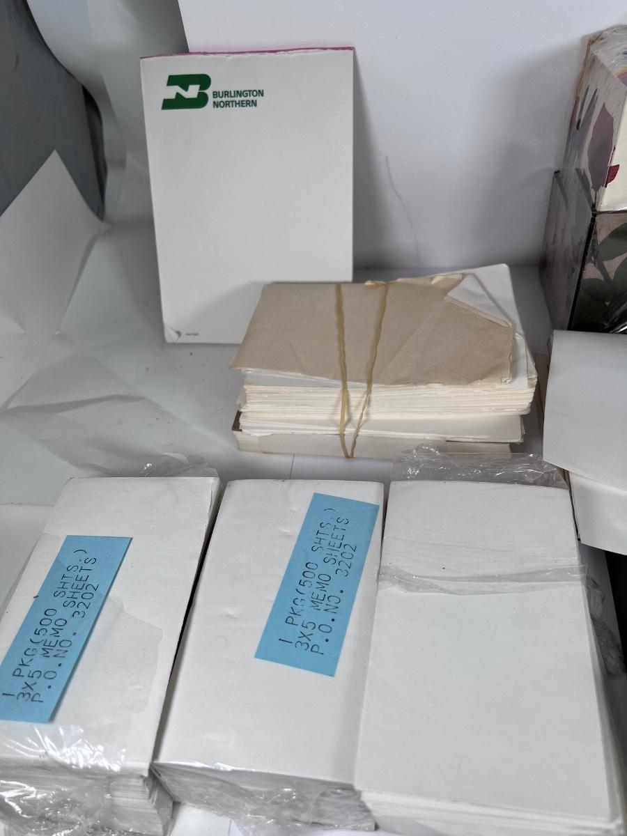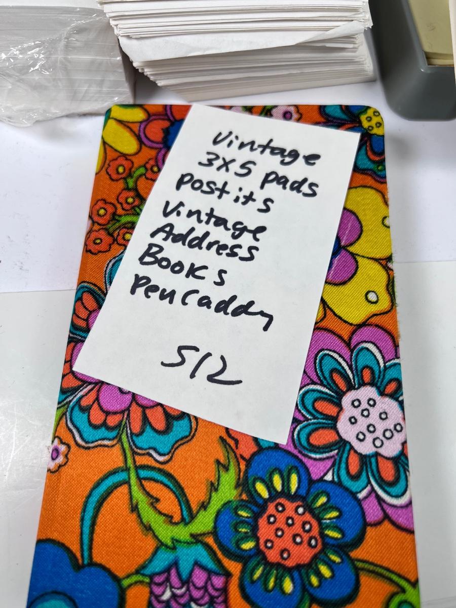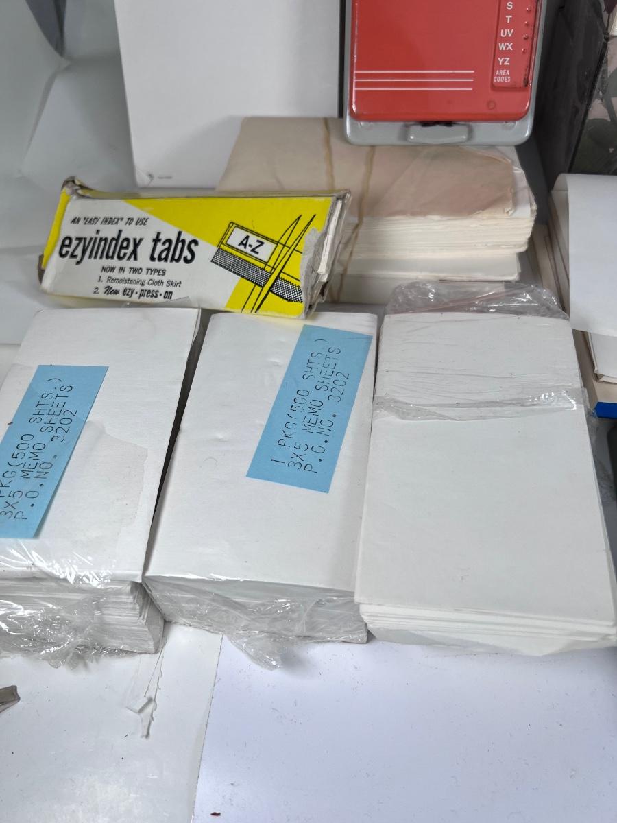 New old stock paper small pads, very useful scrap paper. Pen pencil 1970s plastic , stationary post it’s and holder.