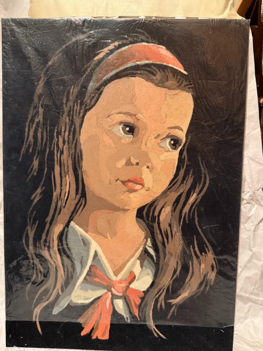 Vintage Paint By Number on Black Velvet Portrait of a Girl: A captivating paint-by-number artwork depicting a young girl, adding a unique touch to any vintage art collection