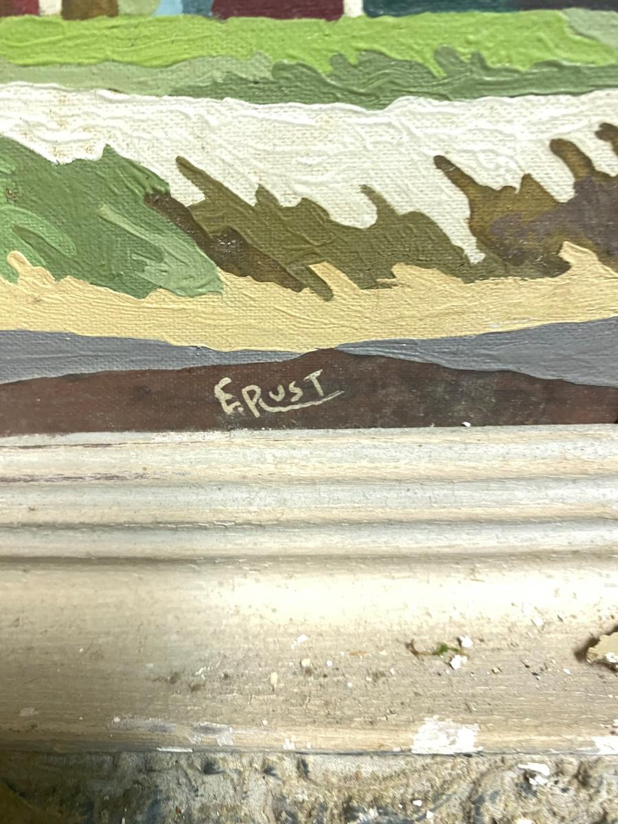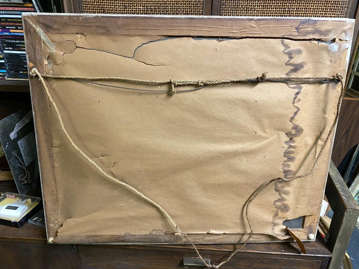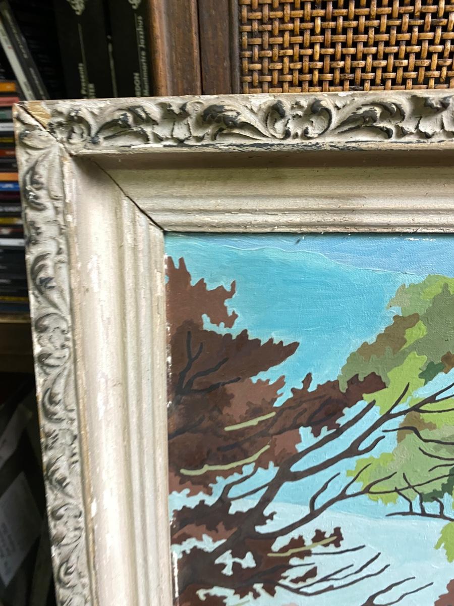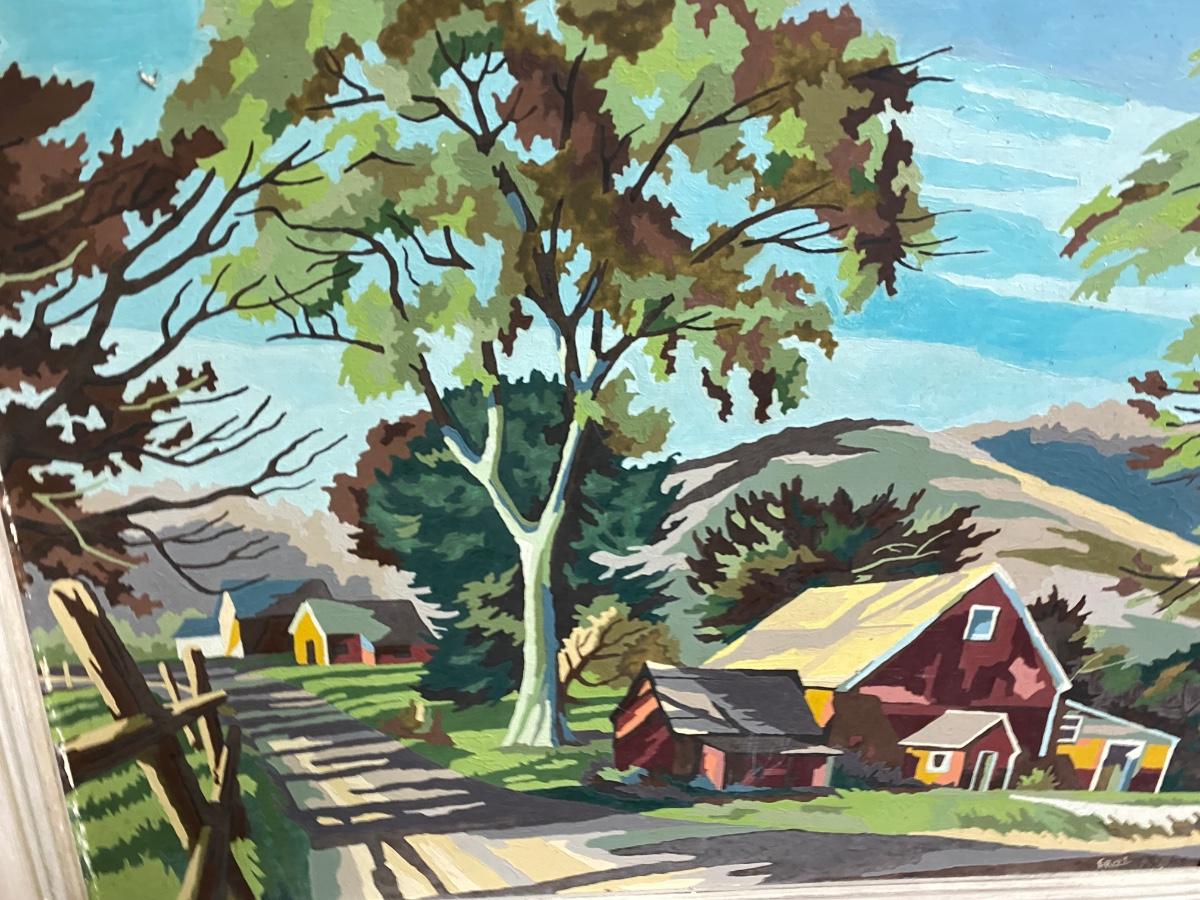 VIntage framed and signed paint by numbers serene country living. Frame is in distressed condition, and painting has slight wear in one section as shown in photo, but overall a classic .Measurements are in photo