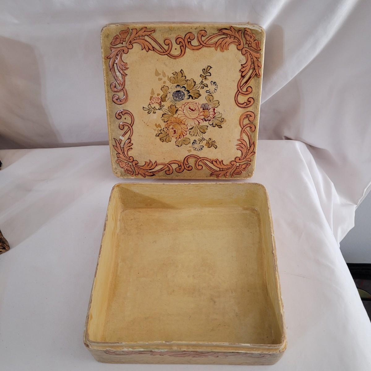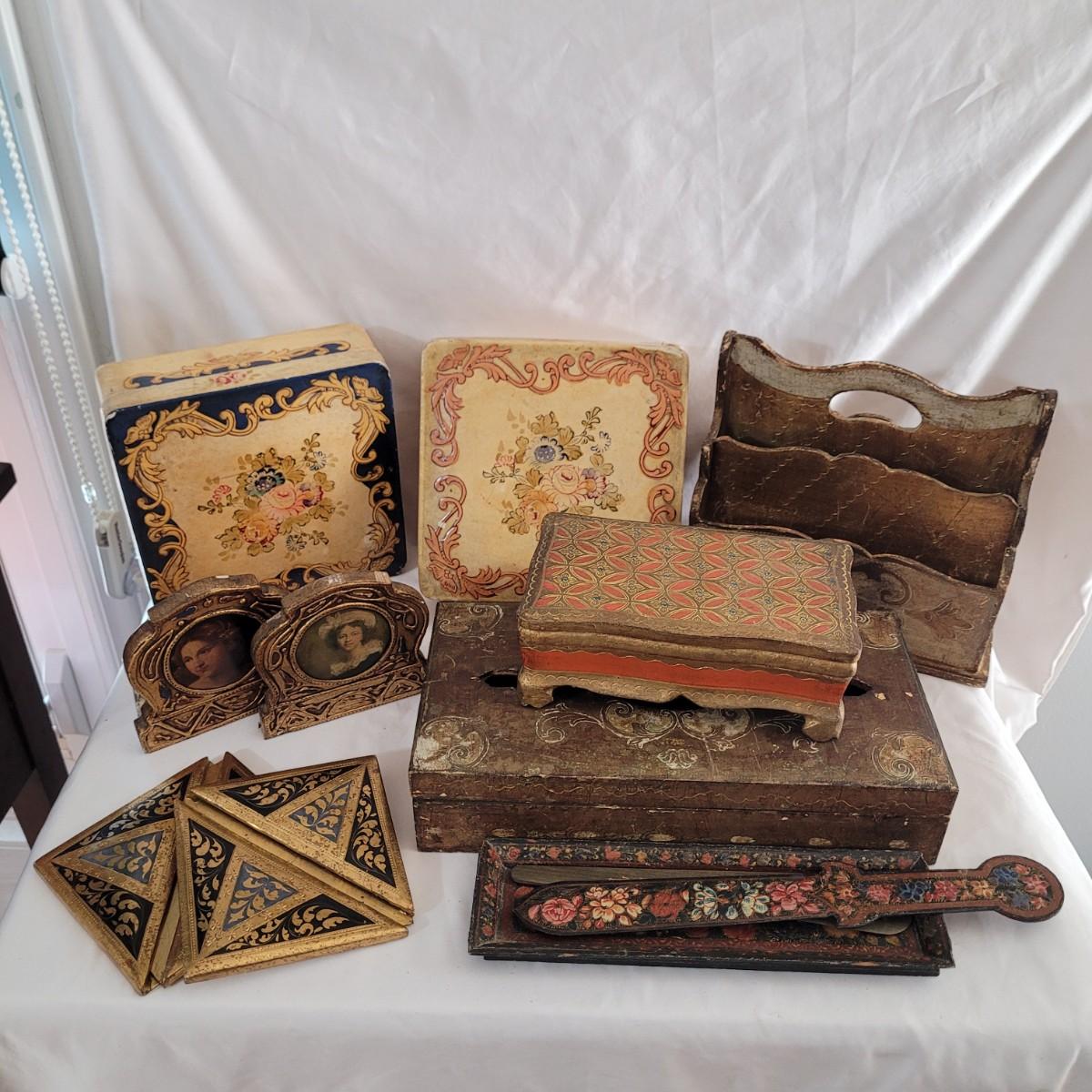 This collection of vintage, painted boxes and more come from Japan, Italy, and India. Included are boxes, bookends, tissue box, letter organizer, letter openers and corner guards. Tissue box measures approximately 11” x 6” x 3”H. Shipping available.