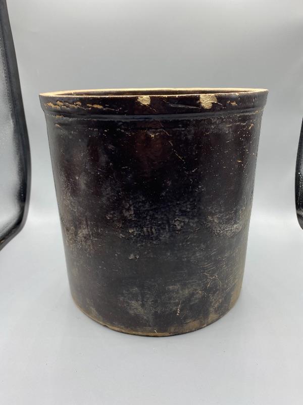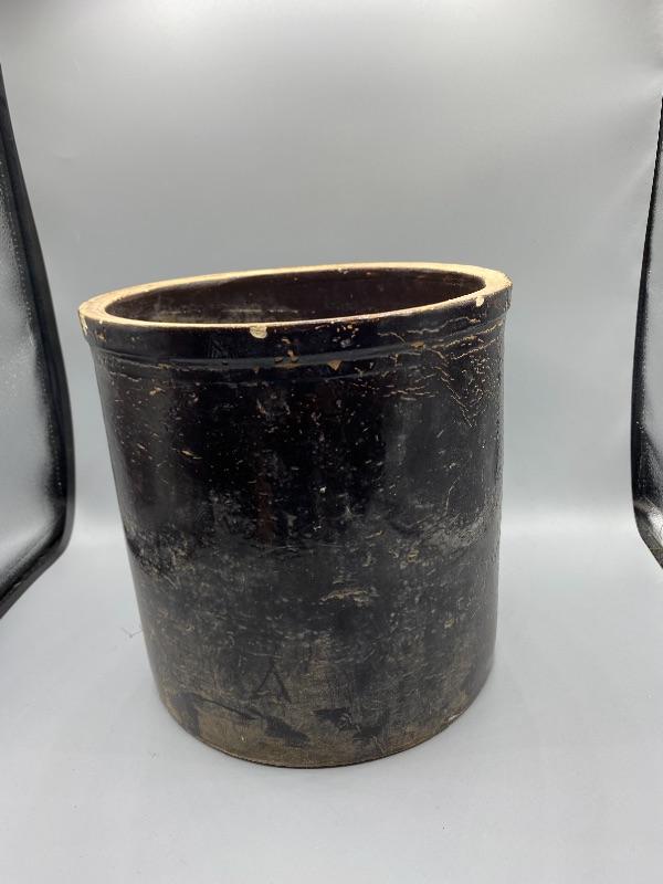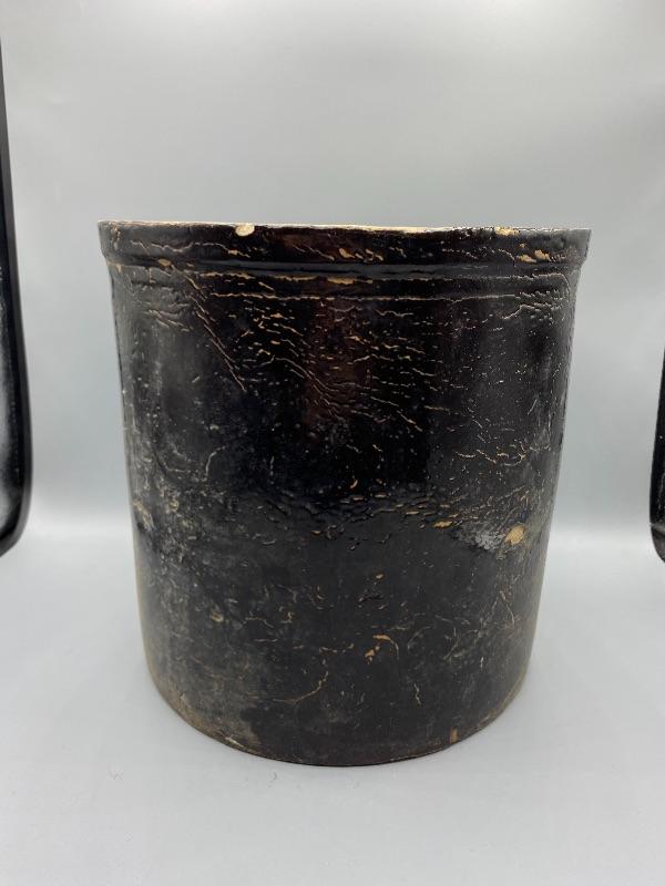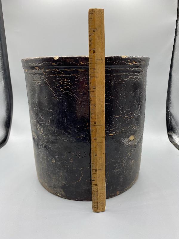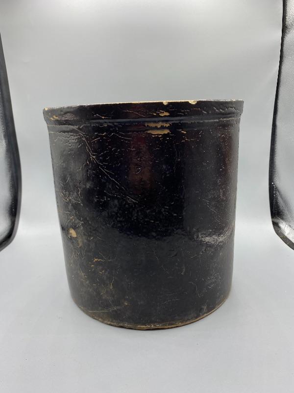Vintage ceramic crock. Painted inside and out. Paint is cracked and chipped in spots giving it a good rustic look. Stands about 9,75".