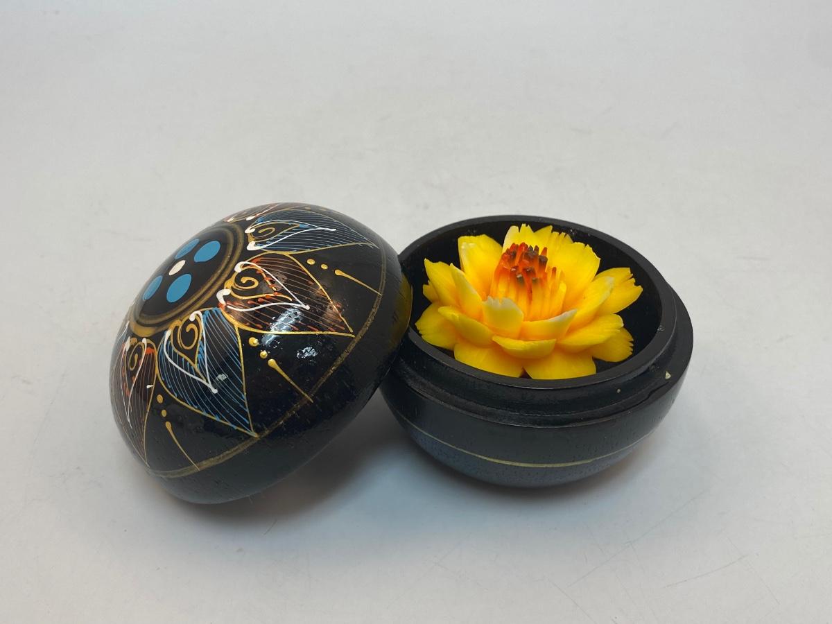 Vintage Painted Enamel Round Trinket Box with Bright Yellow Wax Soap Flower Inside