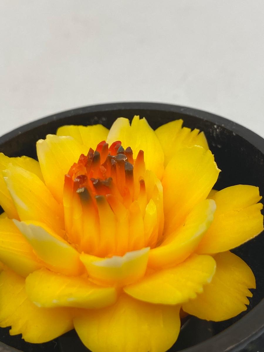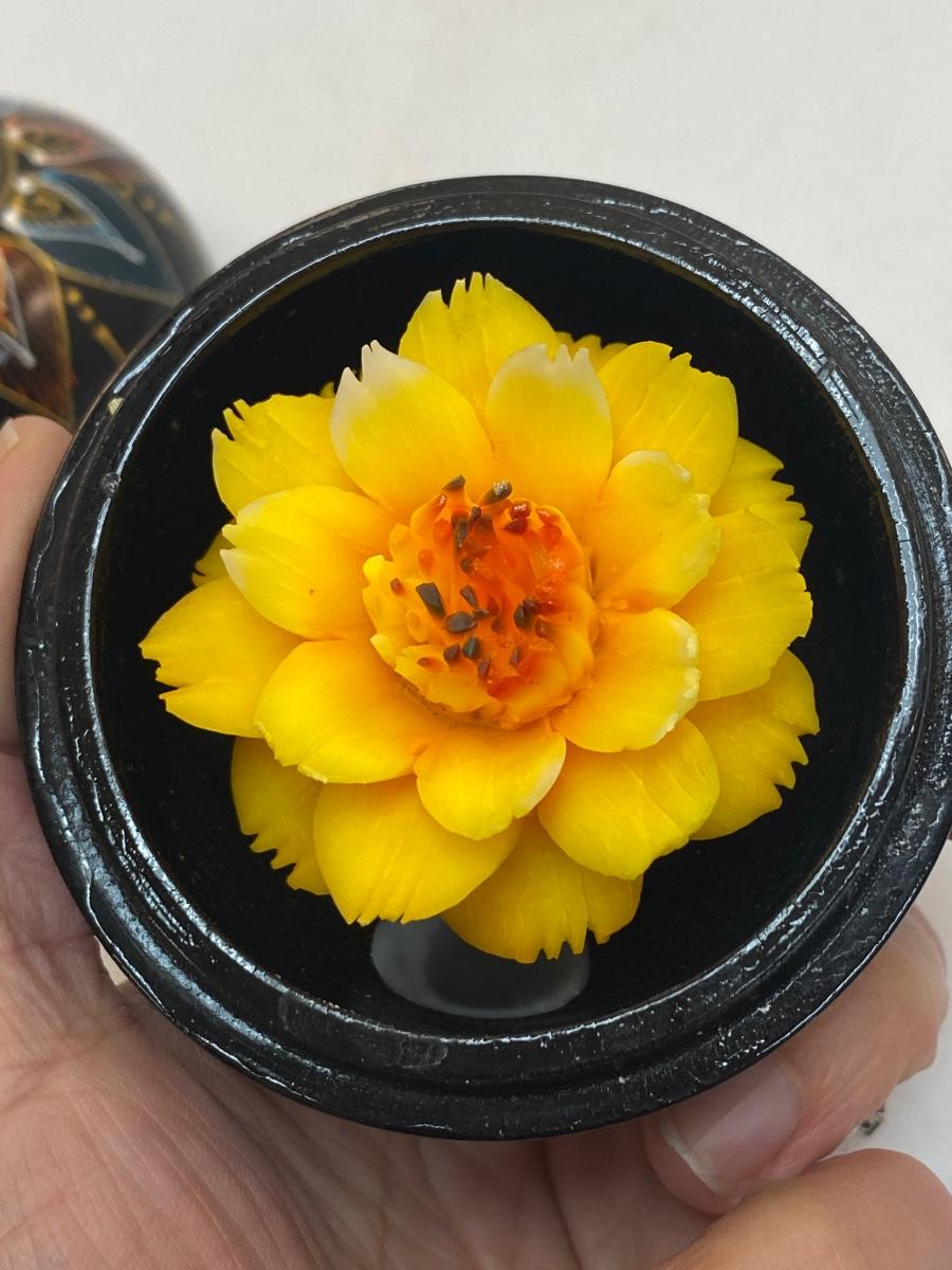 Vintage Painted Enamel Round Trinket Box with Bright Yellow Wax Soap Flower Inside. Flower is attached inside but can probably be removed if desire. 3" size. Not intended for use just decoration.