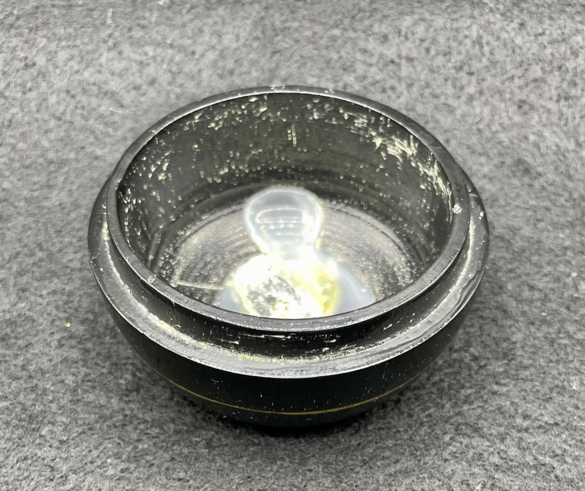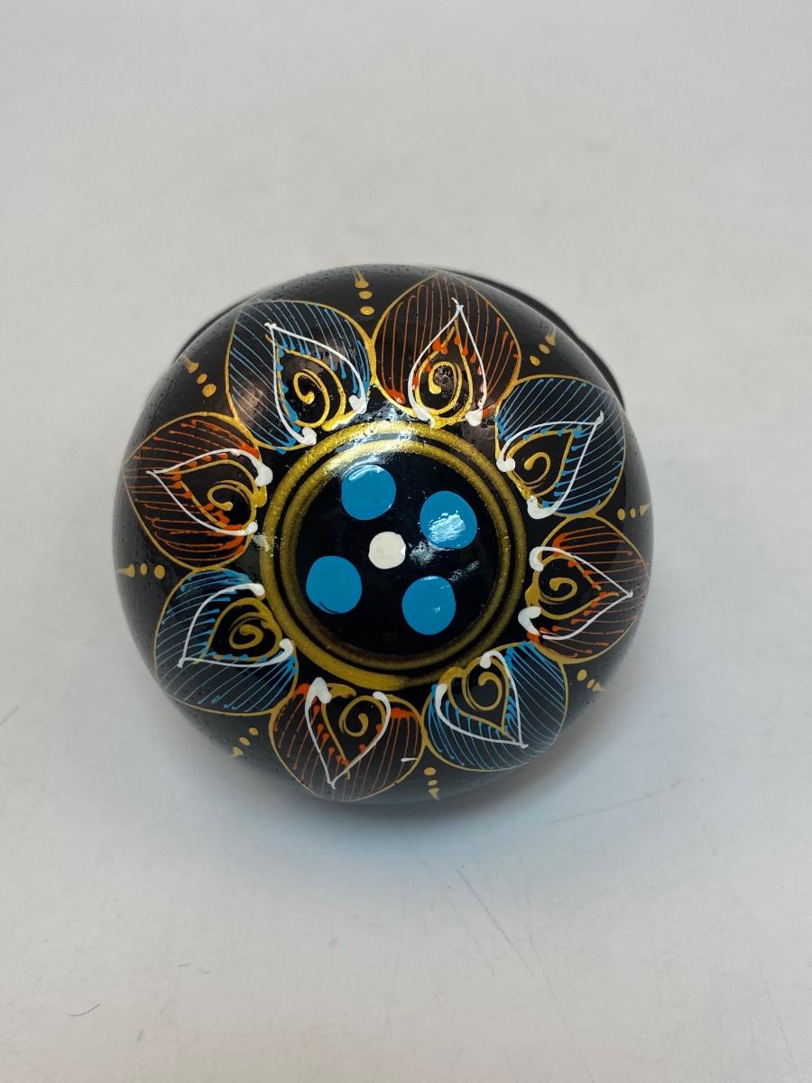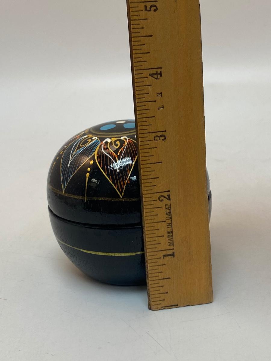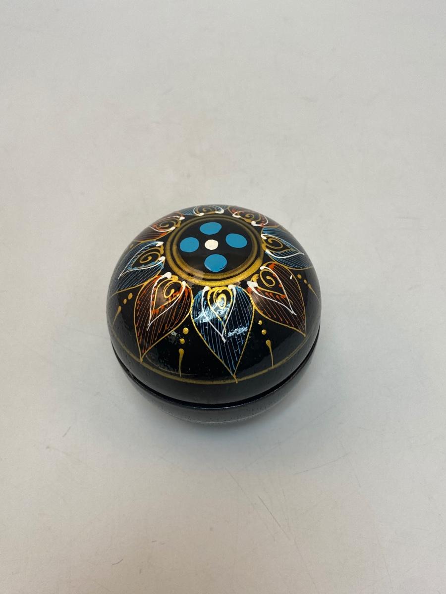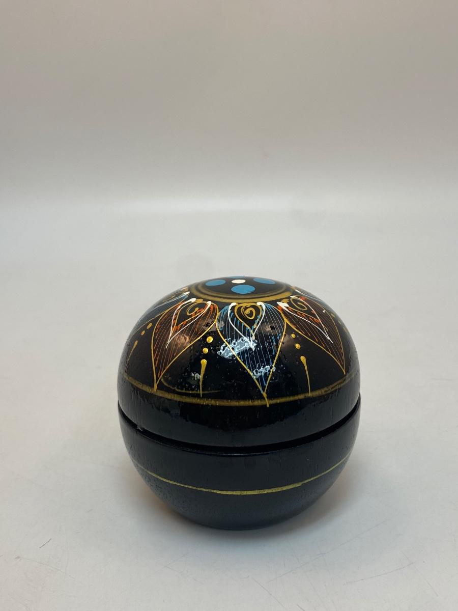 Vintage Painted Round Trinket Box, approx 3" size. Looks to be made from resin. A fragrant soap “flower” was glued inside, but was removed because it had crumbled.