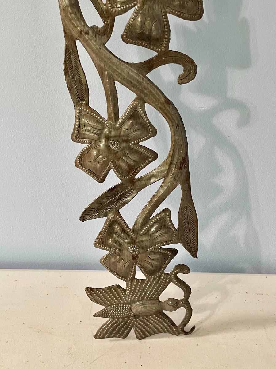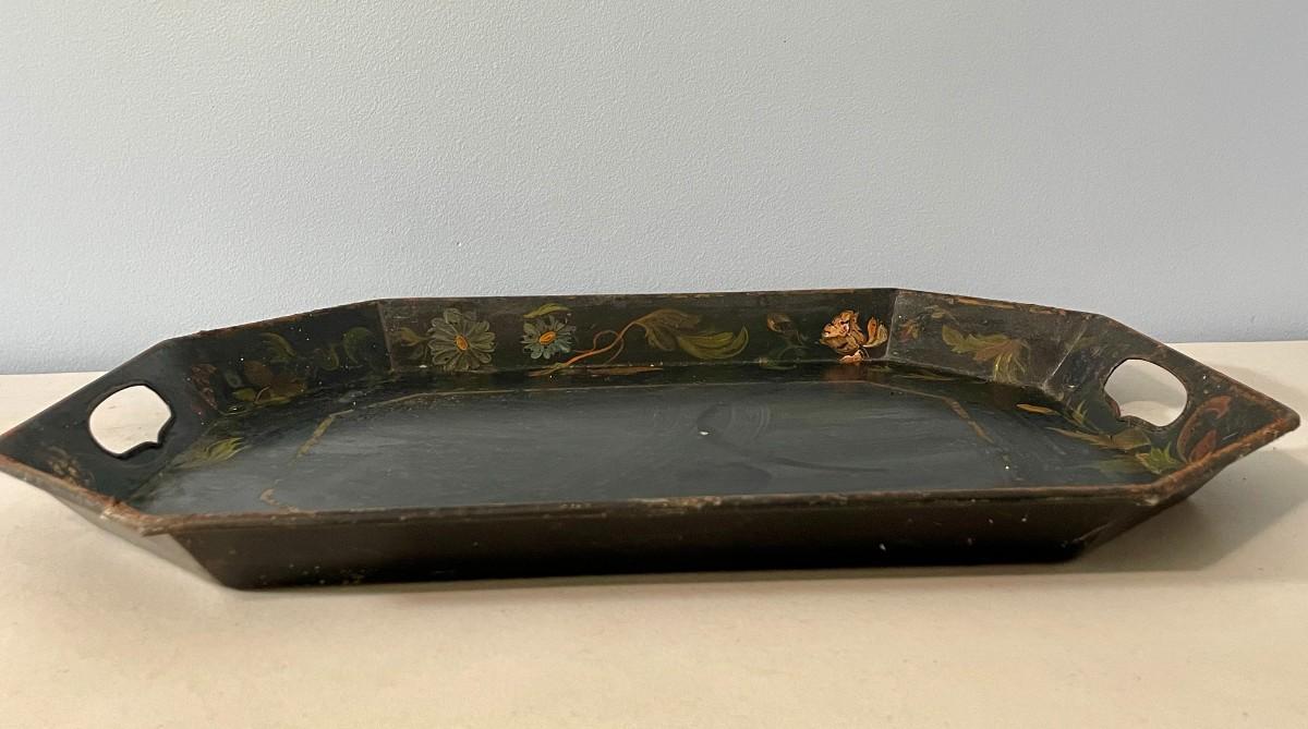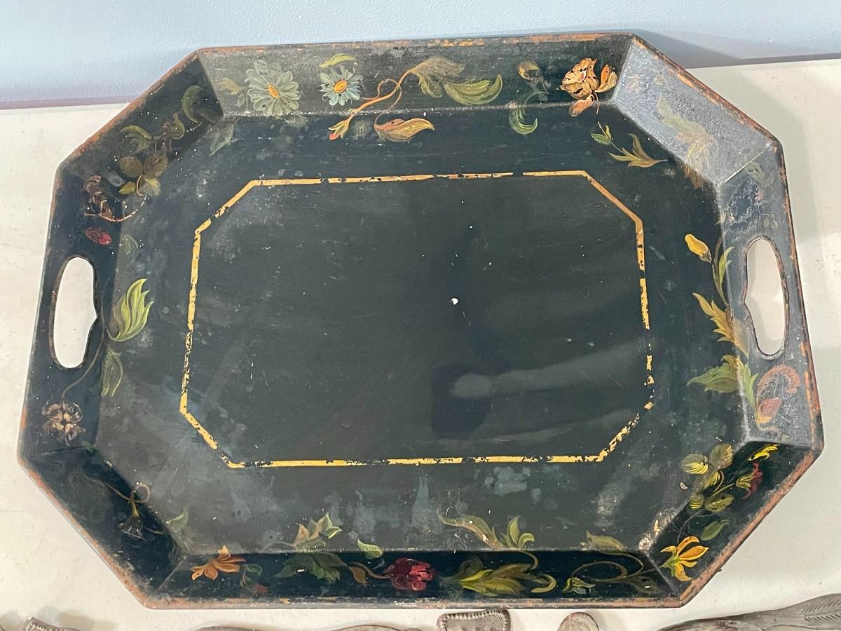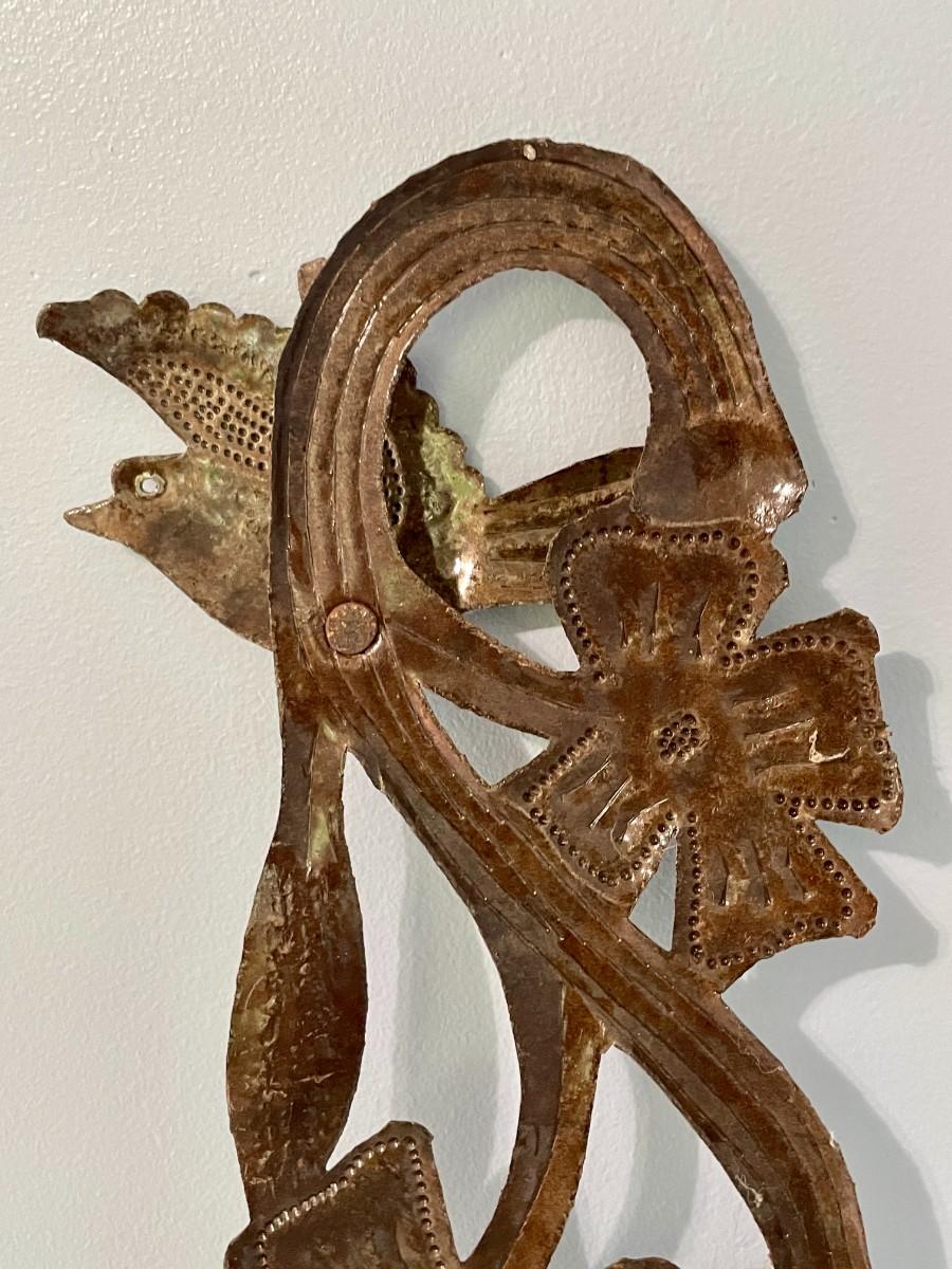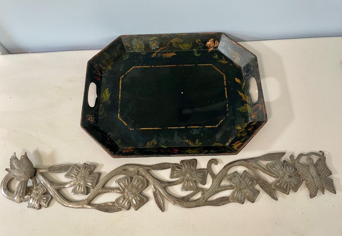 Vintage painted metal toile tray + punched metal wall hanging