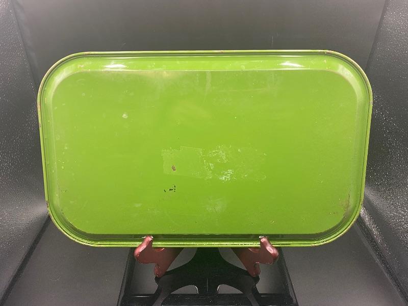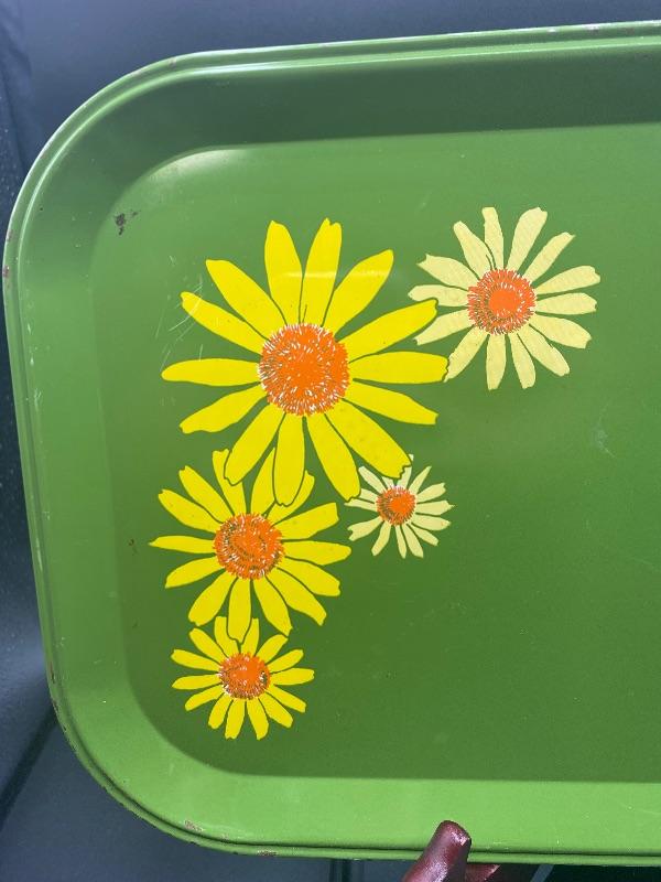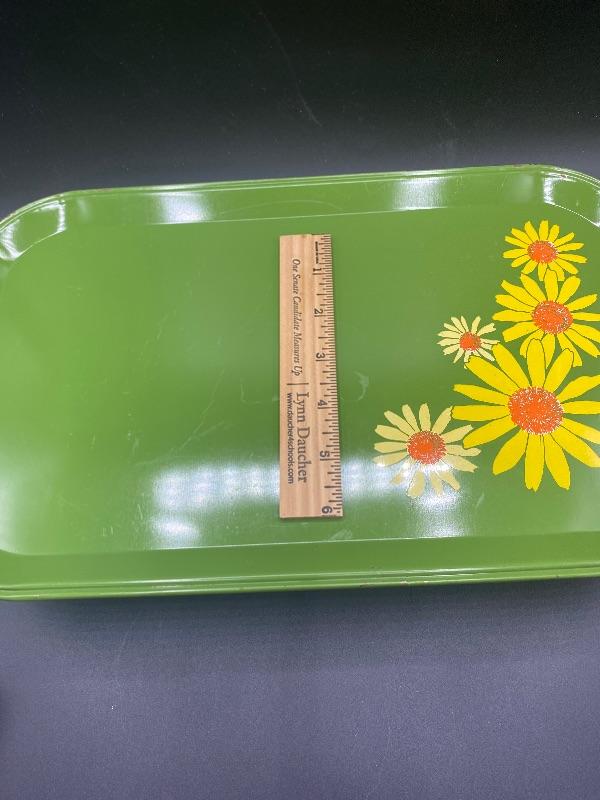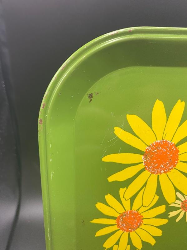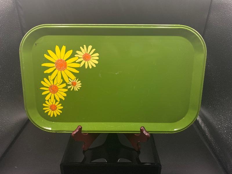 Vintage painted metal tray. Olive green with yellow and orange flowers. Does have some scratches in paint, nothing to bad.