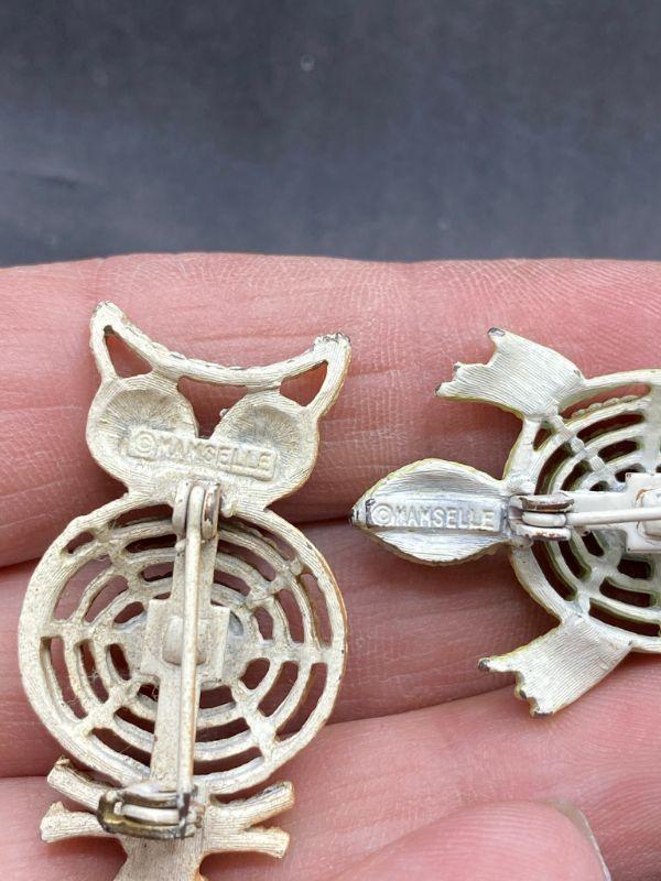 Pair of vintage Mamselle pins, an owl and a turtle. Painted, twisted metal, signed on the back. About 2" length.