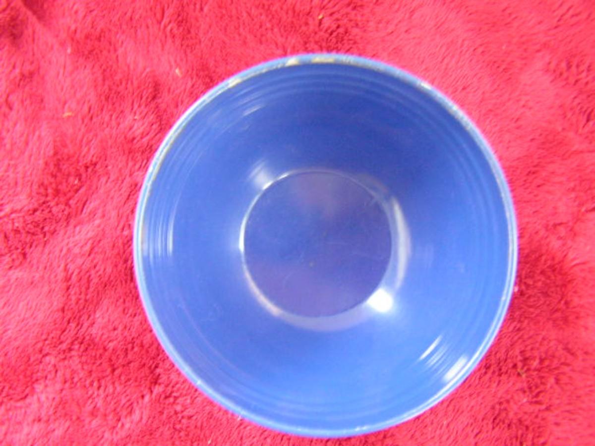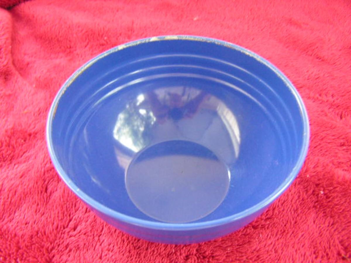 Vintage painted stamped steel cereal/soup bowl. Paint worn but metal not beat up. About 6-1/2"m dia x 2-3/4" deep.