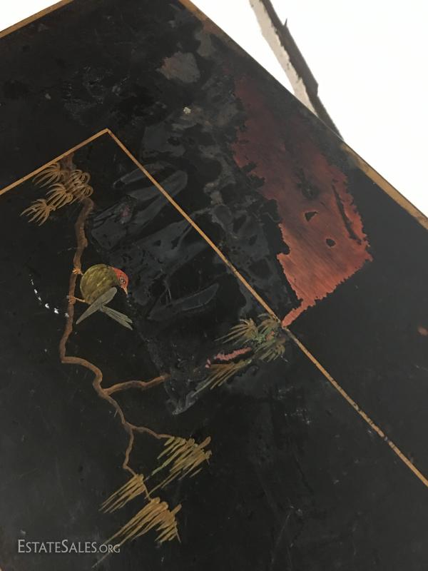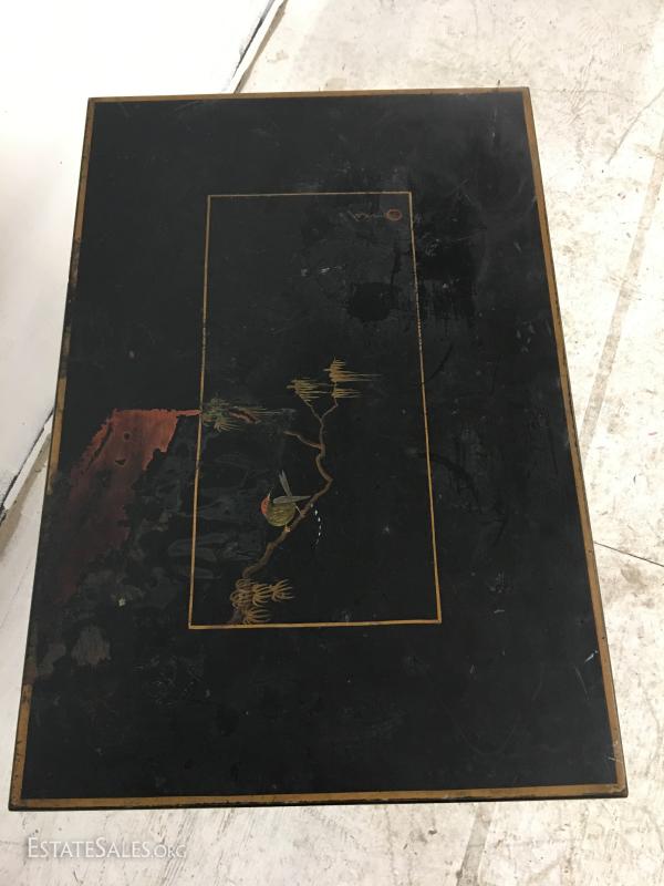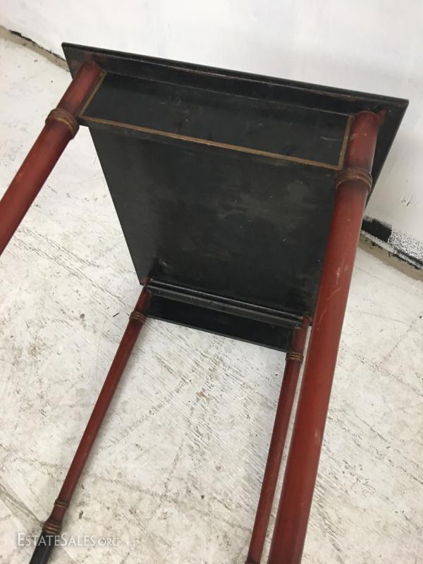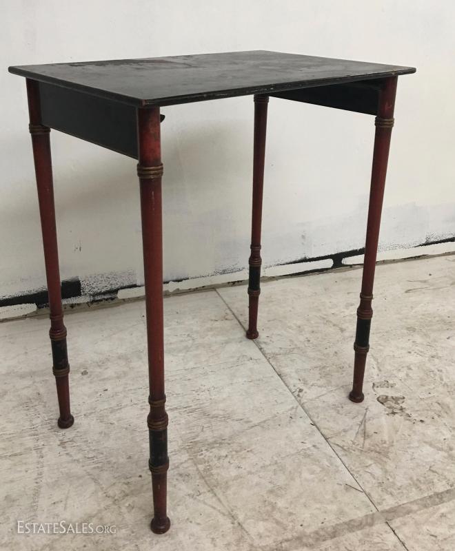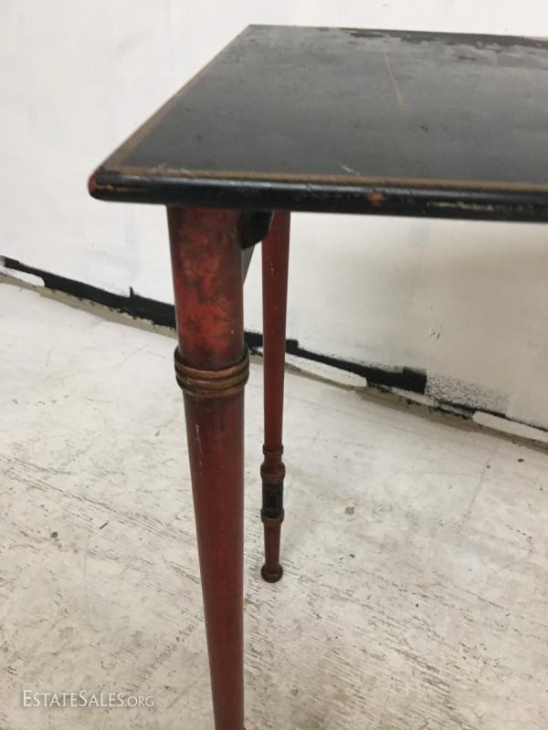 Vintage painted table shows wear and some damage. Measures 24" by 16" and is 29" tall.