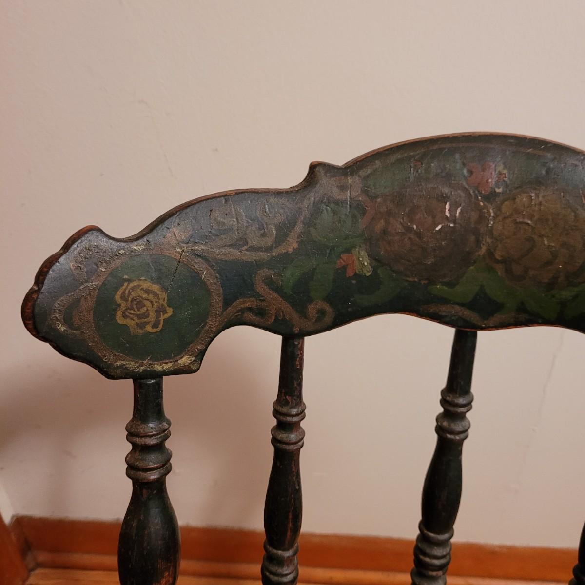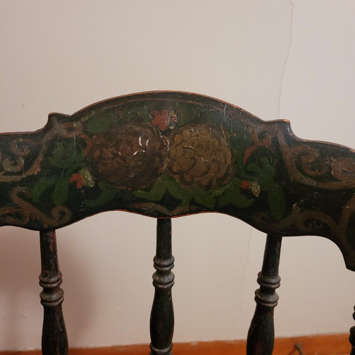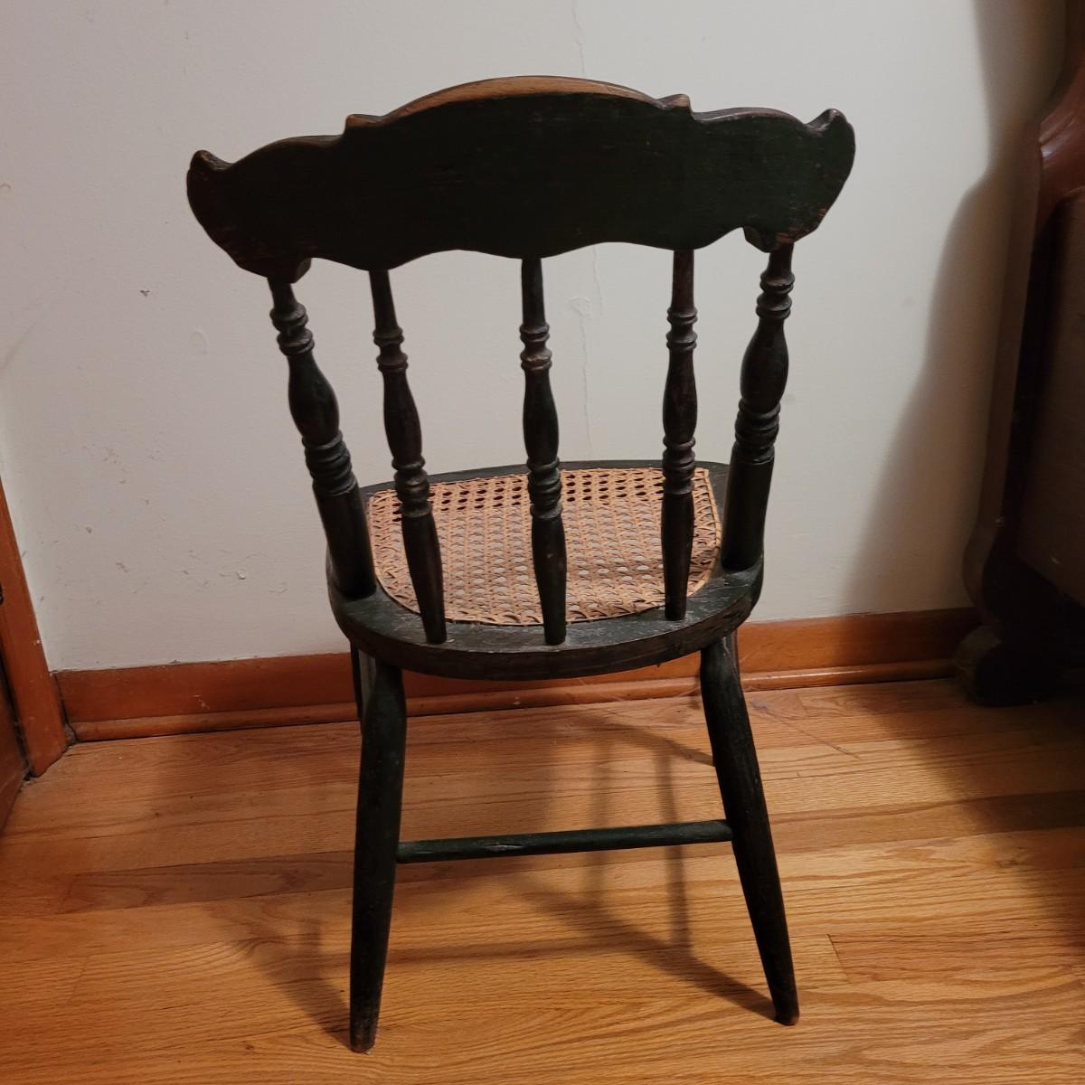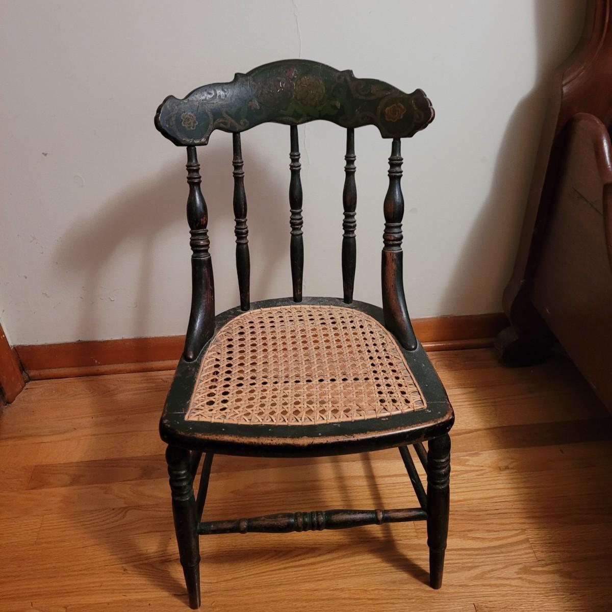 A vintage painted wooden children's chair in good condition with some damage and the stain is wearing off. This chair features a woven can seat and painted floral patterns. Measures approximately 16" x 15" x 28" with a seat height of 14.5". Local pickup only