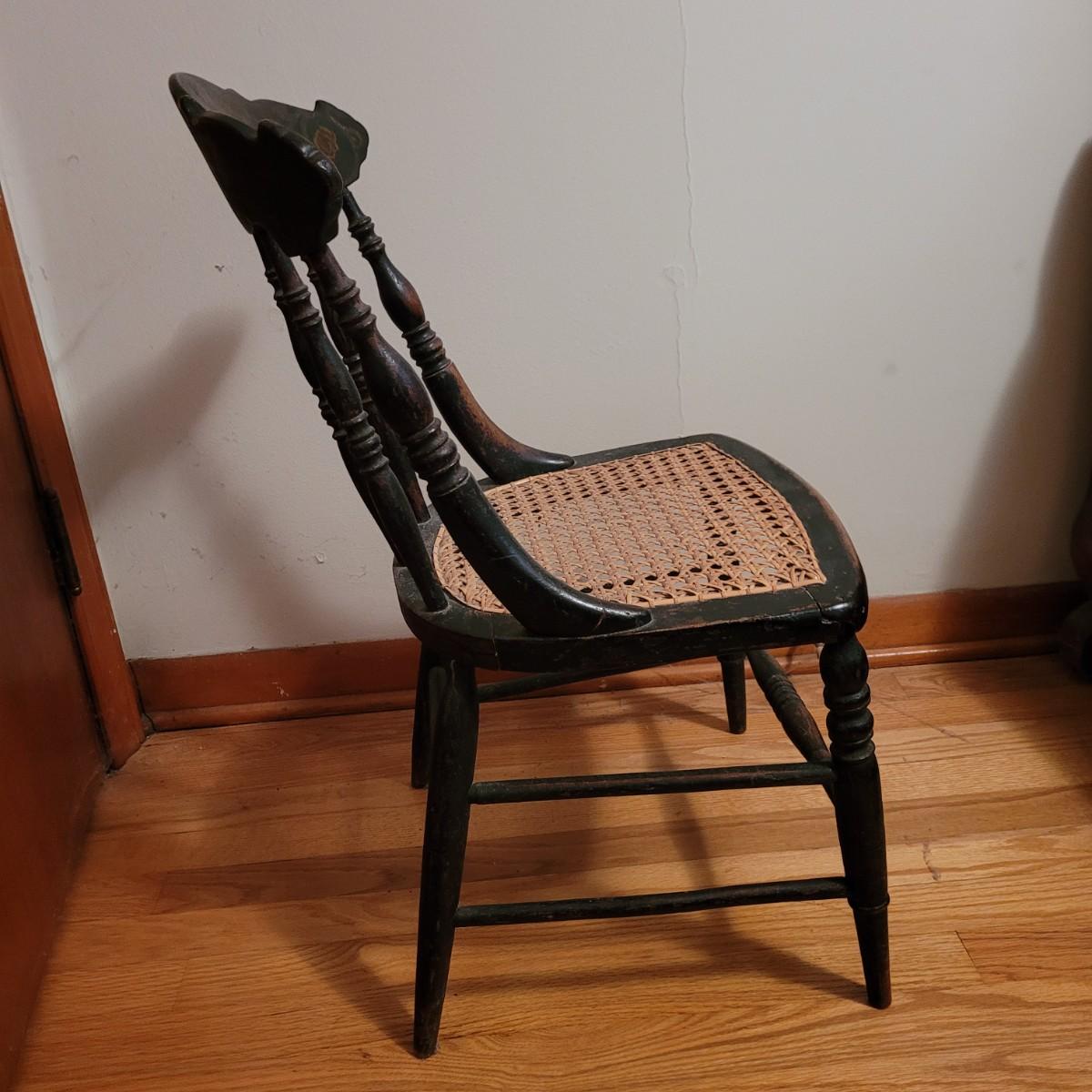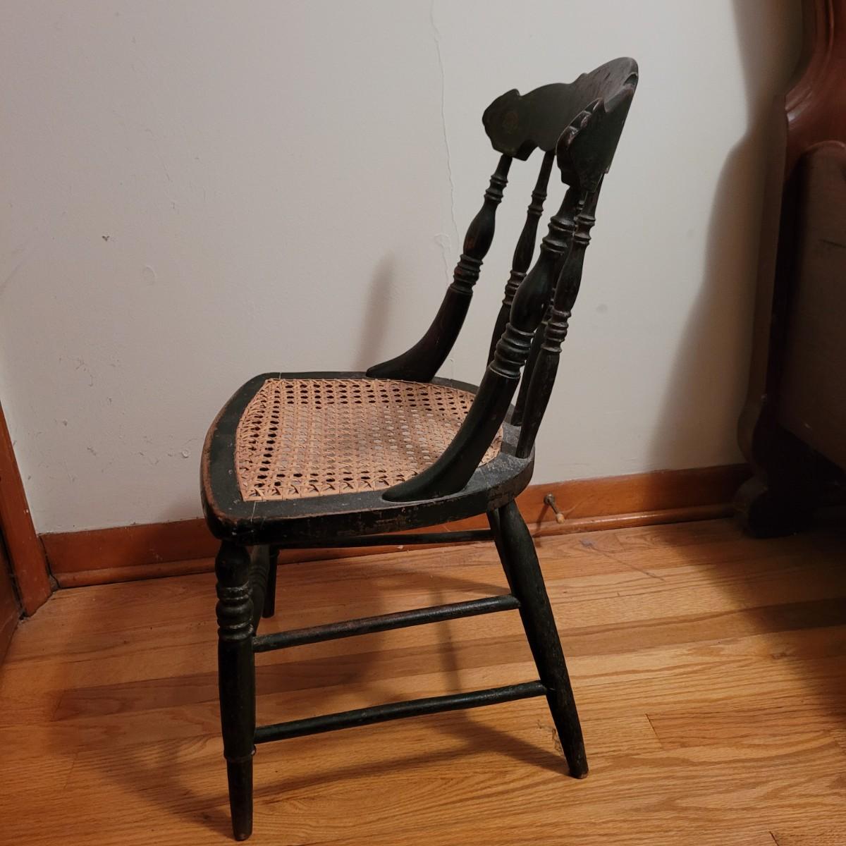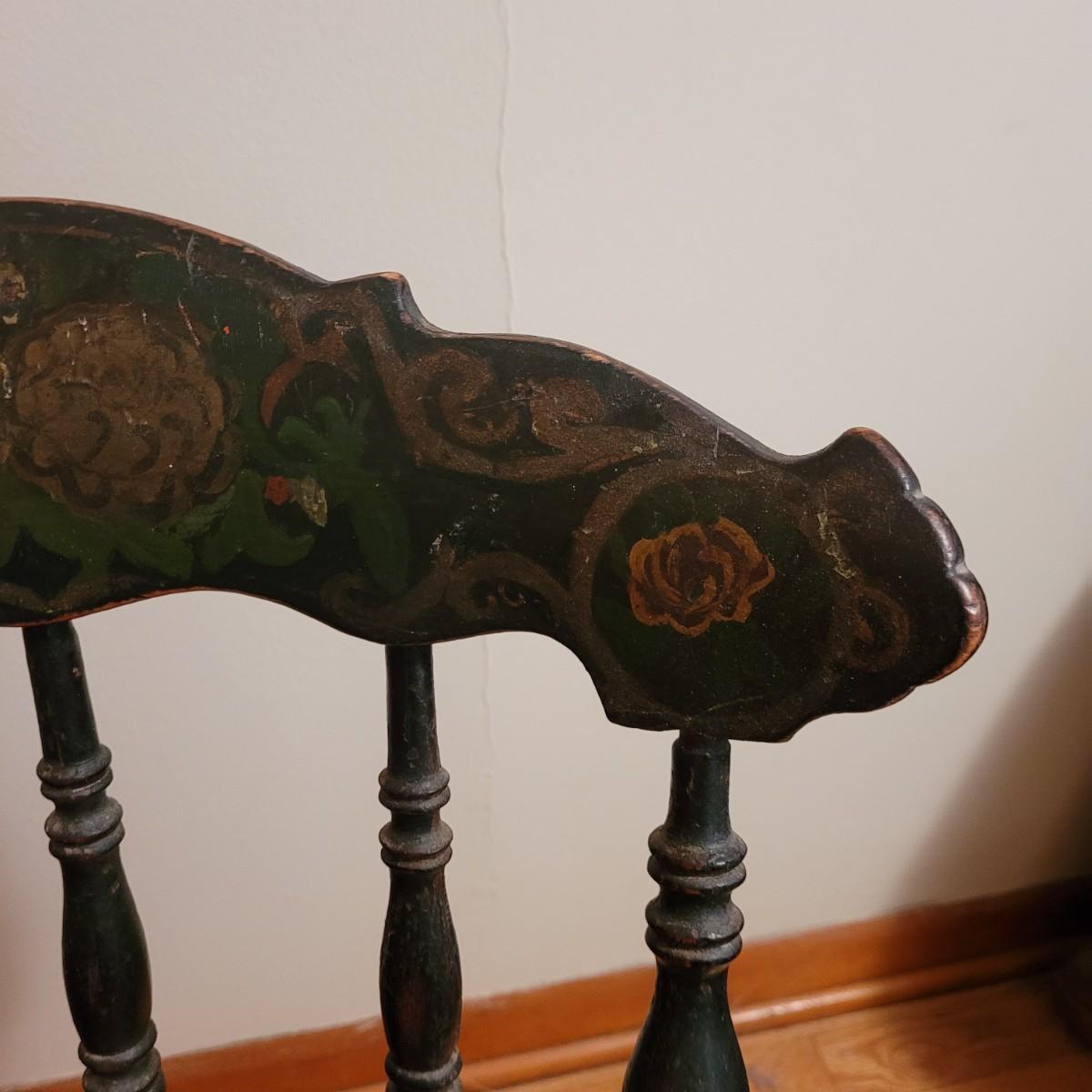 A vintage painted wooden children's chair in good condition with some damage and the stain is wearing off. This chair features a woven can seat and painted floral patterns. Measures approximately 16" x 15" x 28" with a seat height of 14.5". Local pickup only