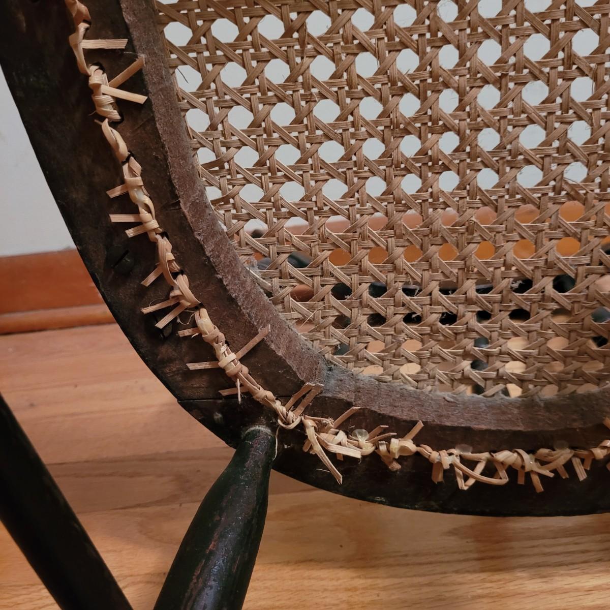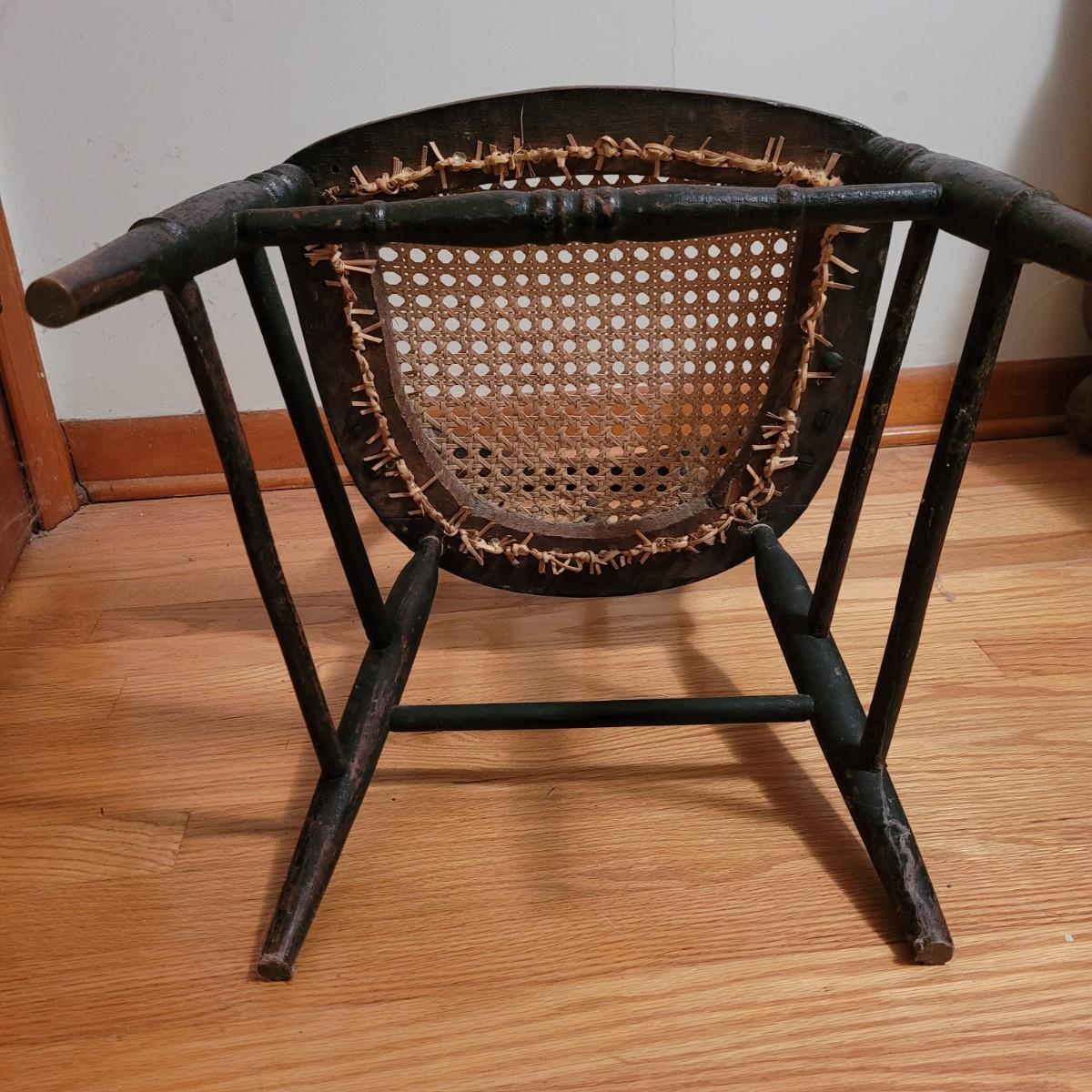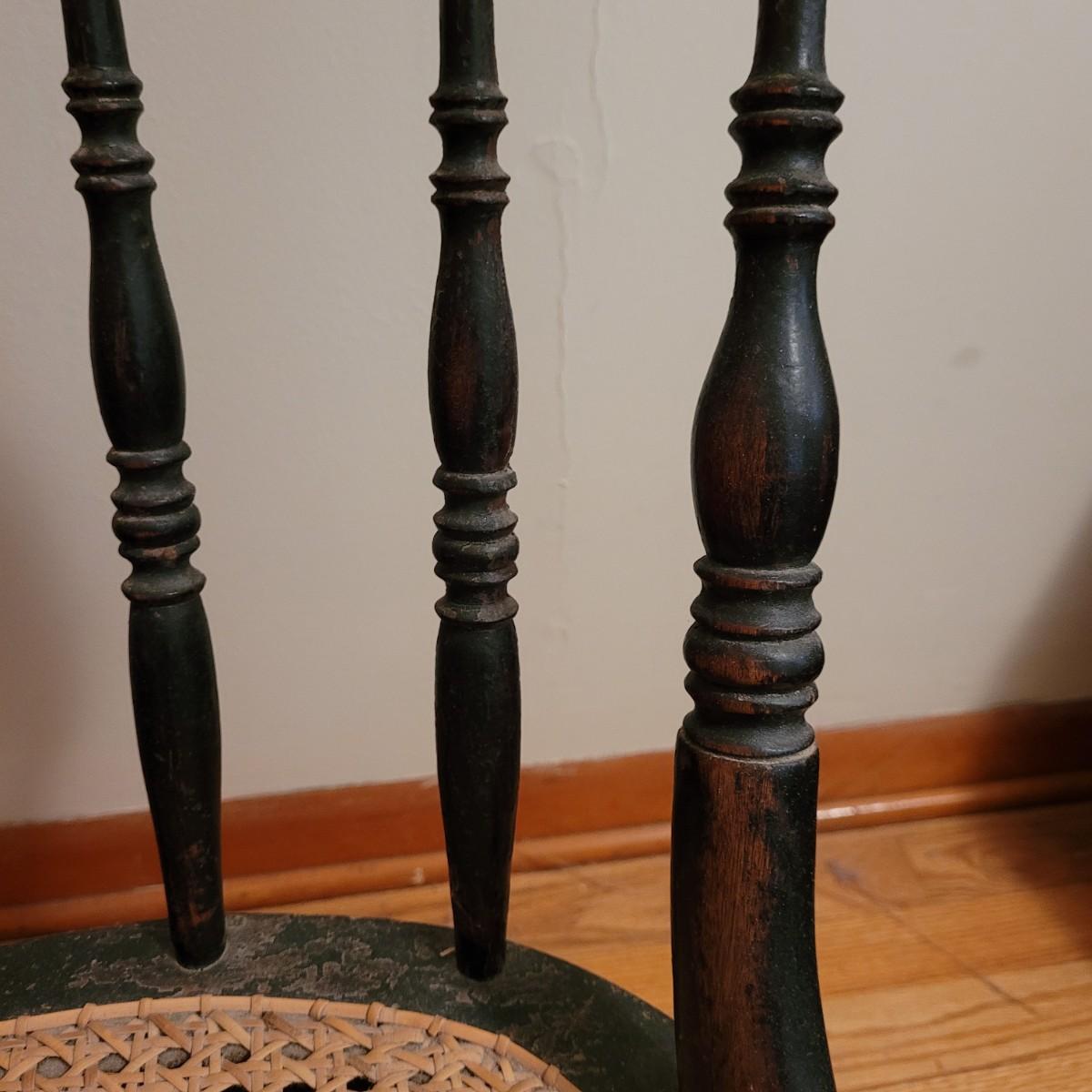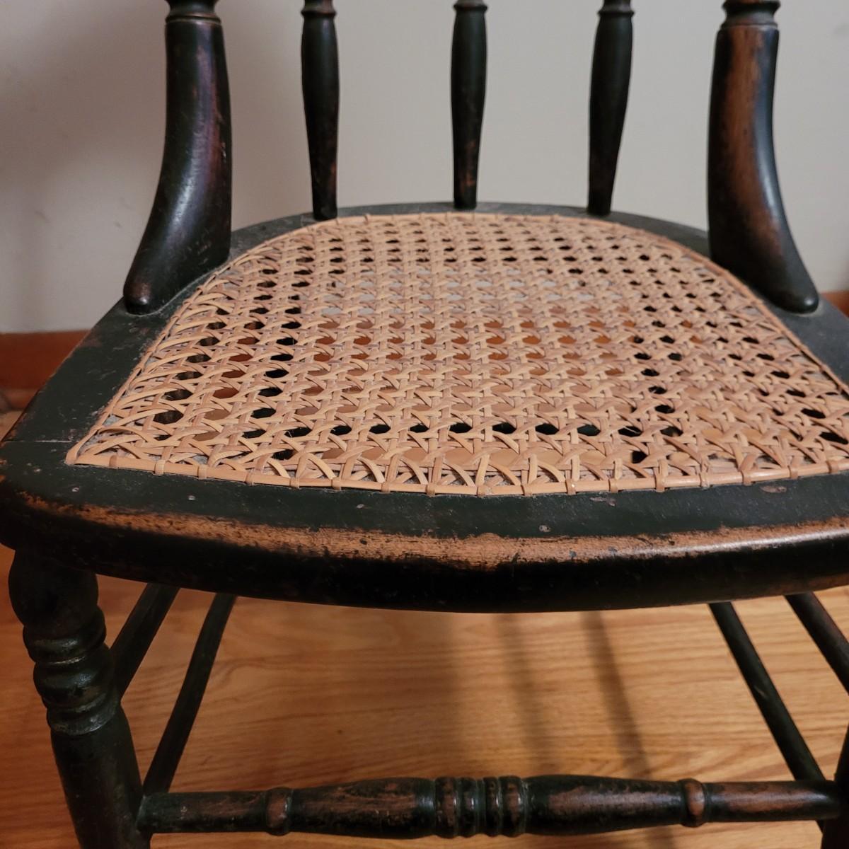 A vintage painted wooden children's chair in good condition with some damage and the stain is wearing off. This chair features a woven can seat and painted floral patterns. Measures approximately 16" x 15" x 28" with a seat height of 14.5". Local pickup only