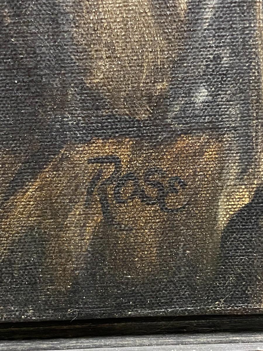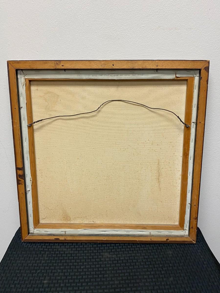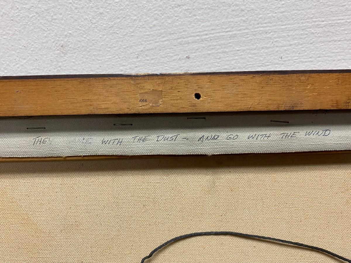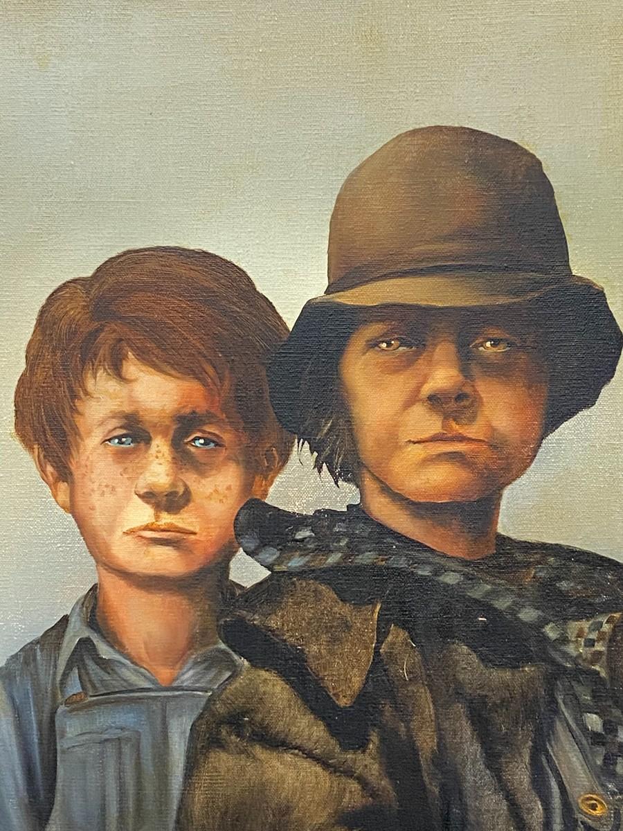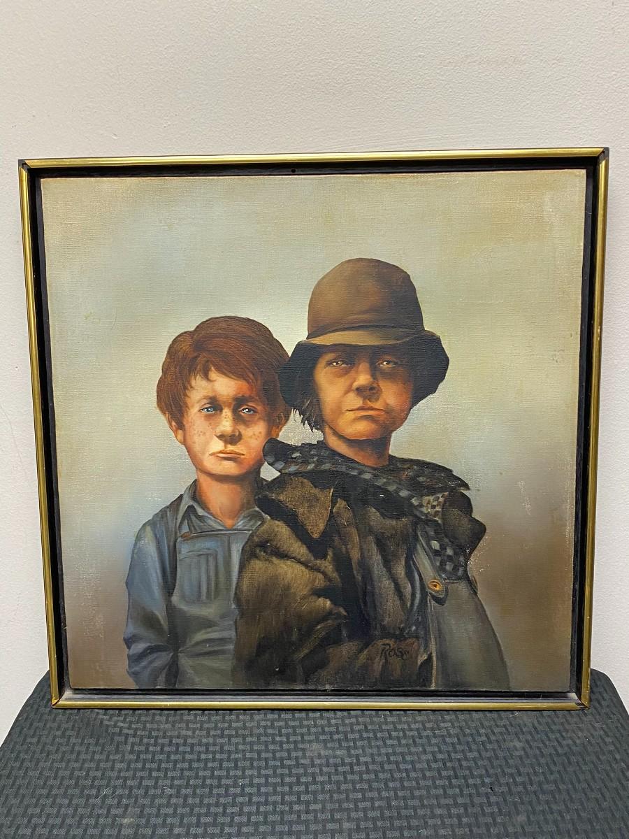 Vintage painting of two weathered looking boys. Signed Rose near the bottom. Along the top on the back, it says "They Came with the Dust - And Go with the Wind". About 22" sq.