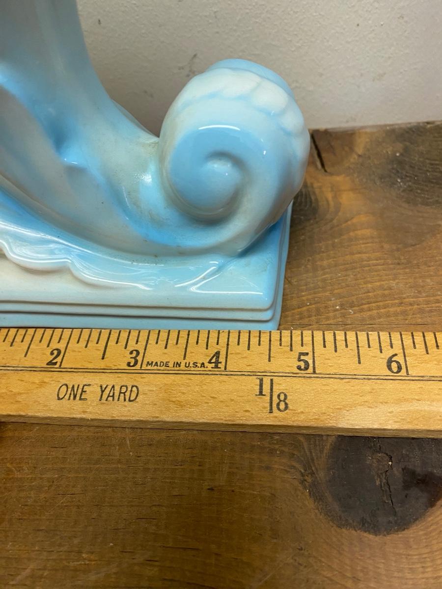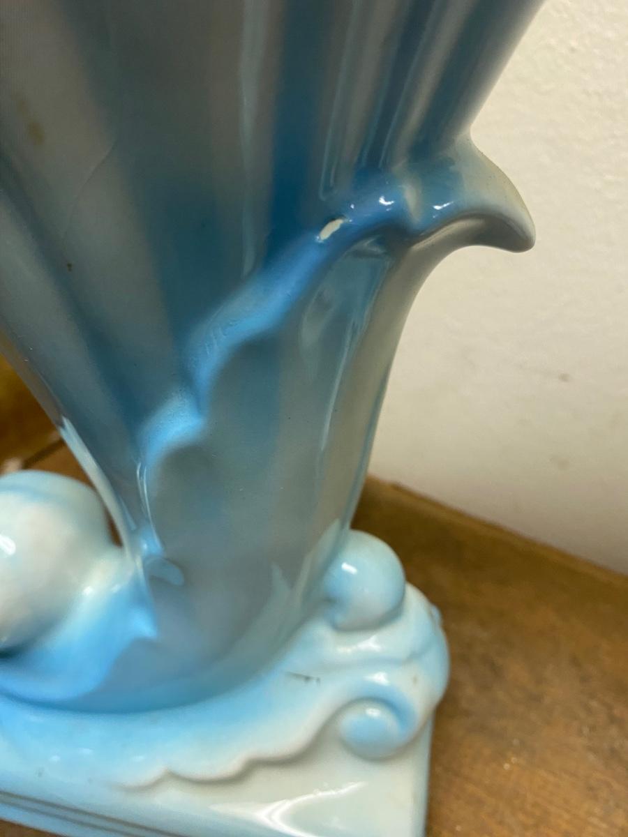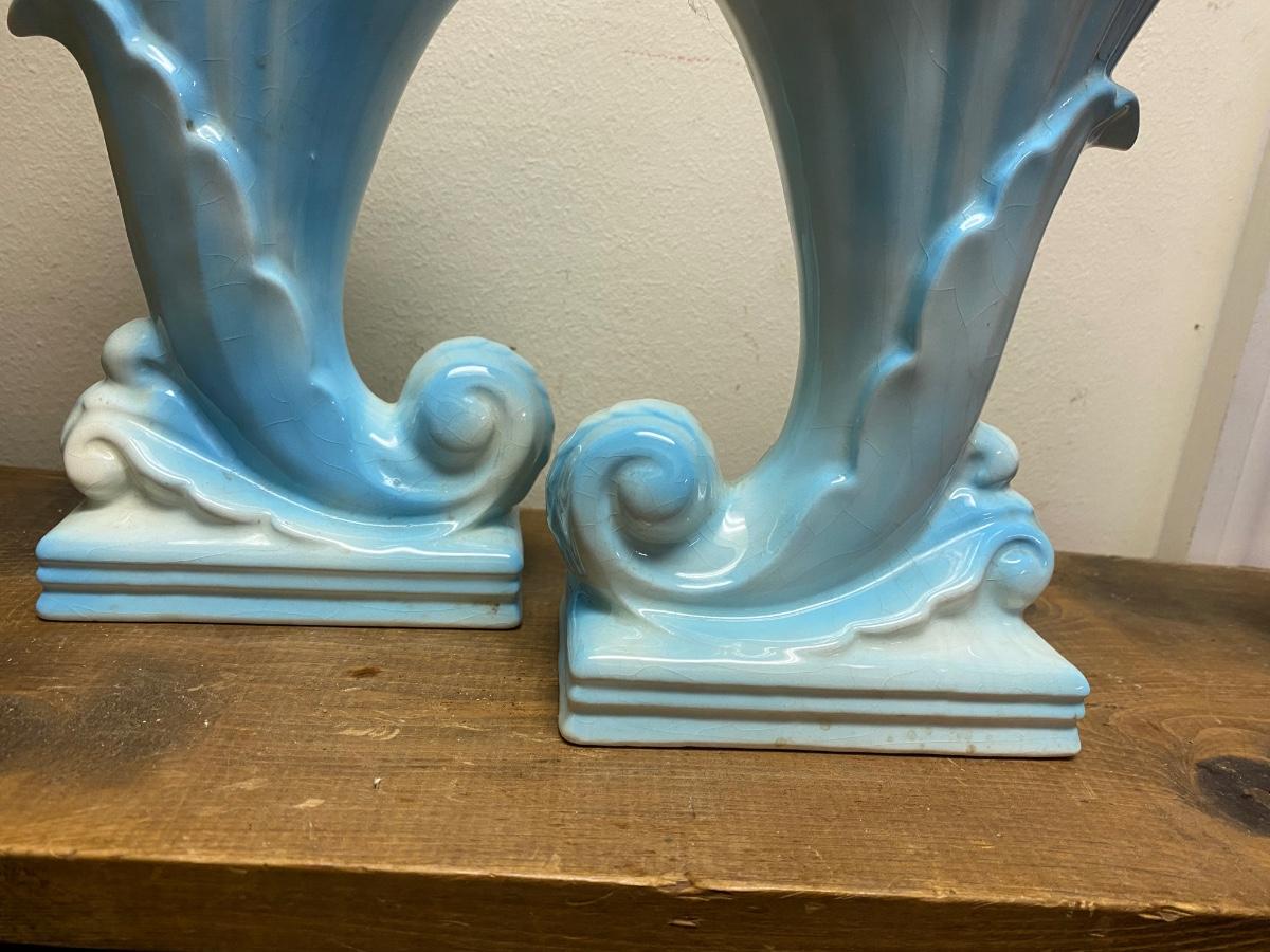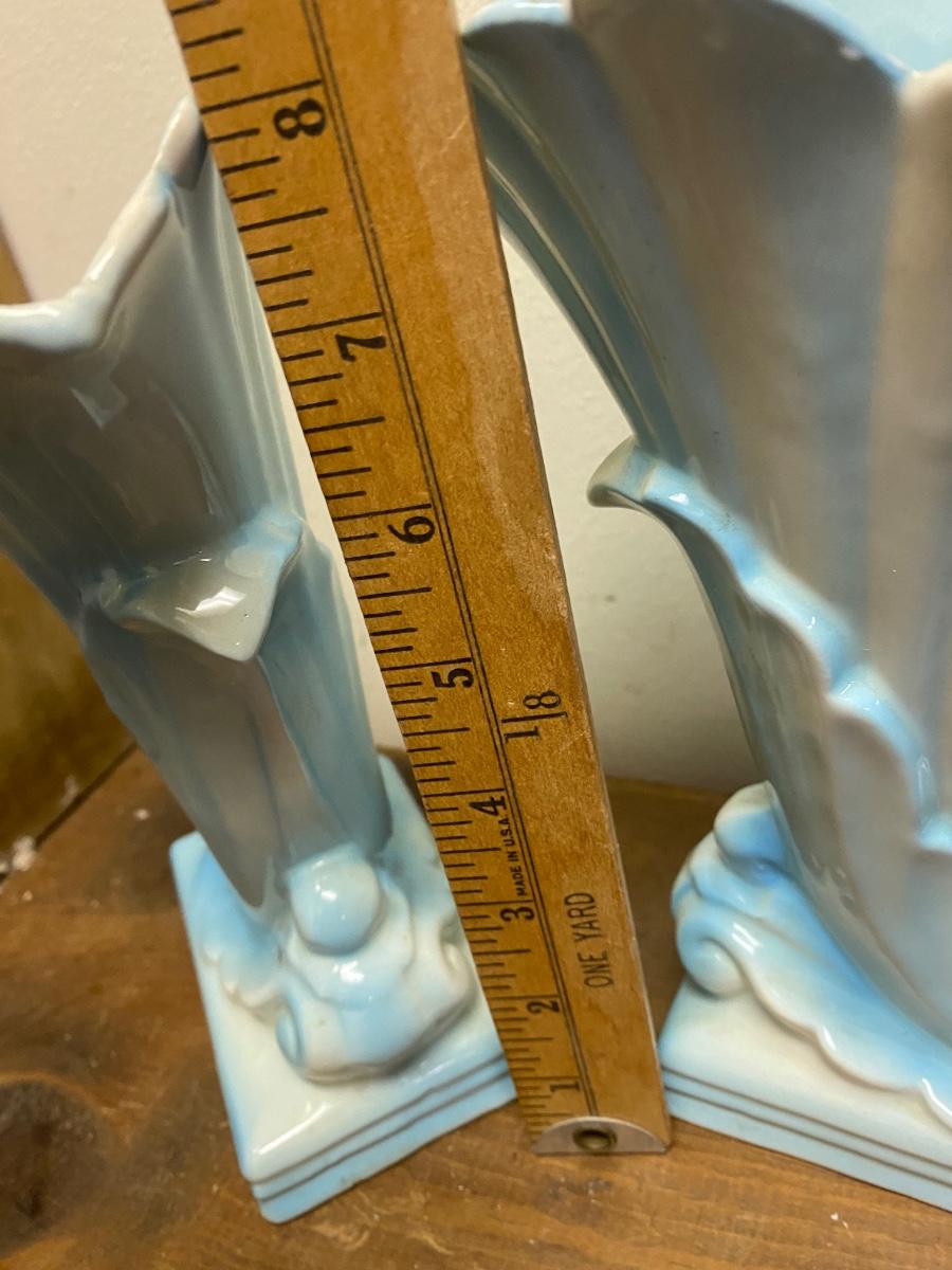 2 ceramic vases, one has small chip as shown in photo. No mark on bottom. Measures 8" high. Lovely set.
