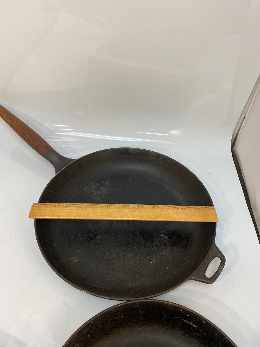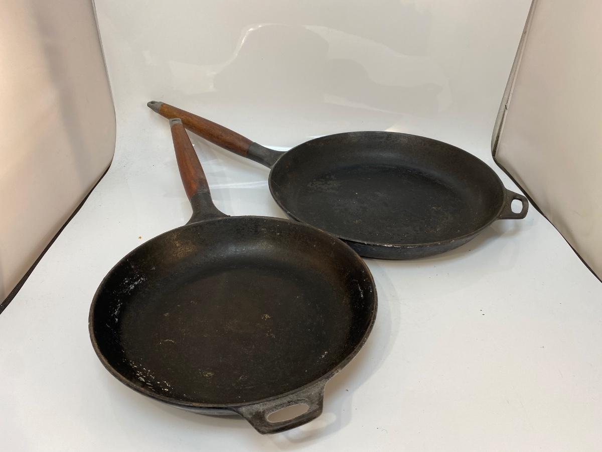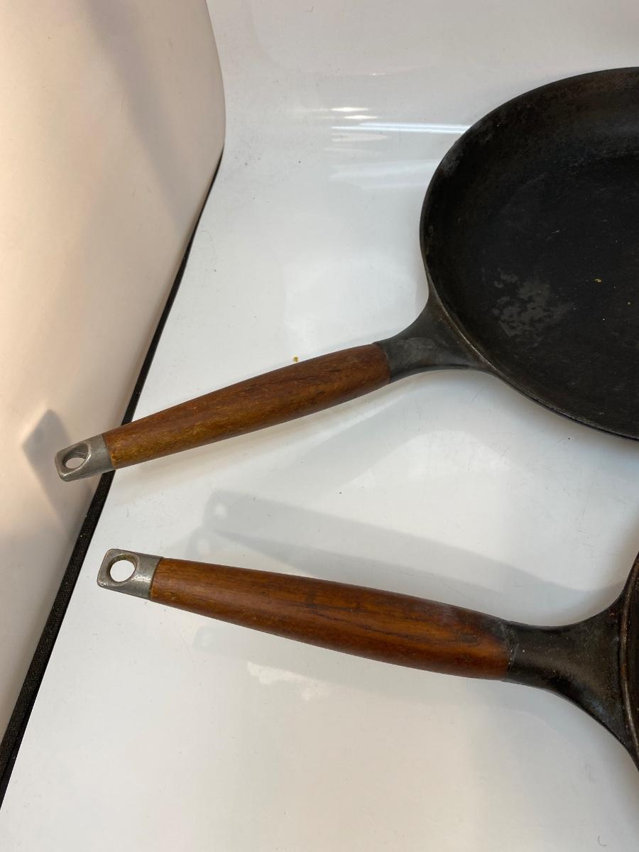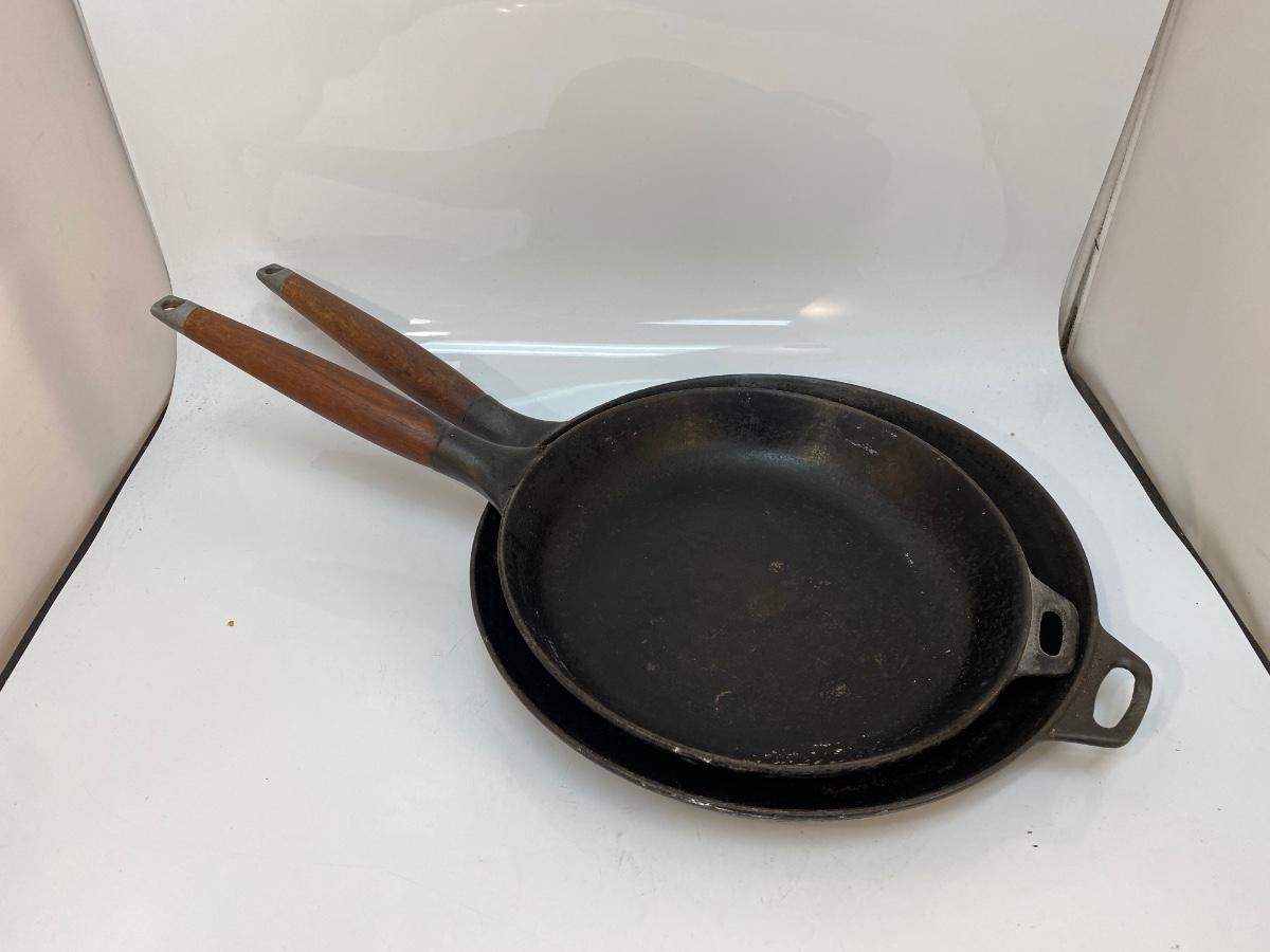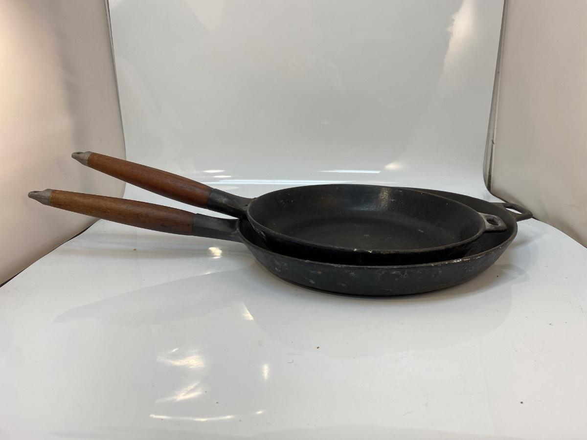 Vintage Pair COPCO Wood Handled Cast Iron Frying Pan Skillets 10" 12"