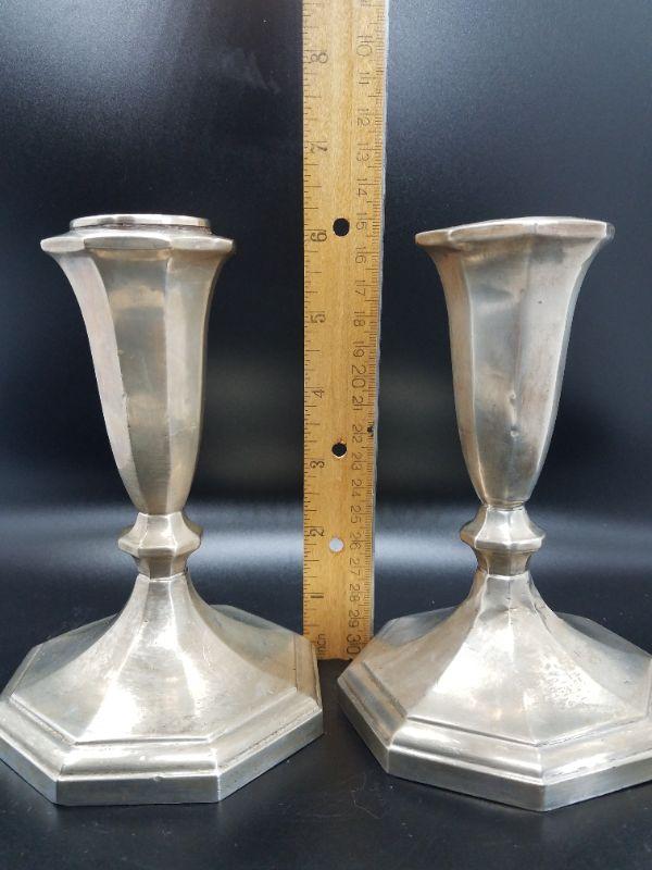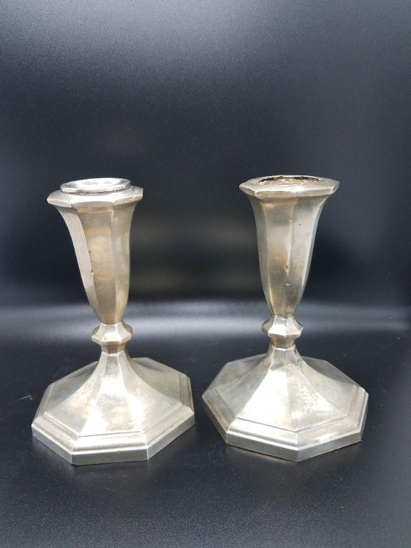 1 candlestick is in good vintage condition, the second one is missing the top cup and some twisting in the sterling. still great for decor and use with peg candle sconces.