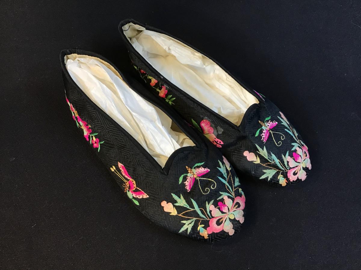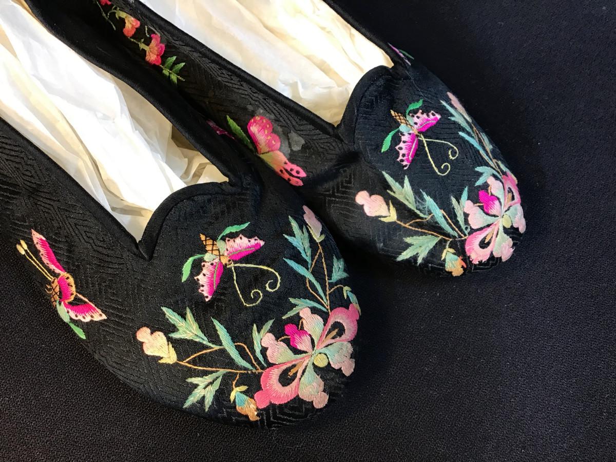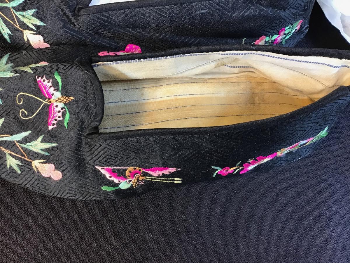 DESCRIPTION: This pair of black silk ladies slippers are worked over-all with embroidered butterflies and flowers and lined in white & blue ticking material. These slippers have been lightly worn.