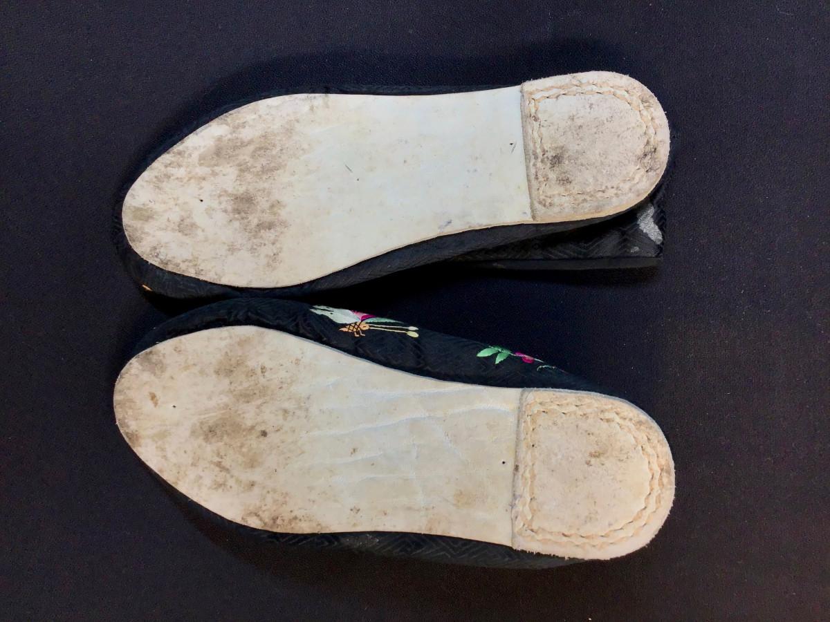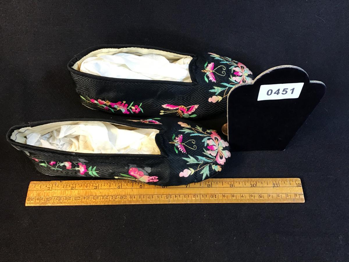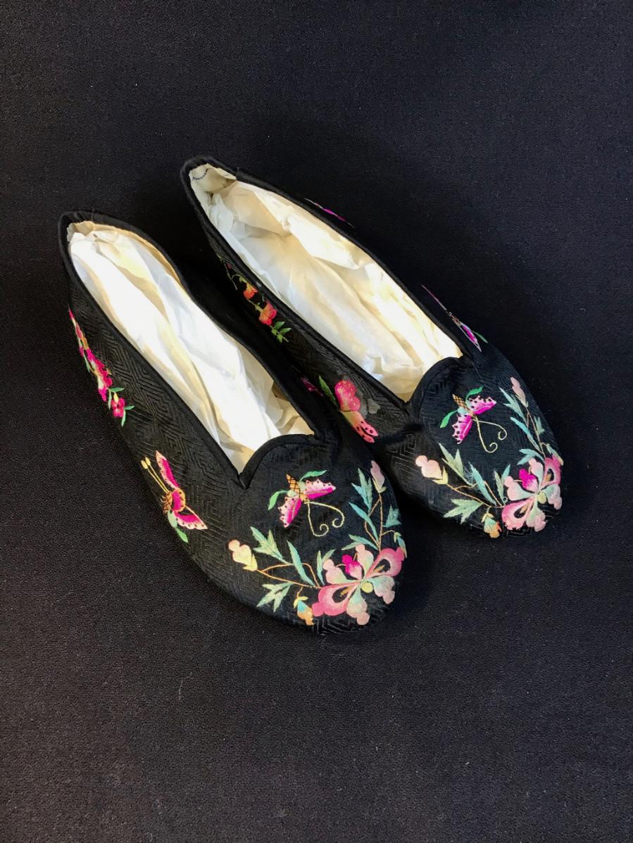 DESCRIPTION: This pair of black silk ladies slippers are worked over-all with embroidered butterflies and flowers and lined in white & blue ticking material. These slippers have been lightly worn.