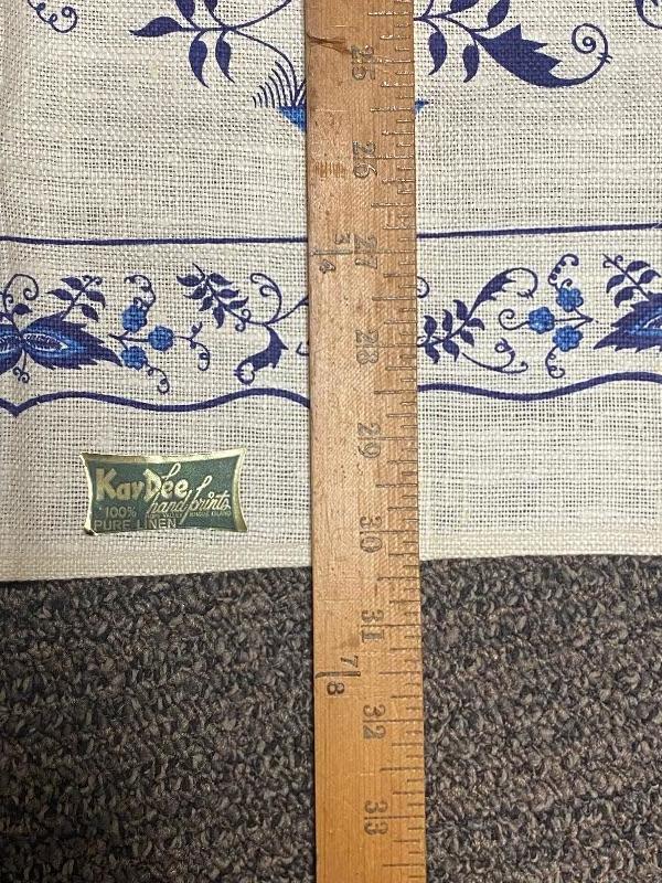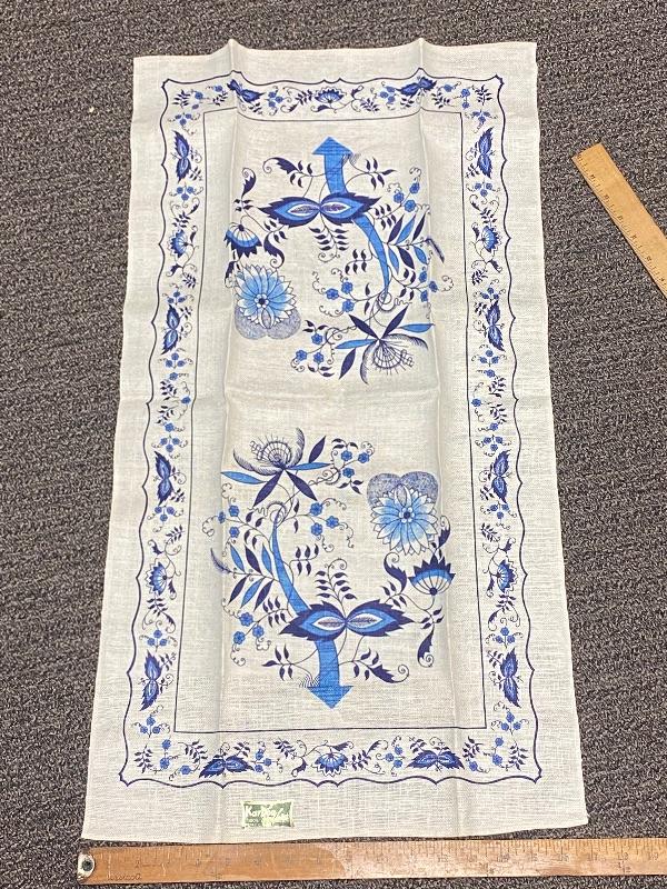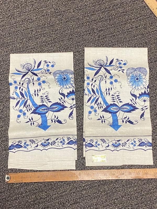 Beautiful vintage tea towel set. Floral pattern in shades of blue. Look unused. Heavy creases. One still has the original sticker tag on it. No spots, may be slight discoloration along creases from age & storage. Roughly 17"x30".