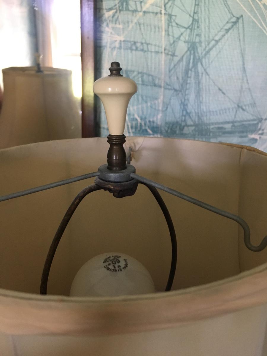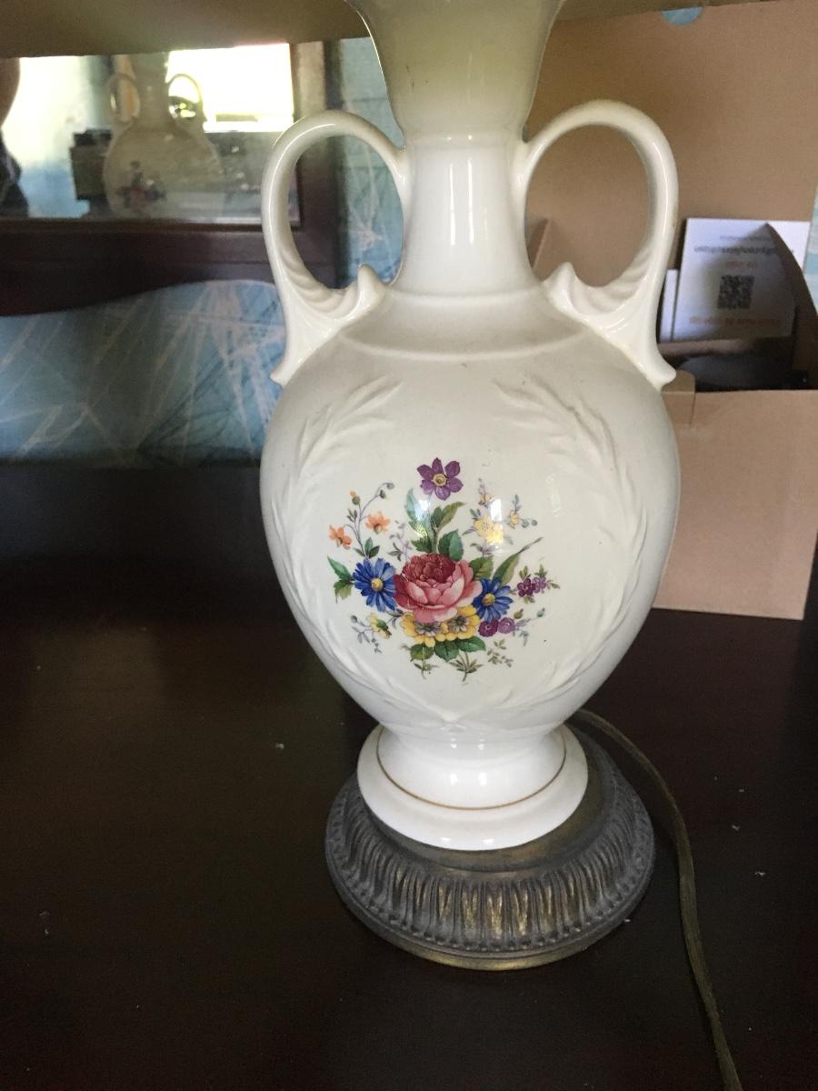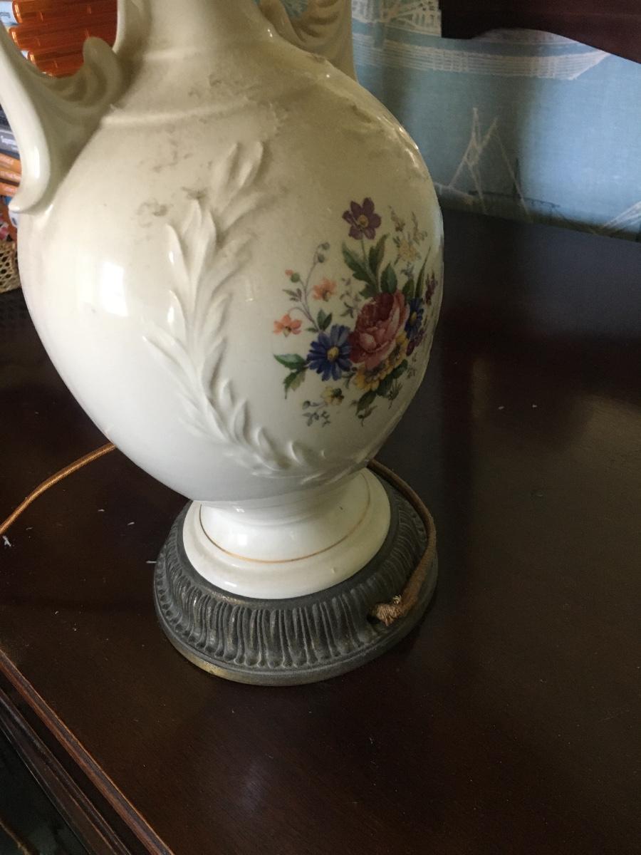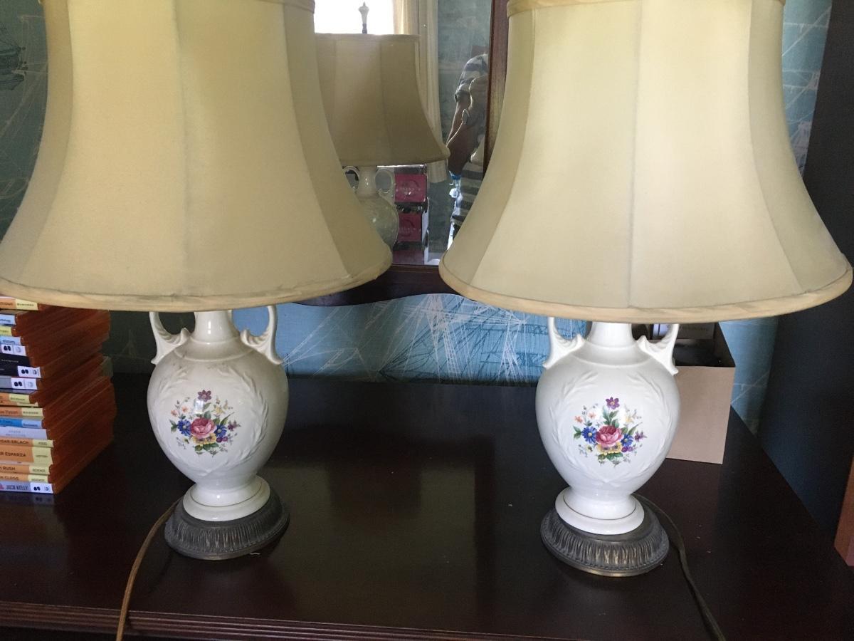 Pair of floral decorated lamps, urn shaped. One will need to be rewired. Shades in fair condition.