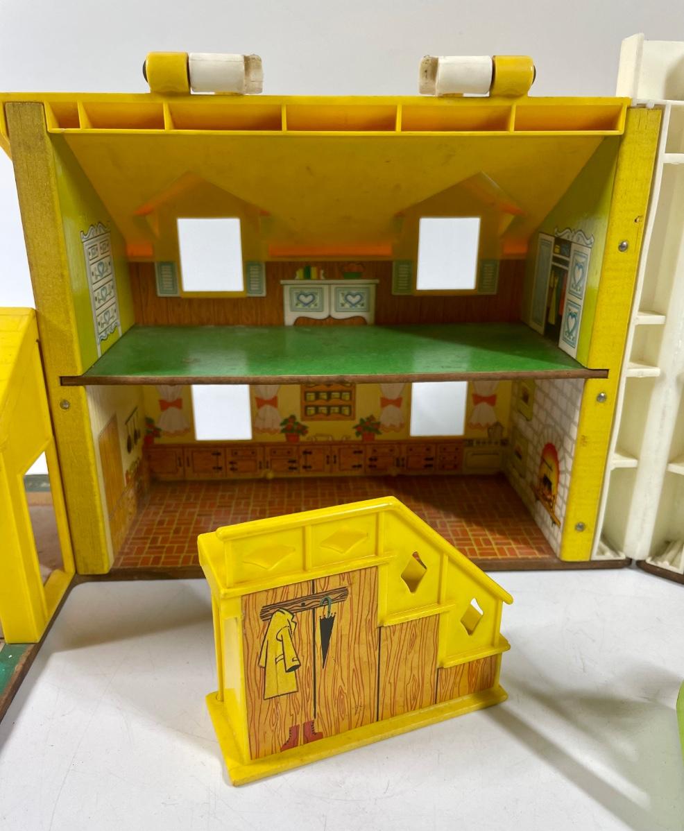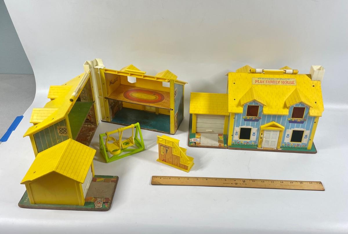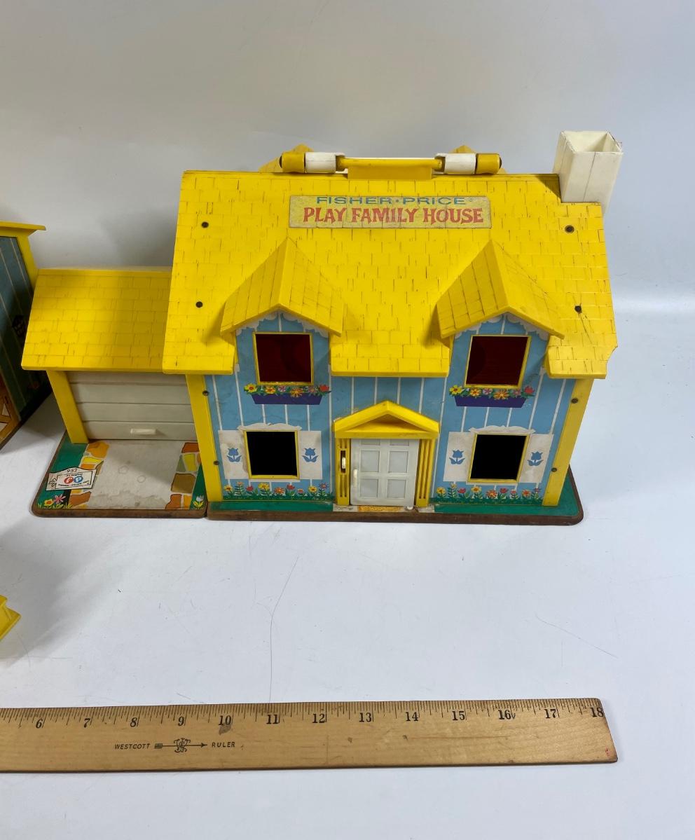 Vintage Pair of Fisher Price play Family Houses #952. Some accessories included, see photos. Well played with, some wear and 2 house is split along the chimney.