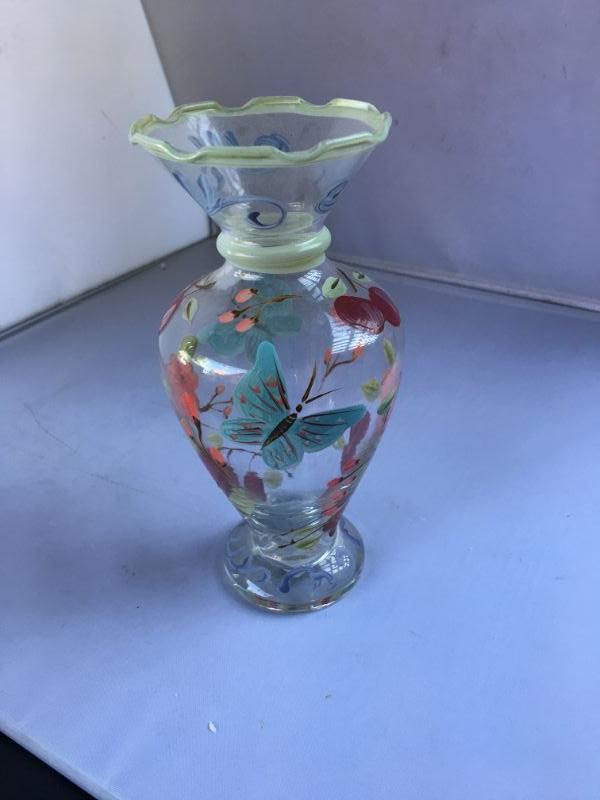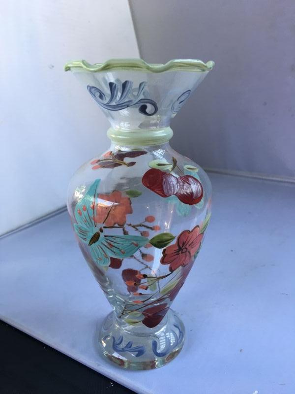 Beautiful design, vivacious colors on both vases. The taller one measures 9" X 3.5" and the ruffled smaller one measures 6.5" X 4.5".
